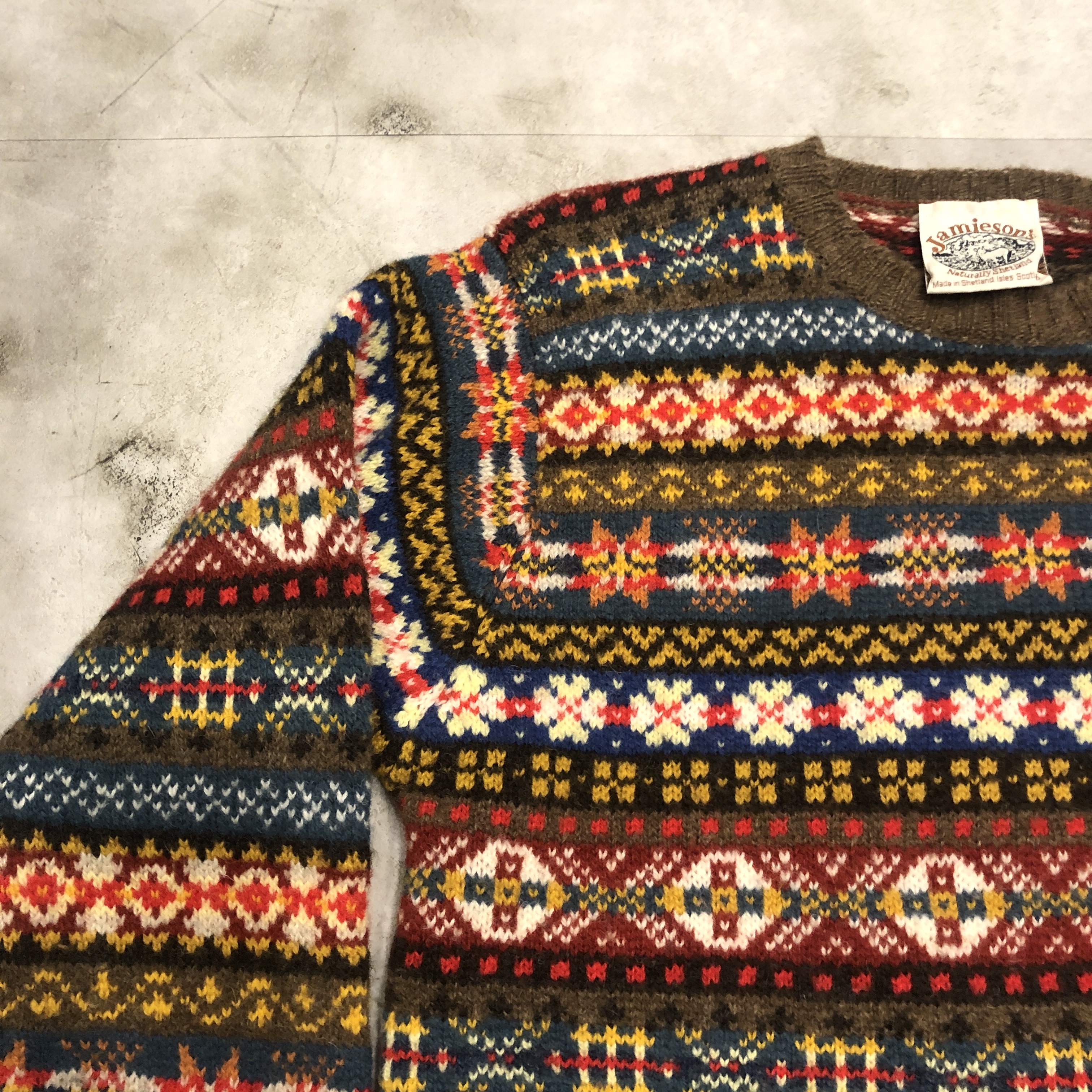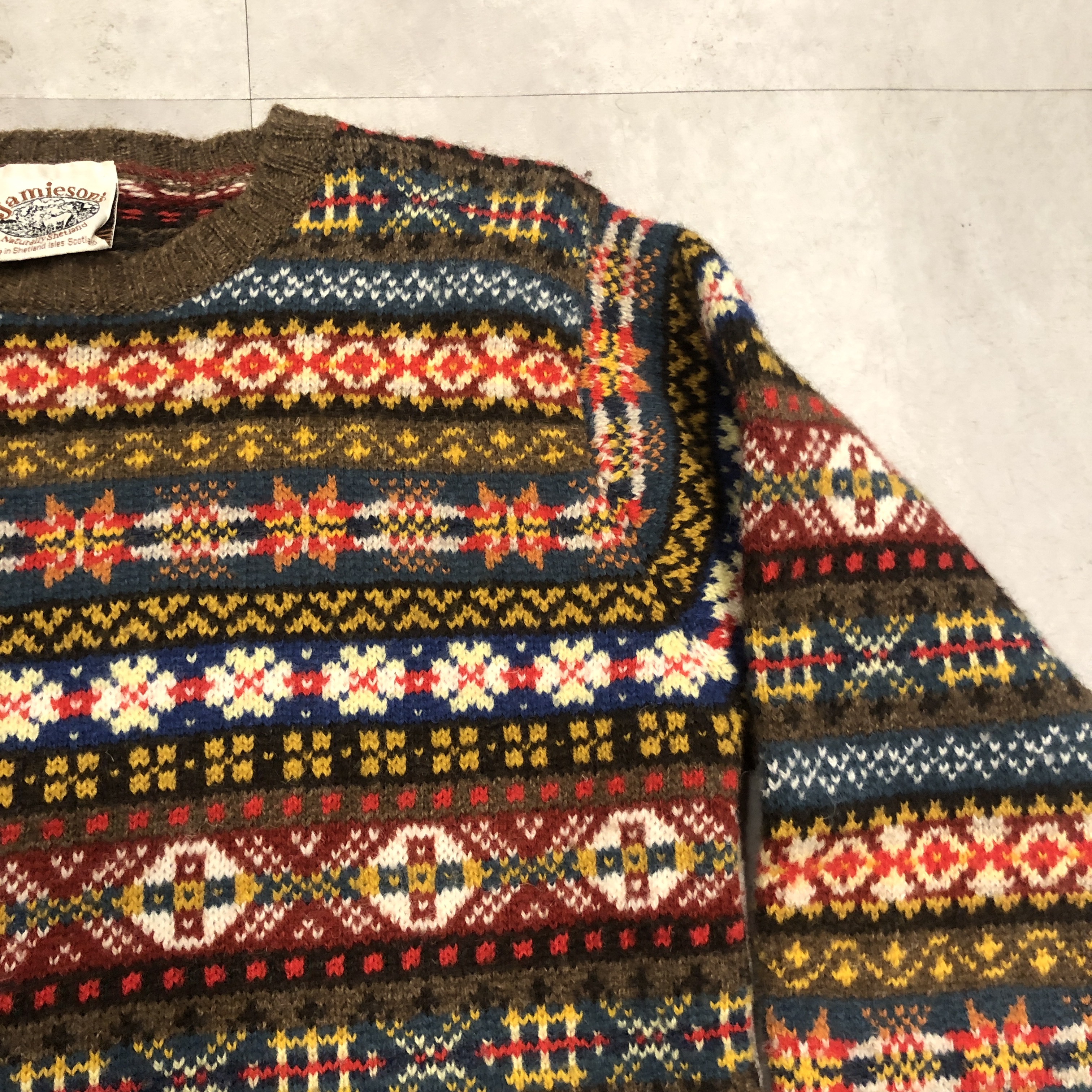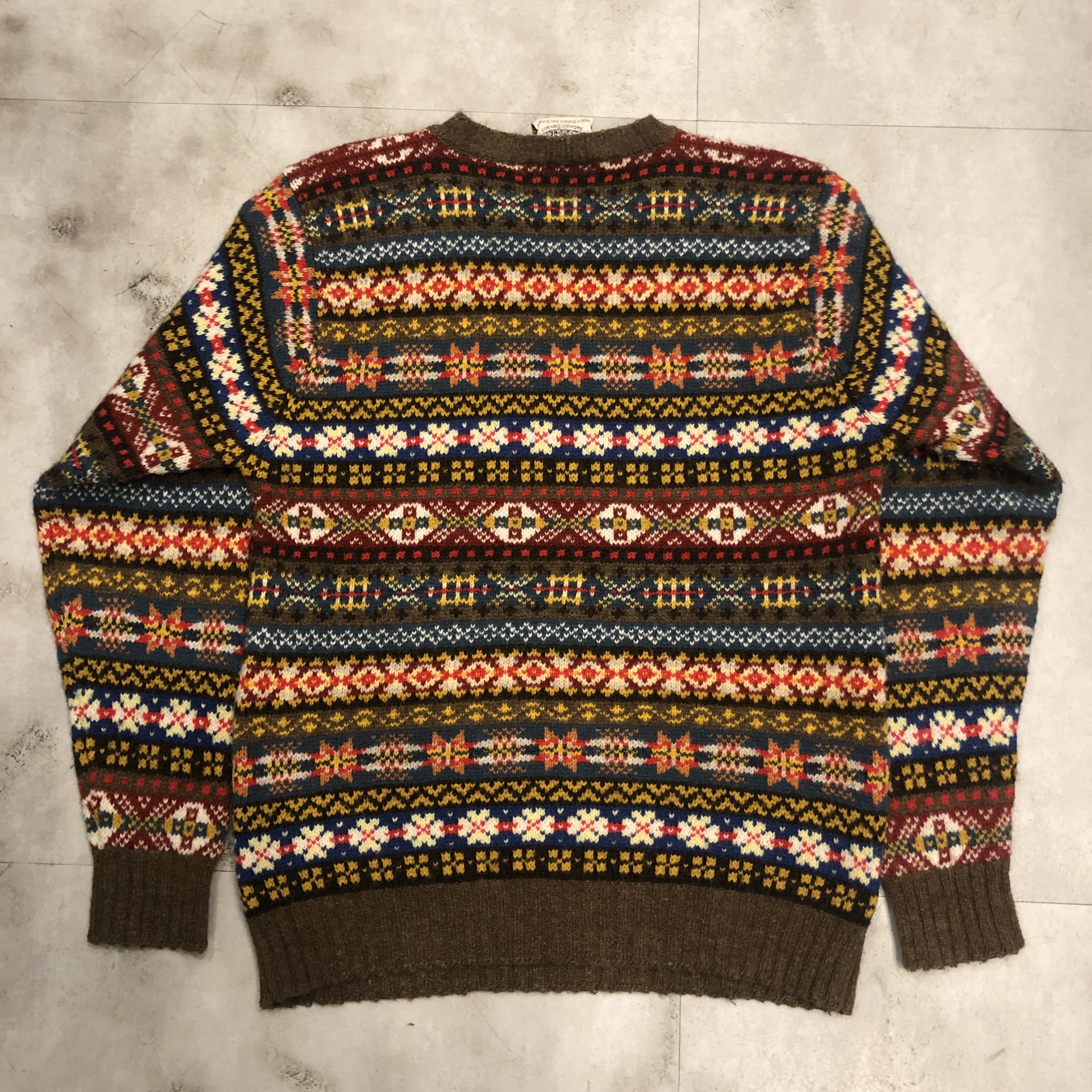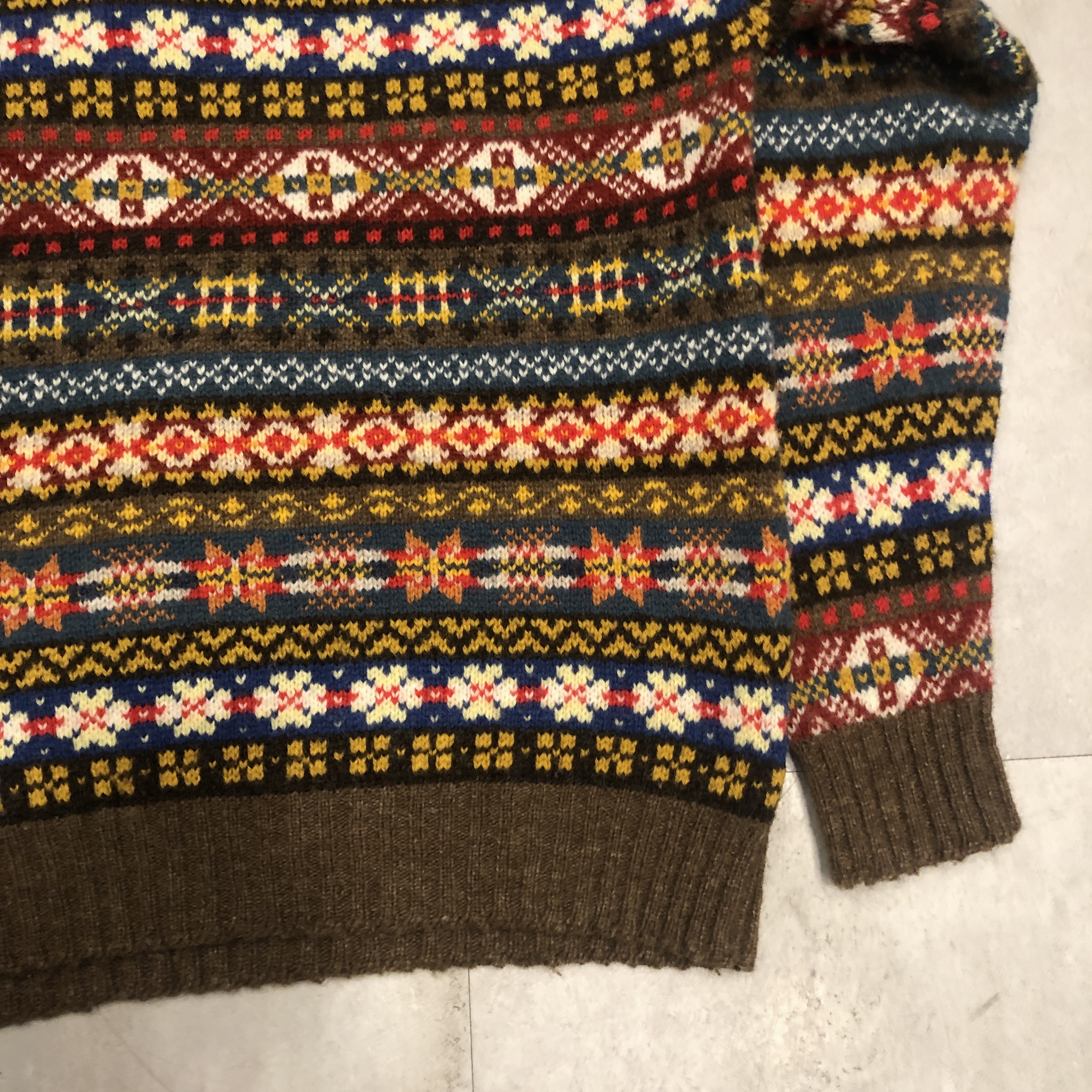 柄は伝統的なフェアアイルパターンで、ブラウンをベースにブルーやレッド、イエローなどの強いトーンを絶妙に配色。クラシックでありながらどこかモダンな印象を漂わせます。首元から肩にかけてのヨーク切り替えがリズムを生み、リブのテンションも程よく、着用時のバランスが秀逸です。