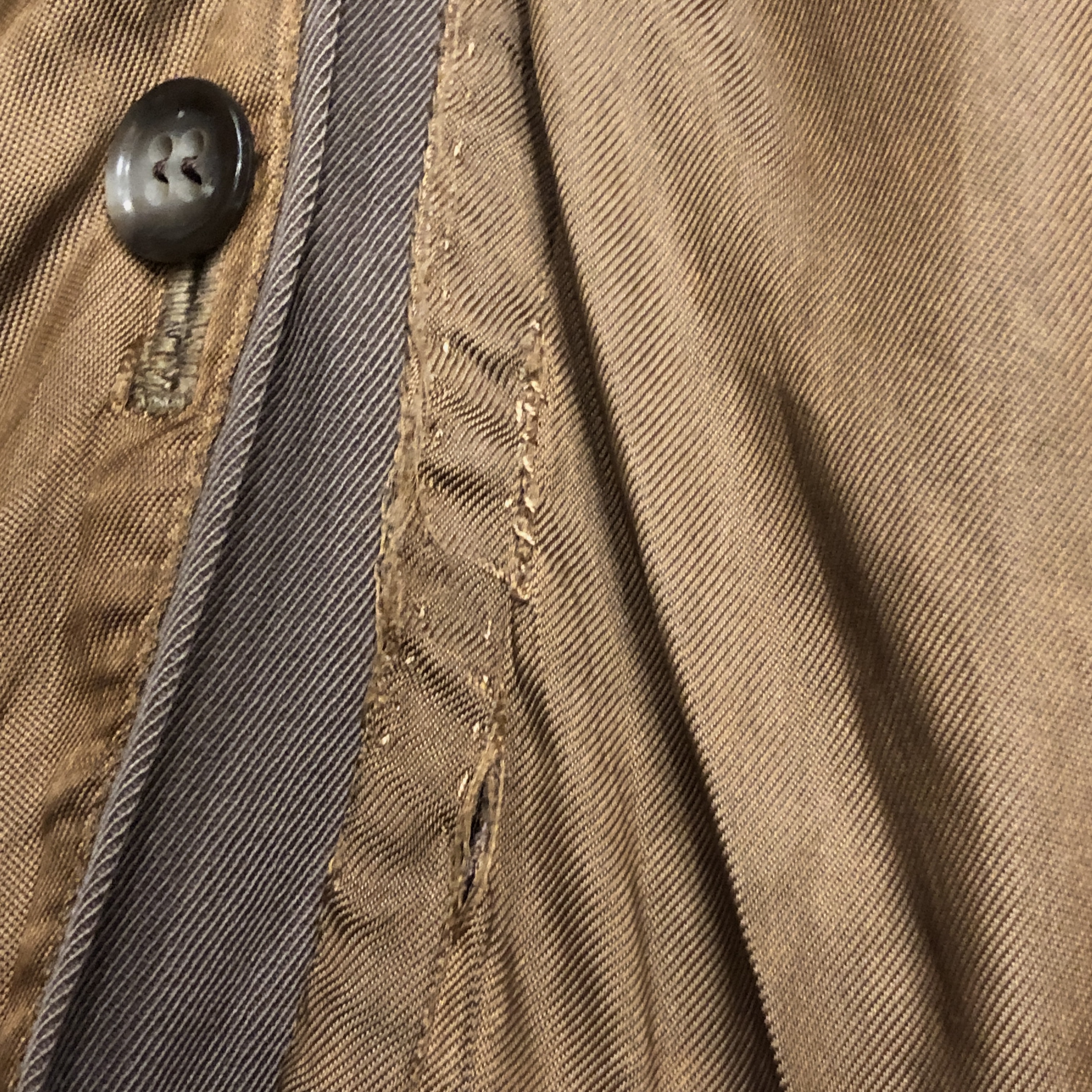 - 年代相応の着用感、背面の右脇付近の汚れやスレ、内側プリーツ部分のリペア跡、ポケット縁や襟部分のダメージ等がそれぞれ画像の様にございますが、古着慣れされている方でしたら問題なくお使いいただる範囲です。
