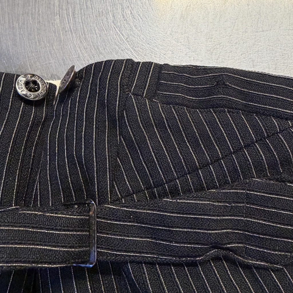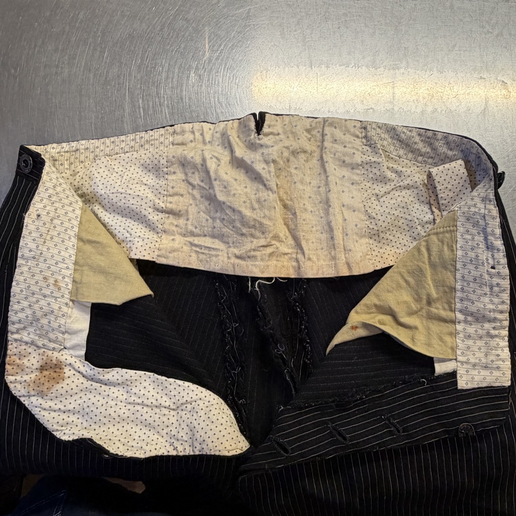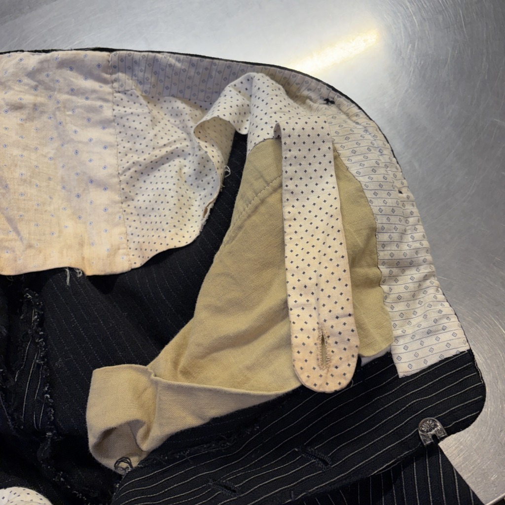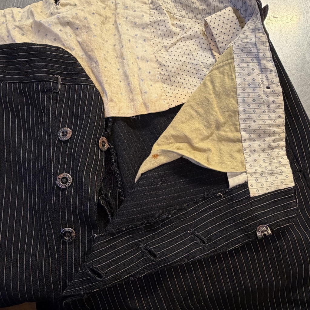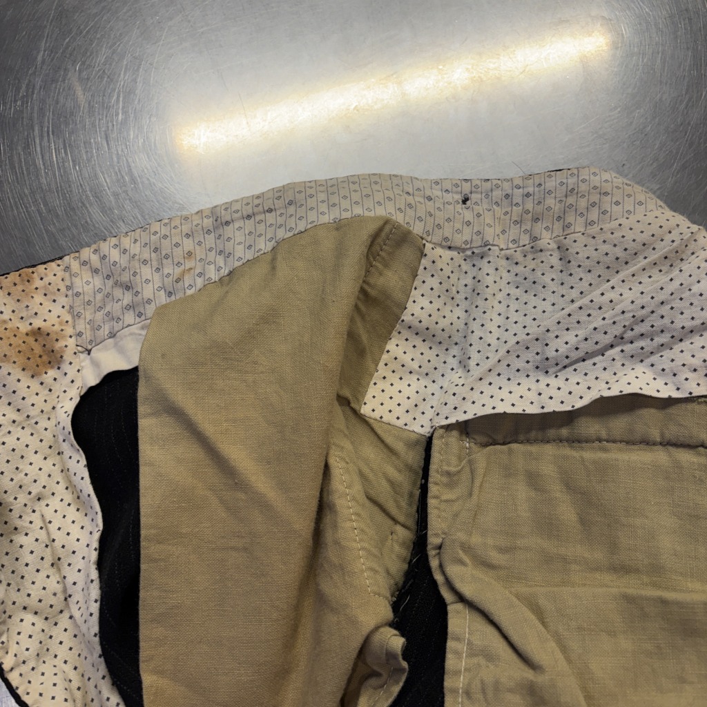 - ダメージや汚れが全体的にあり着用感ございます。ウエストバンドの部分が縫いなおされています。