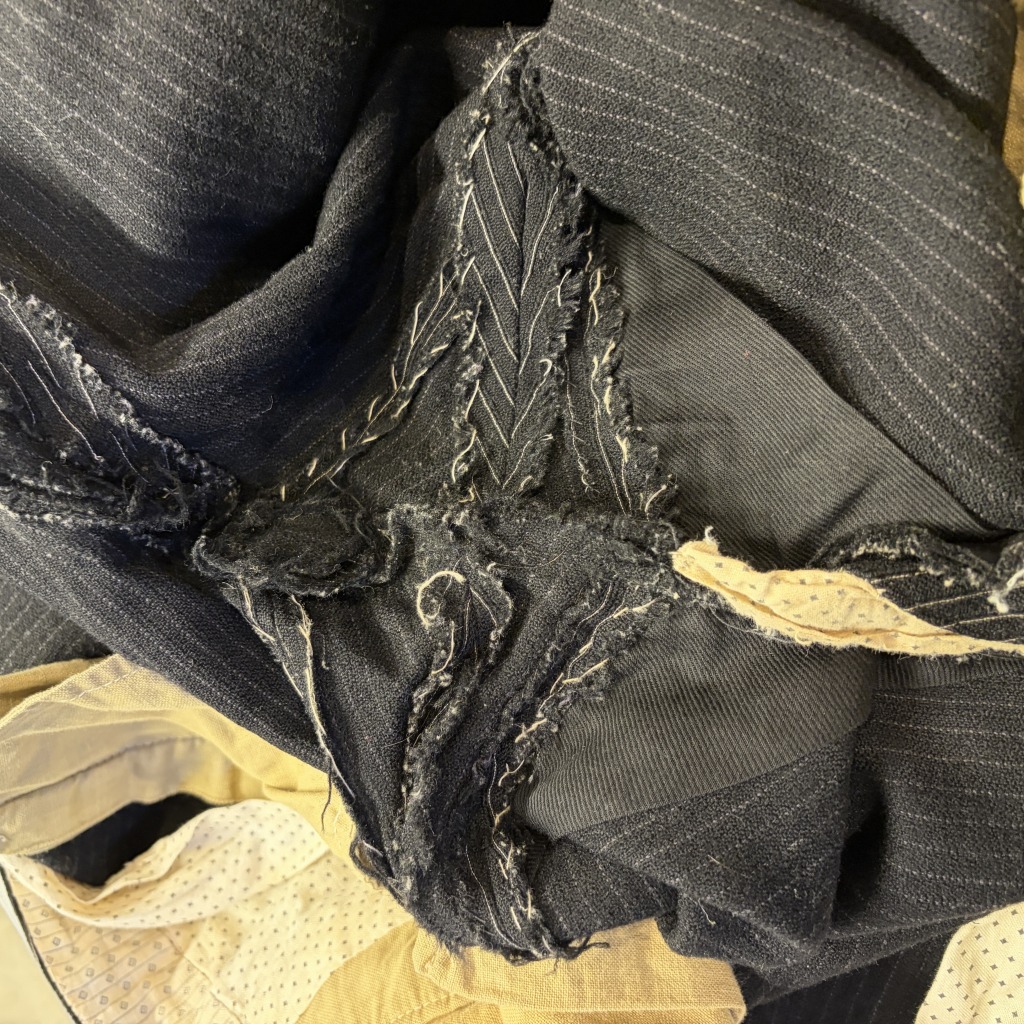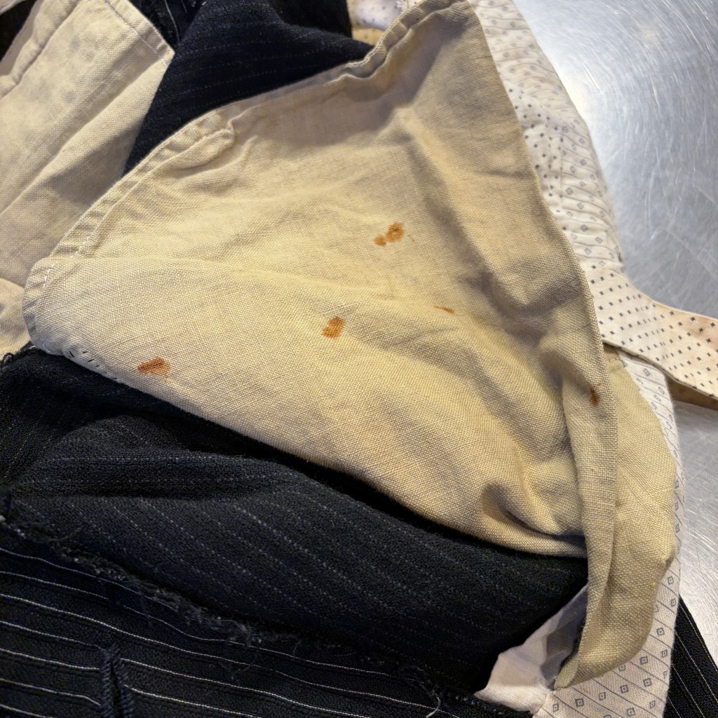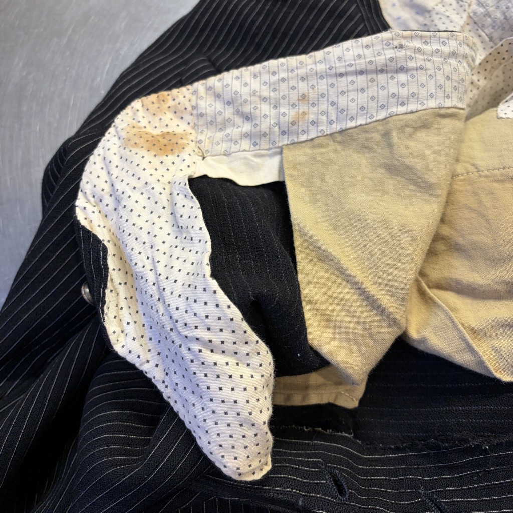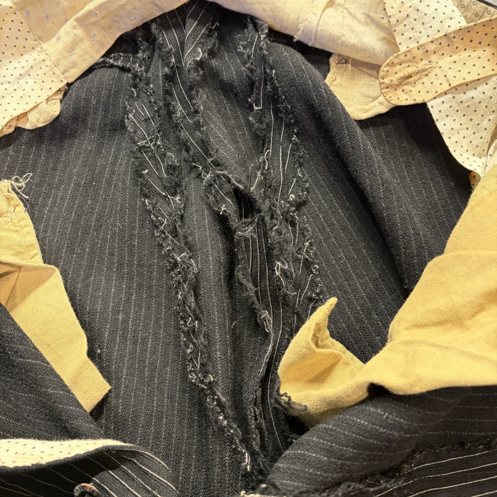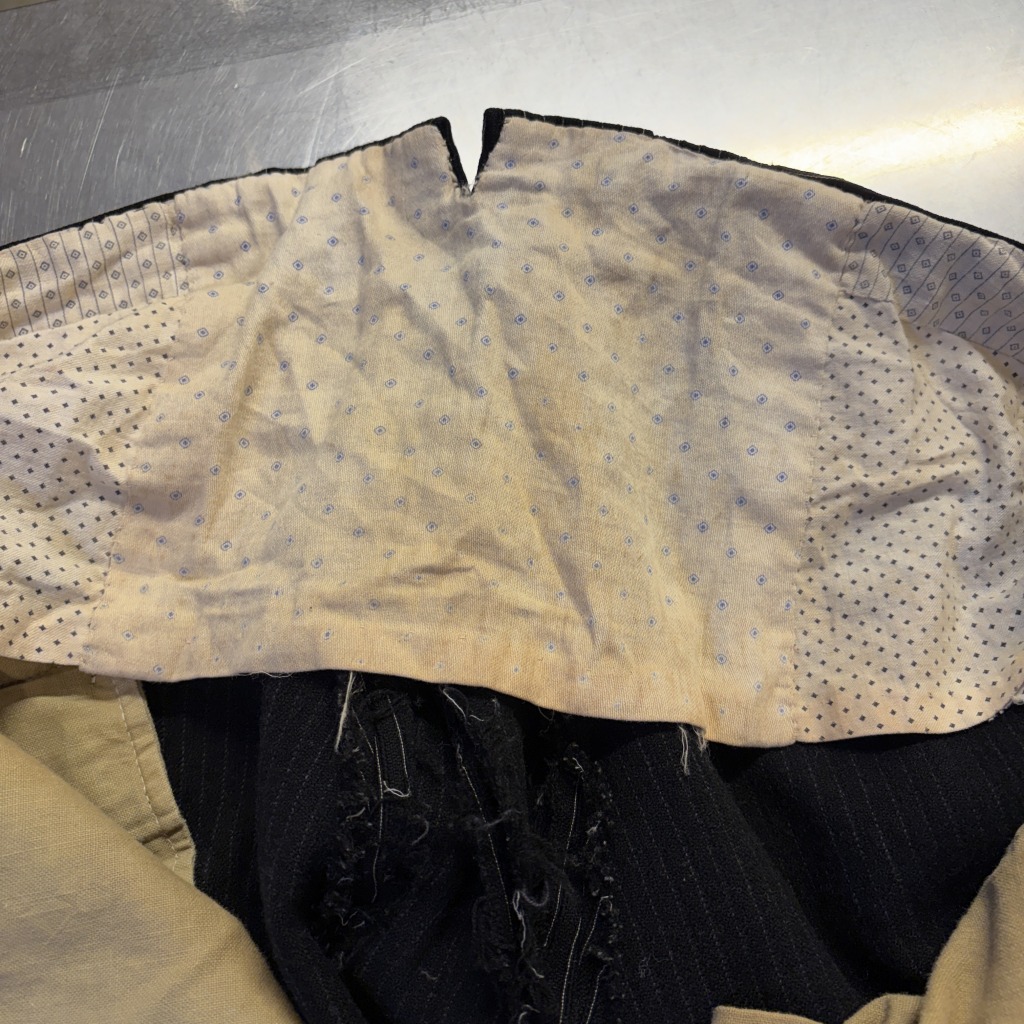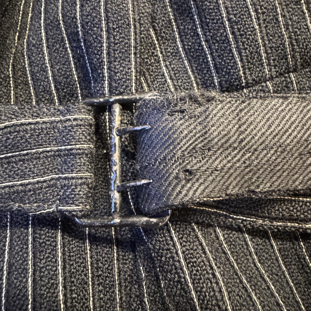 - ダメージや汚れが全体的にあり着用感ございます。ウエストバンドの部分が縫いなおされています。