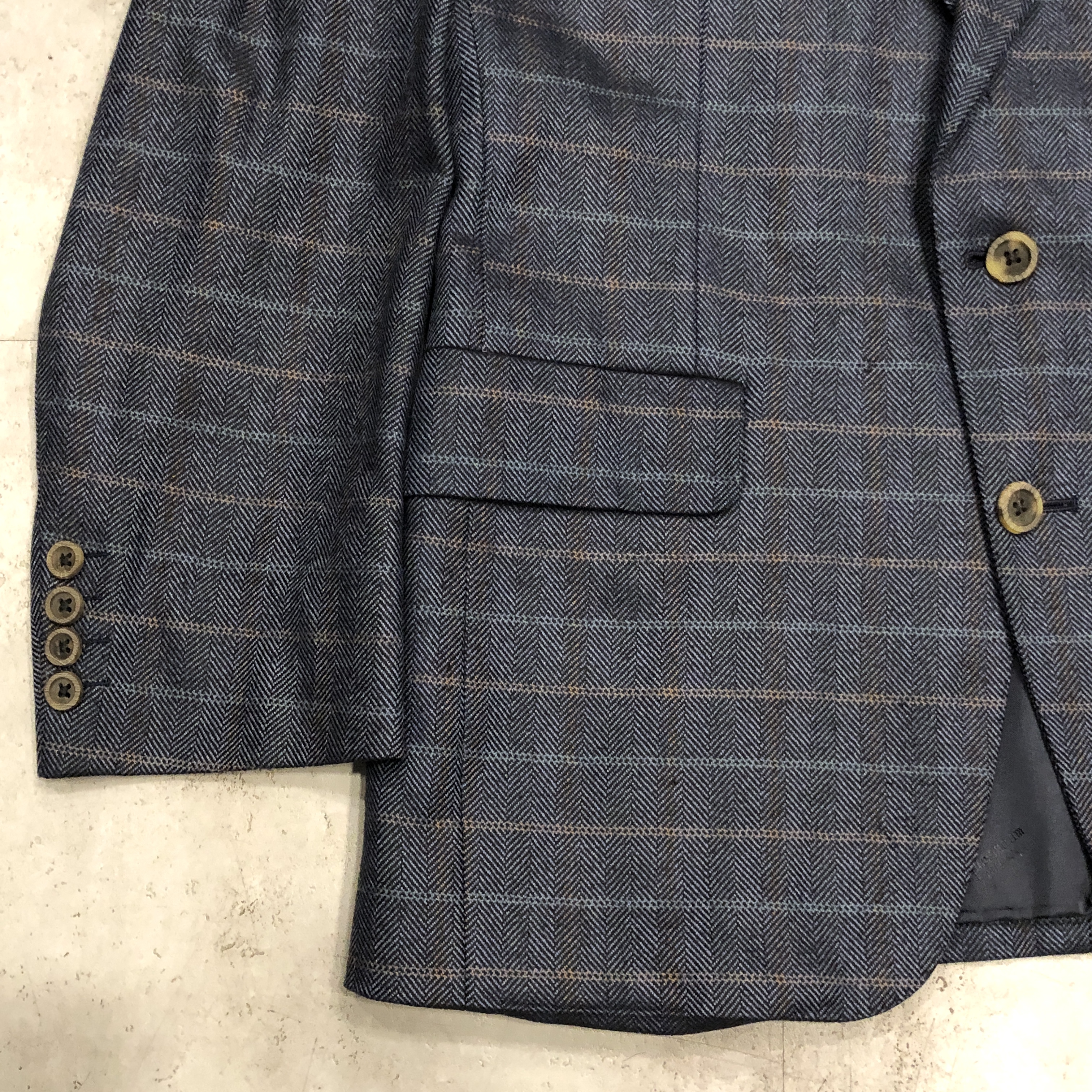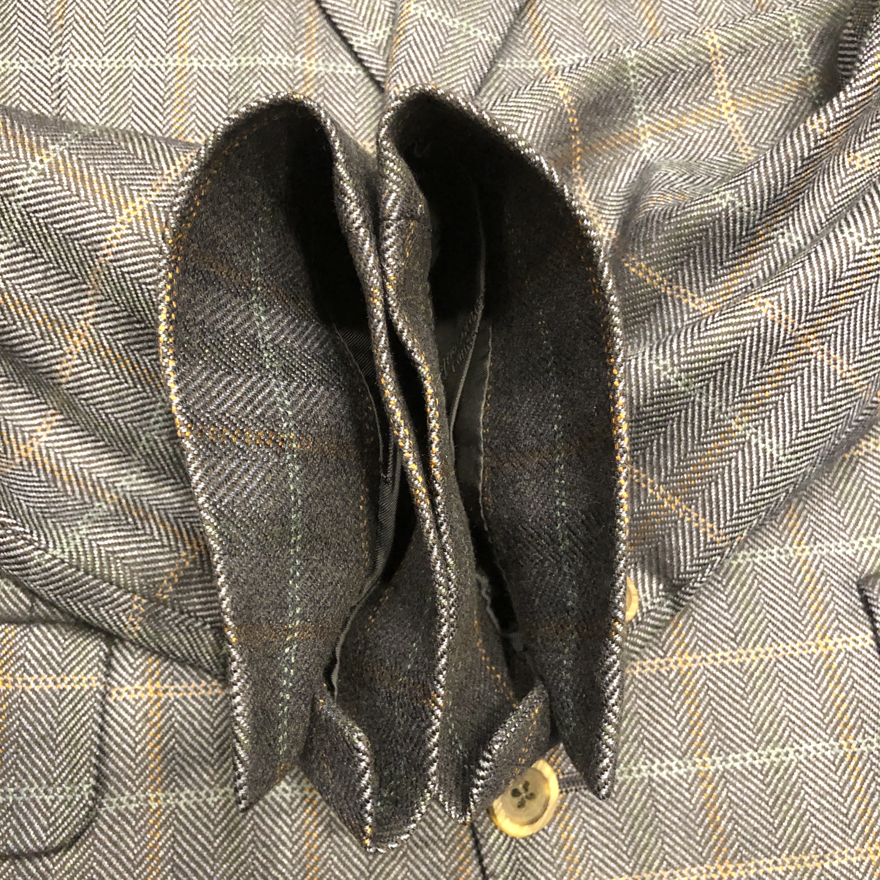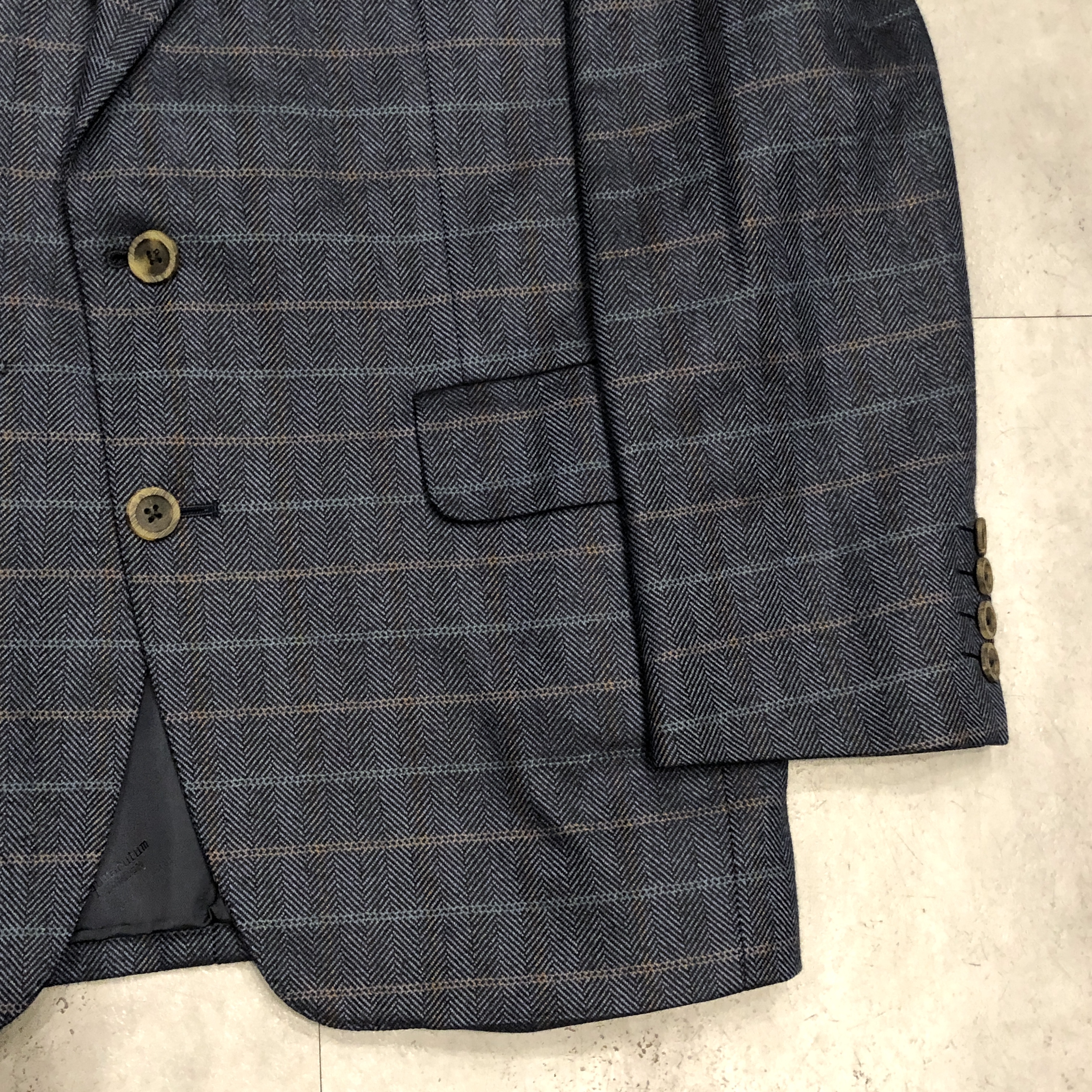 生地はヘリンボーンベースに淡いオーバーペーンが走る正統派。黄金期のサヴィル・ロウを彷彿とさせるボリューム感あるラペルと程よいドレープが、クラシカルかつ気品あるシルエットを描き出します。