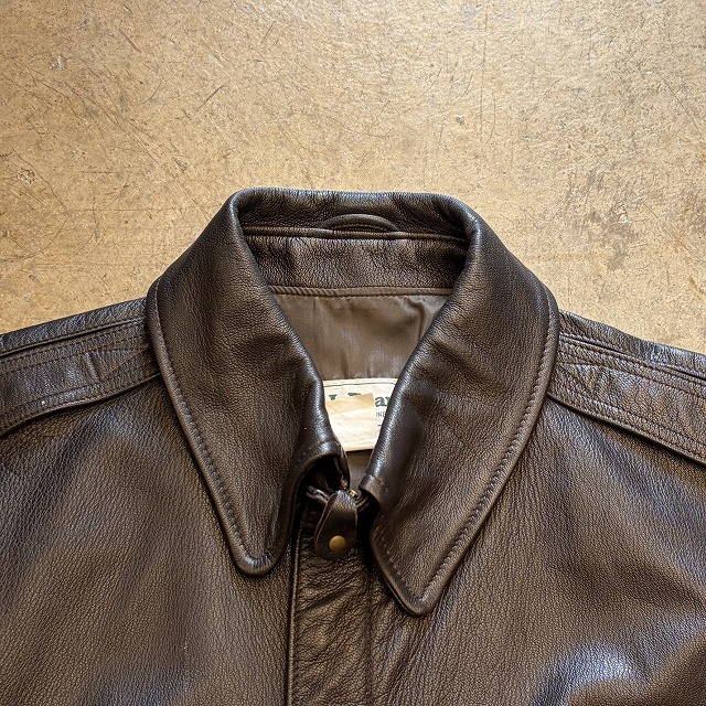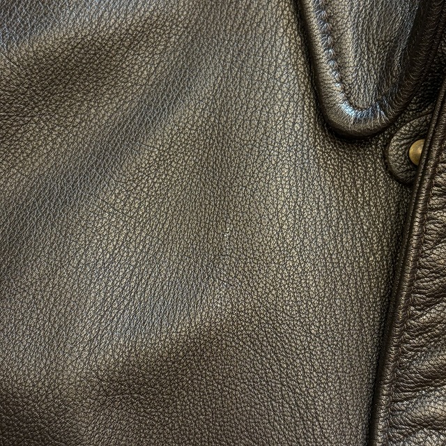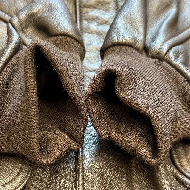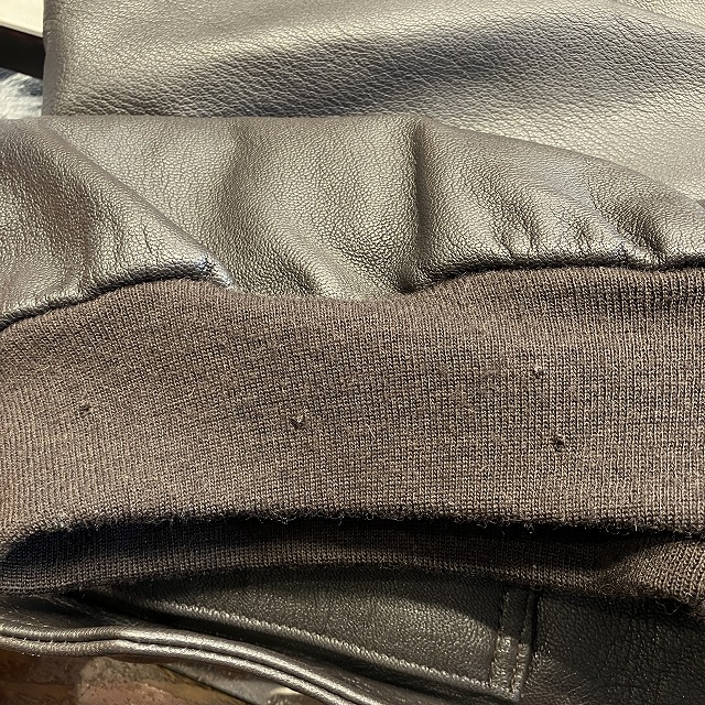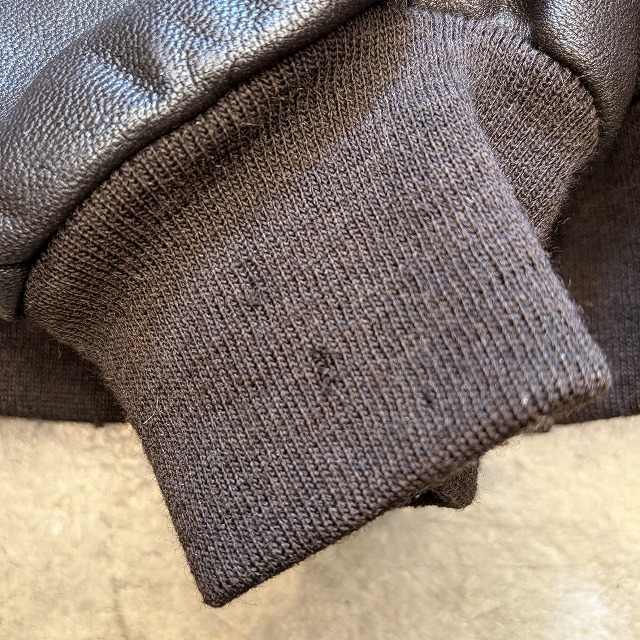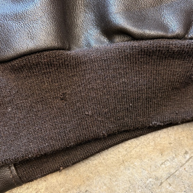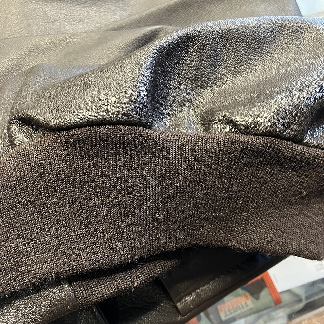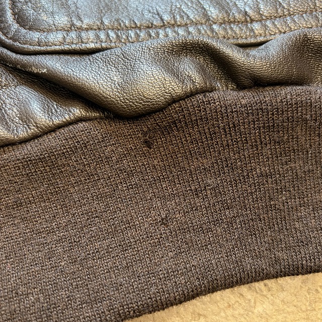 - 所々に小さなペンキ汚れや、レザー特有のスレや小傷がみられます。また、袖や、裾のリブに小さなダメージがみられる箇所がございます。その他、年代相応の着用感ございますが、ユーズド慣れされた方でしたら、まだまだ問題なく着用していただけます。