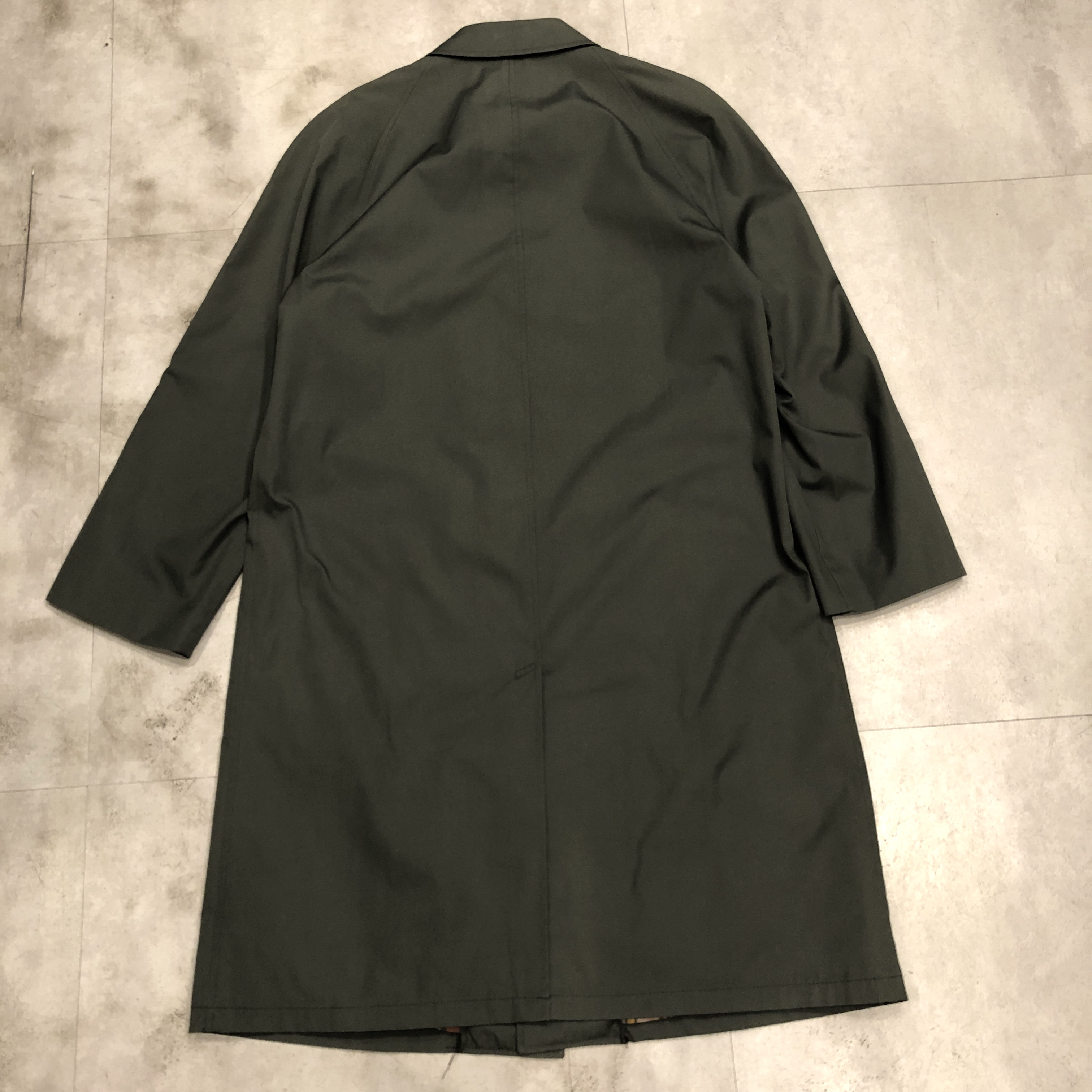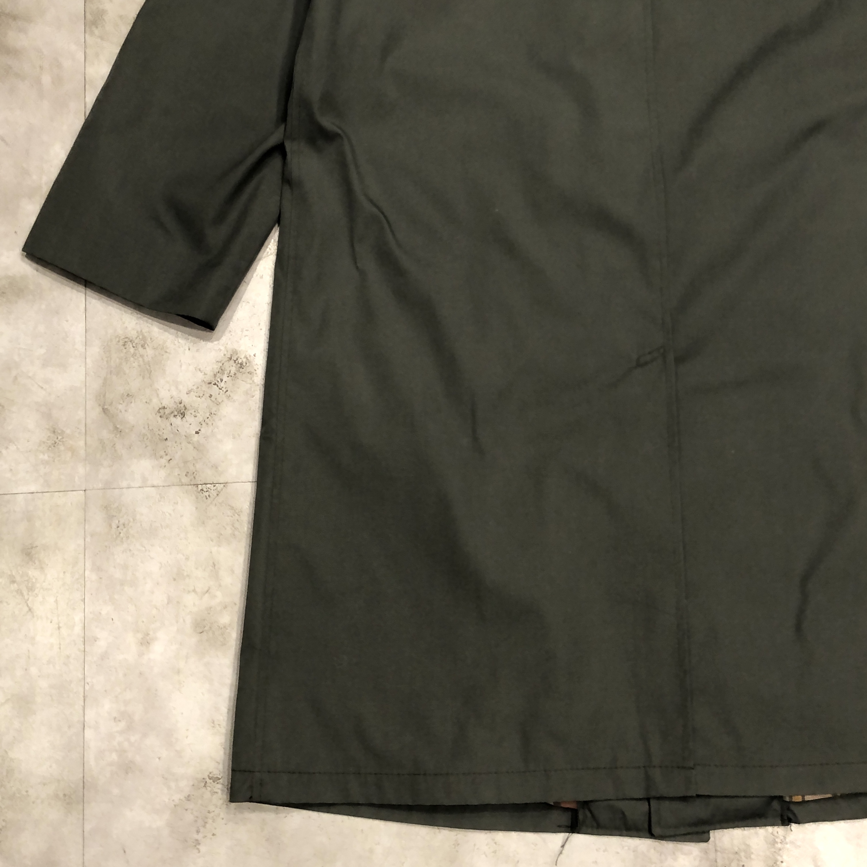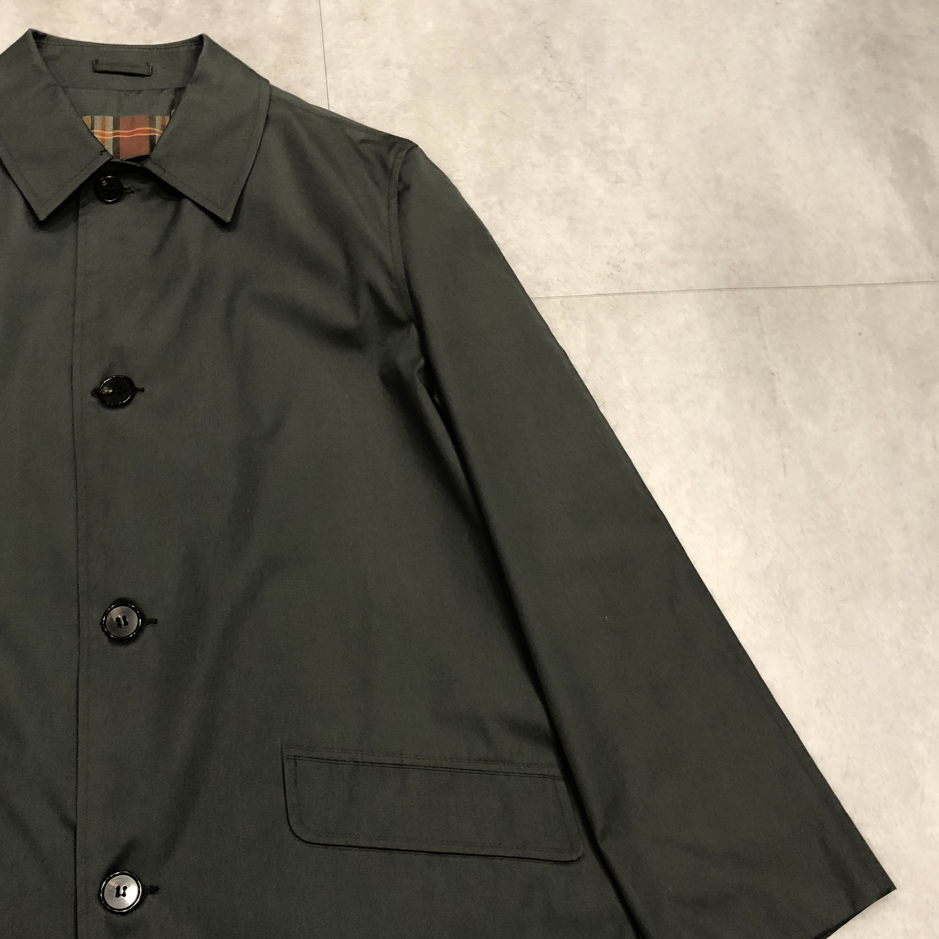 裏地は暖色系チェック。スモーキーグリーンの表地とのコントラストが非常に洒落ています。3つボタンのミニマルなフロント。無駄のないステンカラー。派手さはないのに、確実に雰囲気がある。静かな存在感を放つコートです。