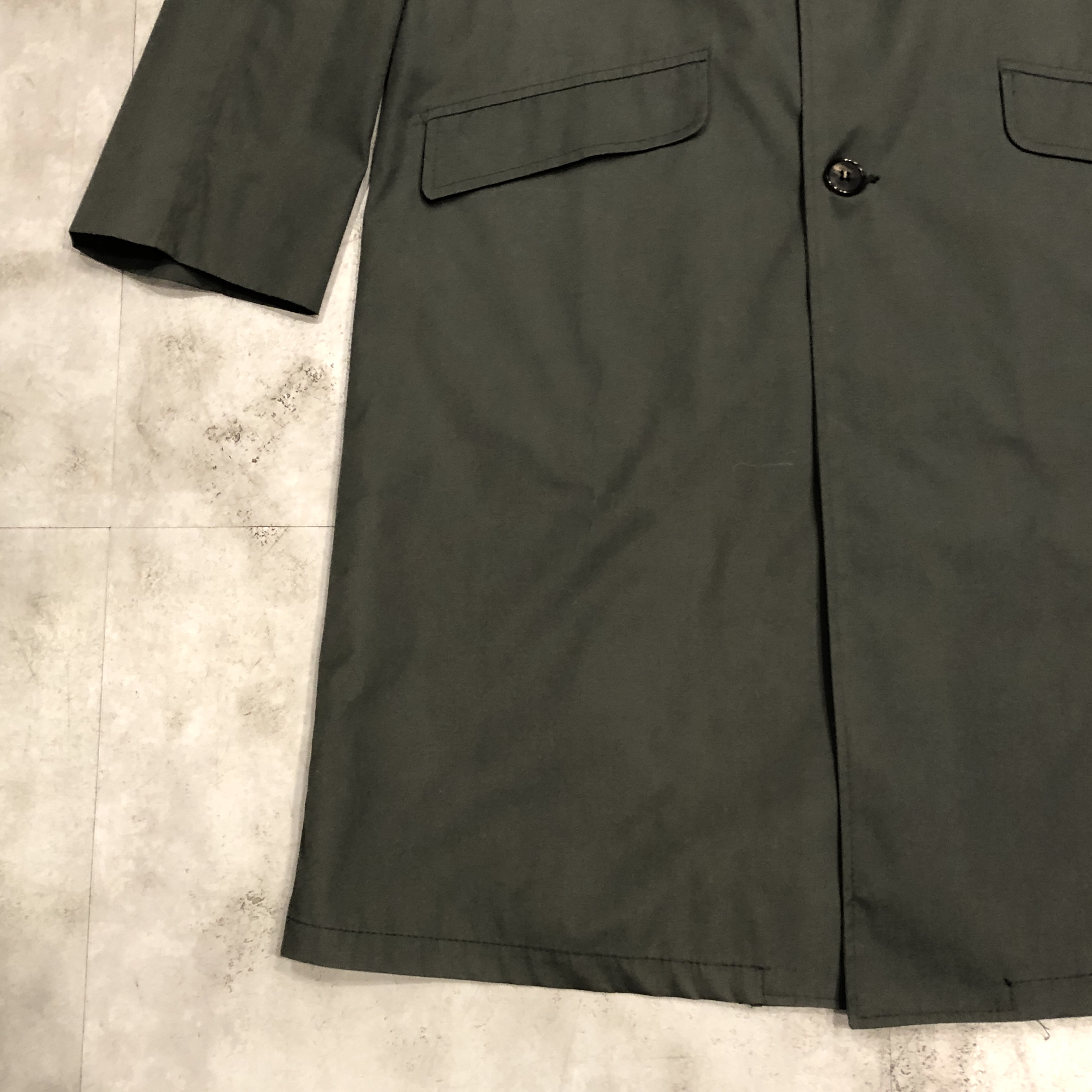 素材は50% FORTREL POLYESTER × 50% COMBED COTTON。当時の最新テクノロジー素材として登場したPERMA-PREST。ノンアイロンで、フルウォッシャブル。タグに誇らしく記された「THIS COAT REQUIRES NO IRONING」という一文が、当時の時代背景を物語ります。ウールコートが主流だった時代に、“扱いやすさ”という新しい価値を提示した革新的な一着でした。
