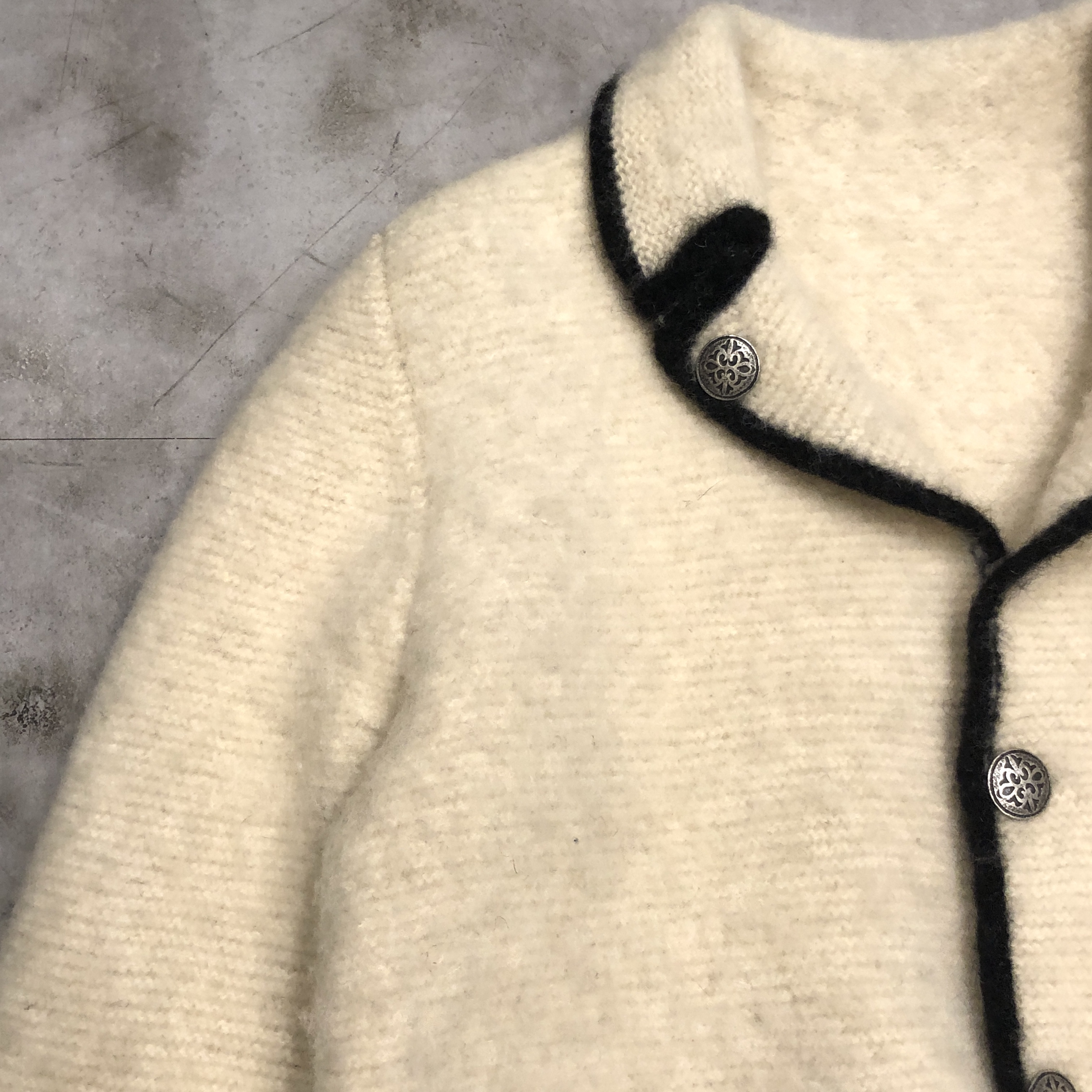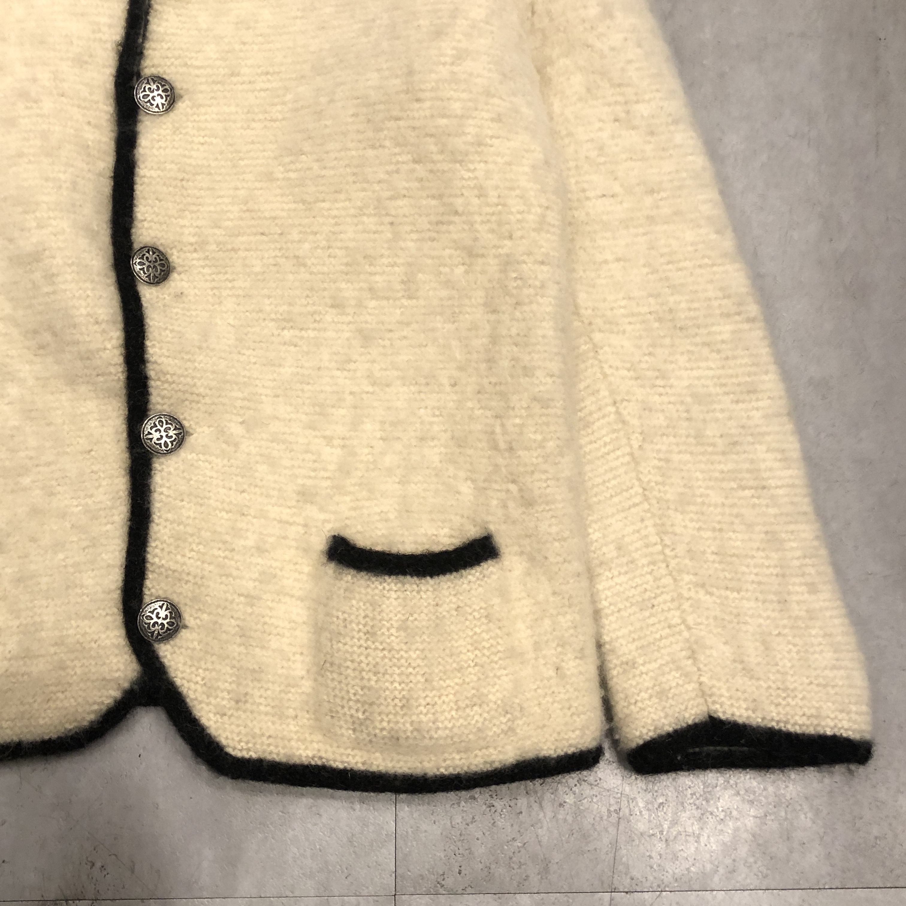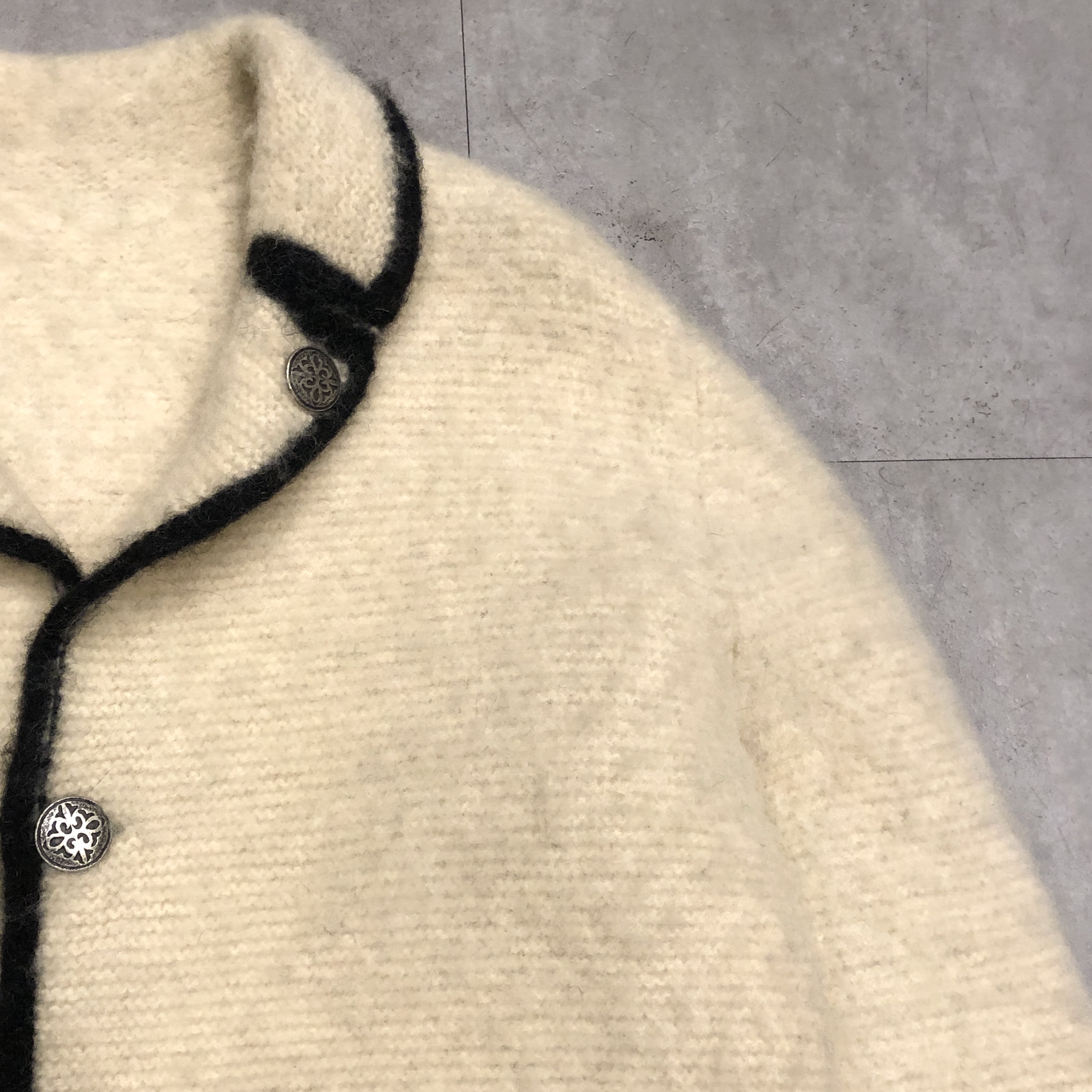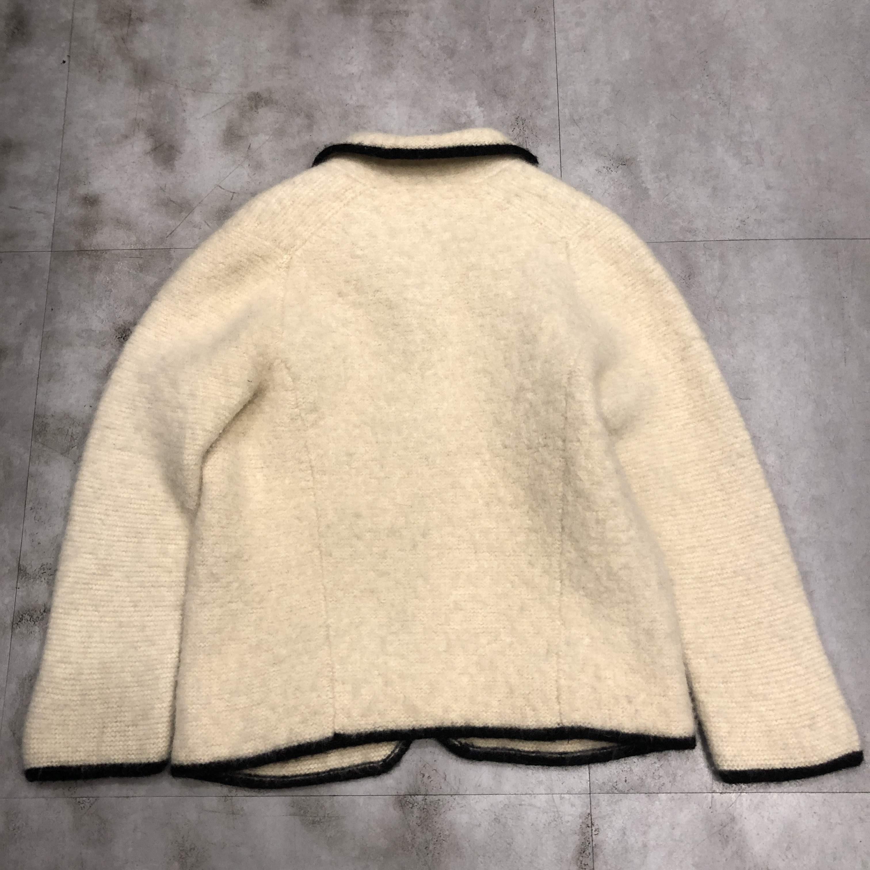 - 年代相応の着用感、右裾の汚れ、全体的に毛玉等が画像の様にございますが、古着慣れされている方でしたら問題なくお使いいただけます。ボタンが替えられています。