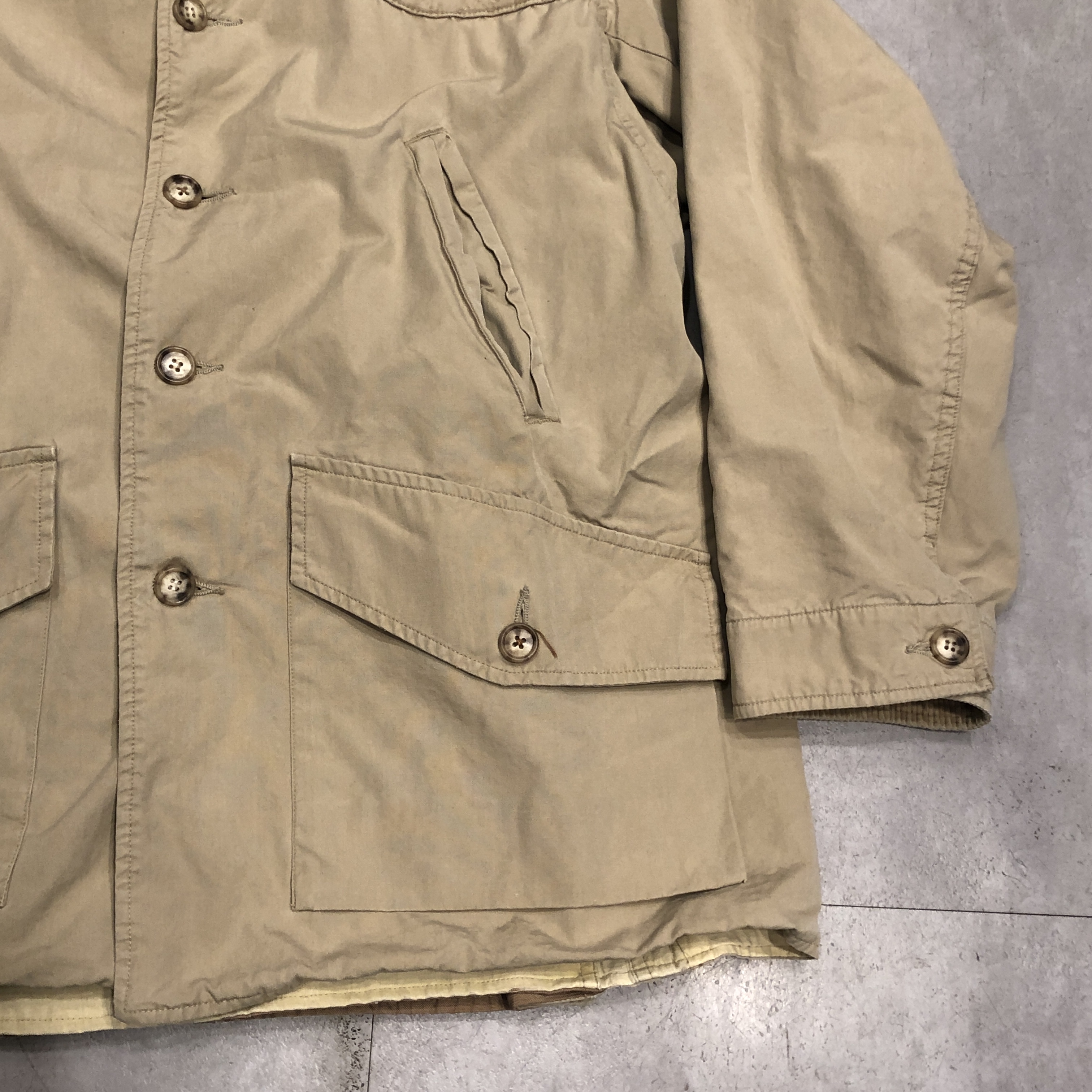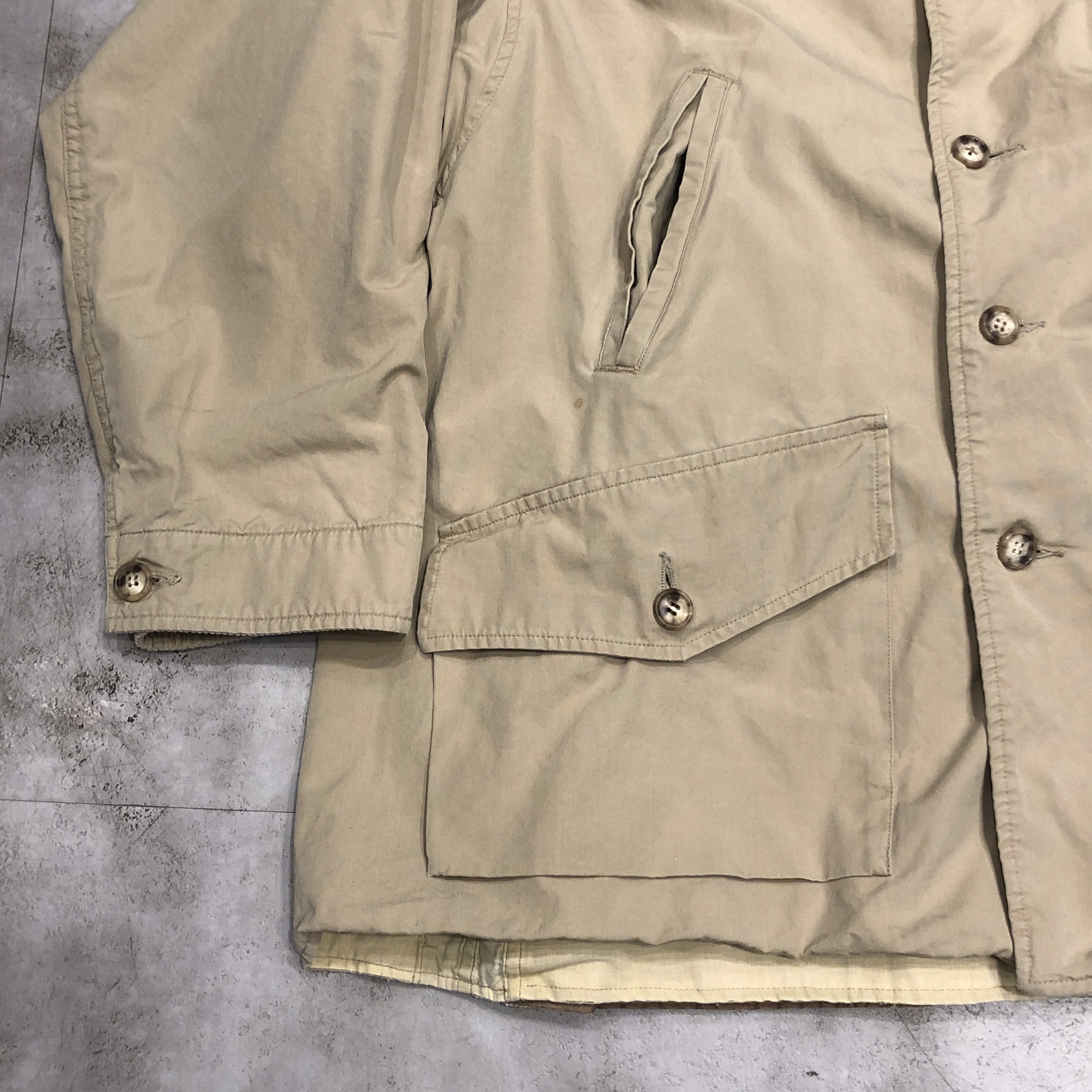- 年代相応の着用感、スレ、汚れ等が画像の様にございますが、古着慣れされている方でしたら問題なくお使いいただける範囲です。第1ボタンが替えられています。