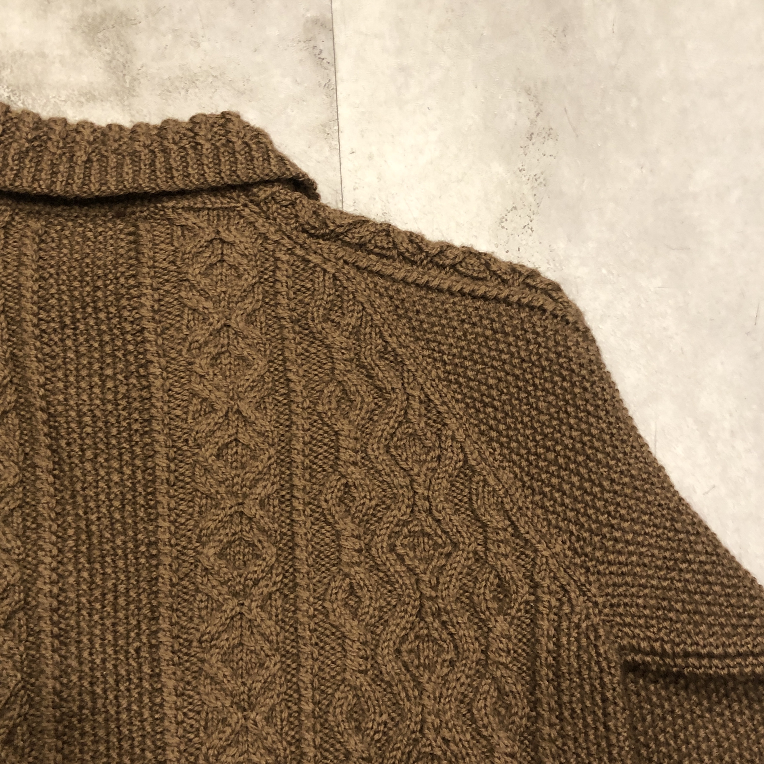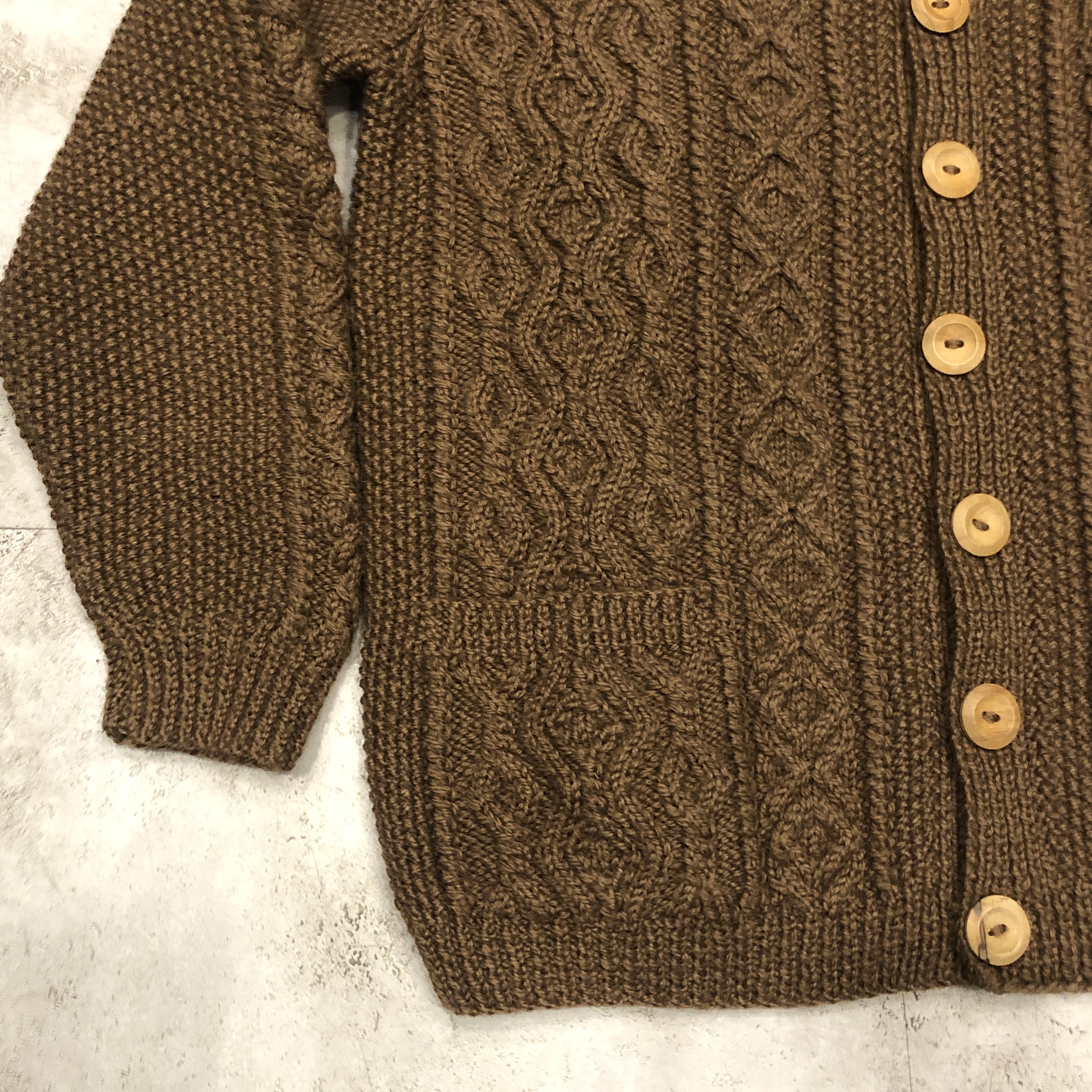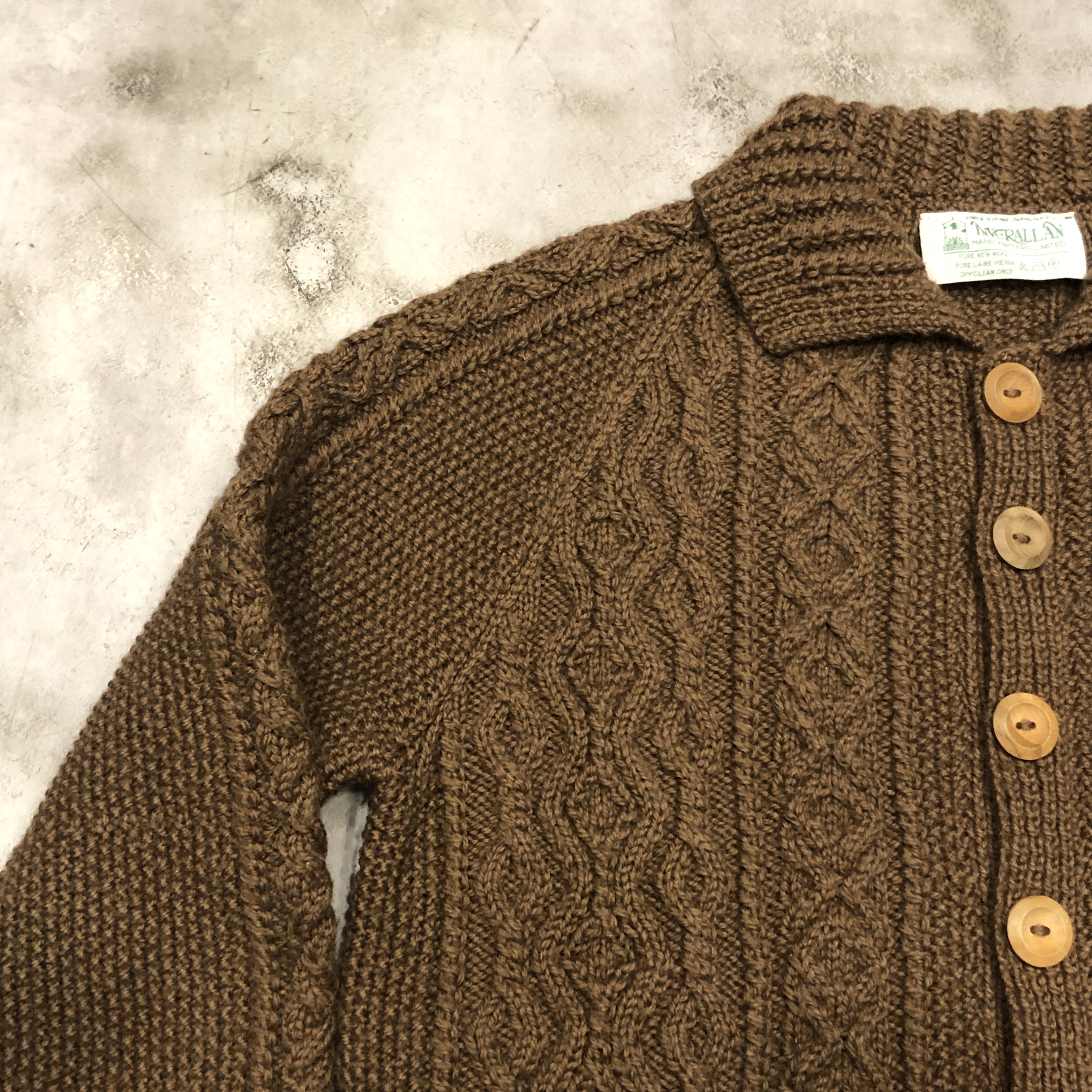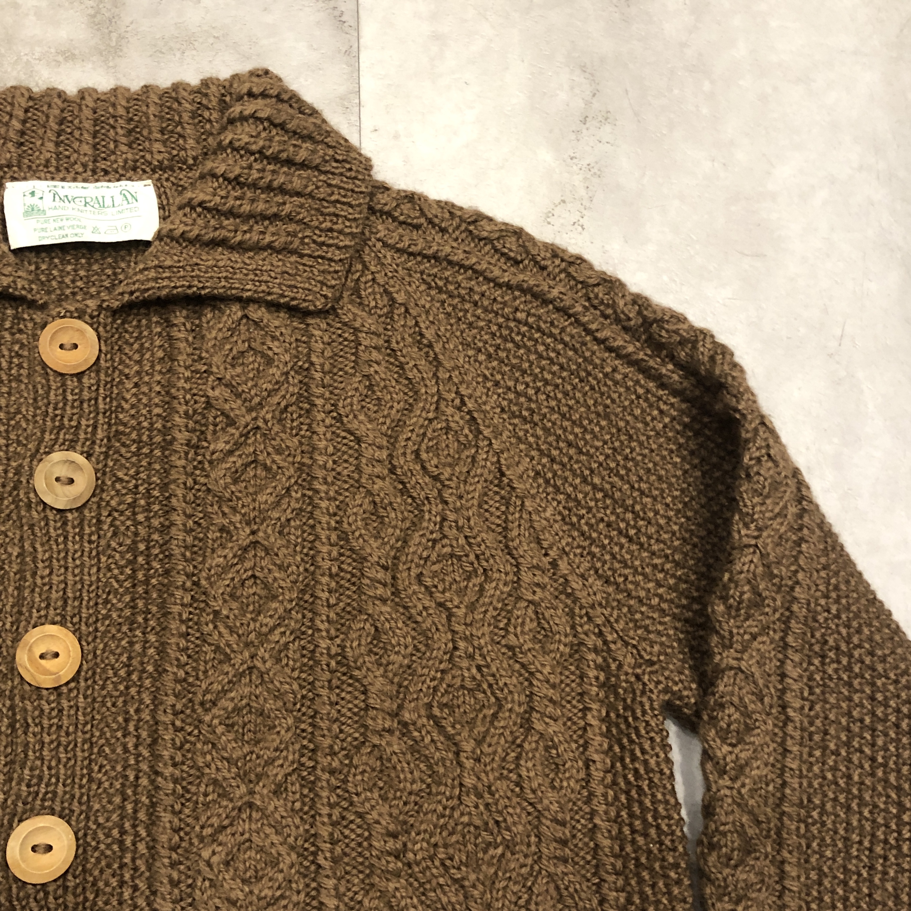 - 1970年代より続くスコットランド発の名門〈INVERALLAN〉による、名作「3A」ハンドニットカーディガンのご紹介です。熟練した職人の手仕事により、1着編み上げるのに60時間以上を要するとも言われる名品。当個体はライトな生地感、クラシックなアラン編みの模様と、存在感のあるウッドボタン、ざっくりとしたピュアニューウールの肉厚な風合いが相まって、まさに“一生モノ”と呼ぶにふさわしい佇まいです。