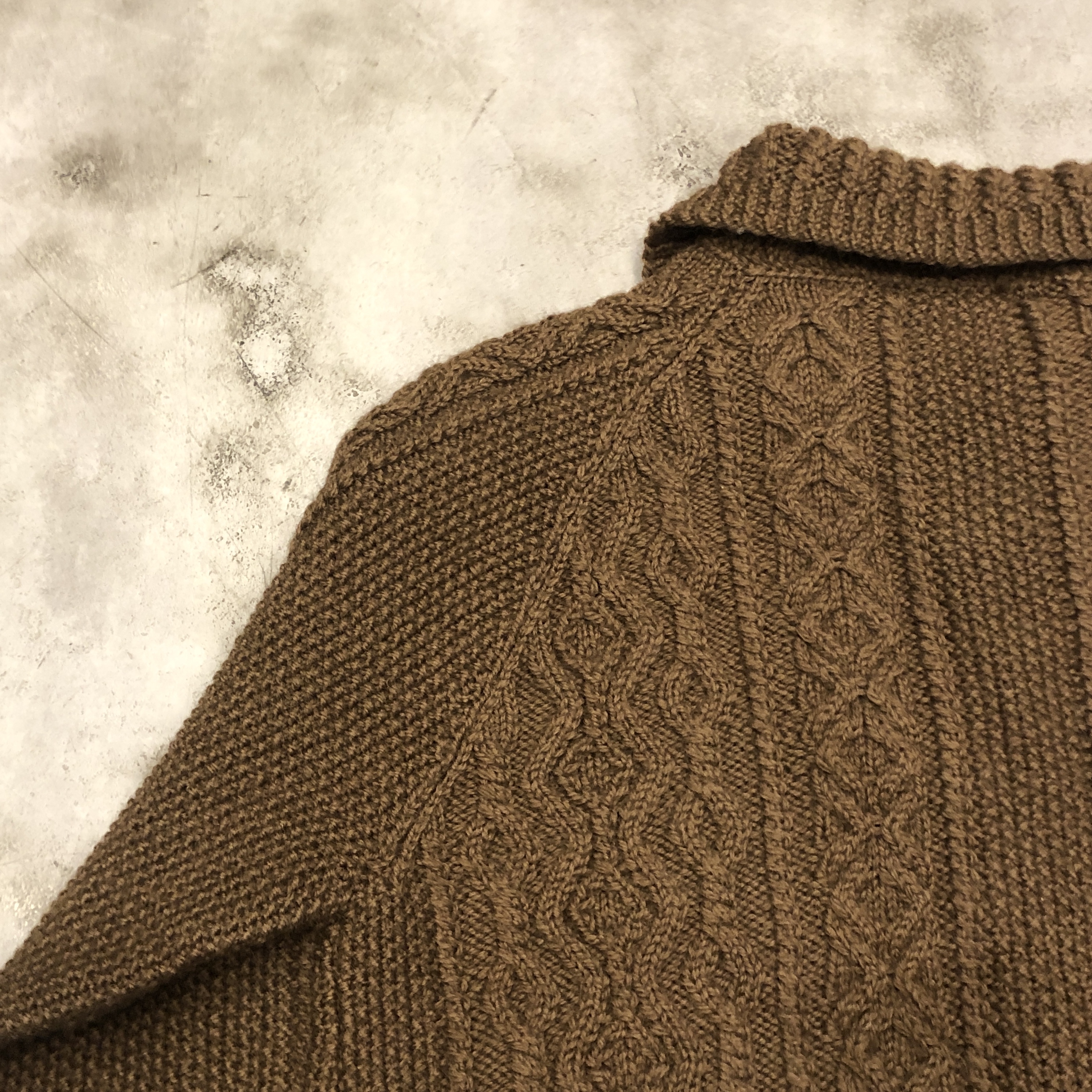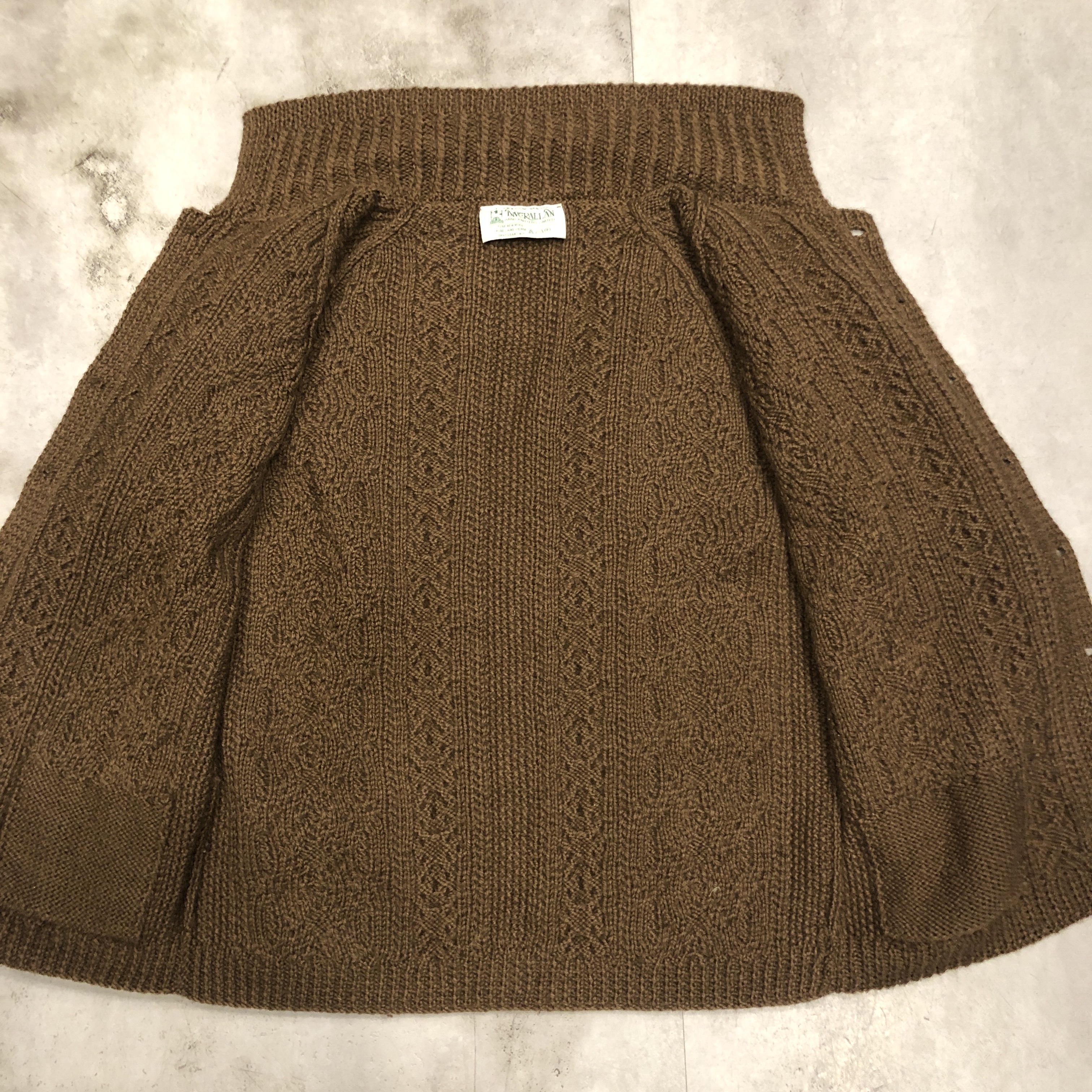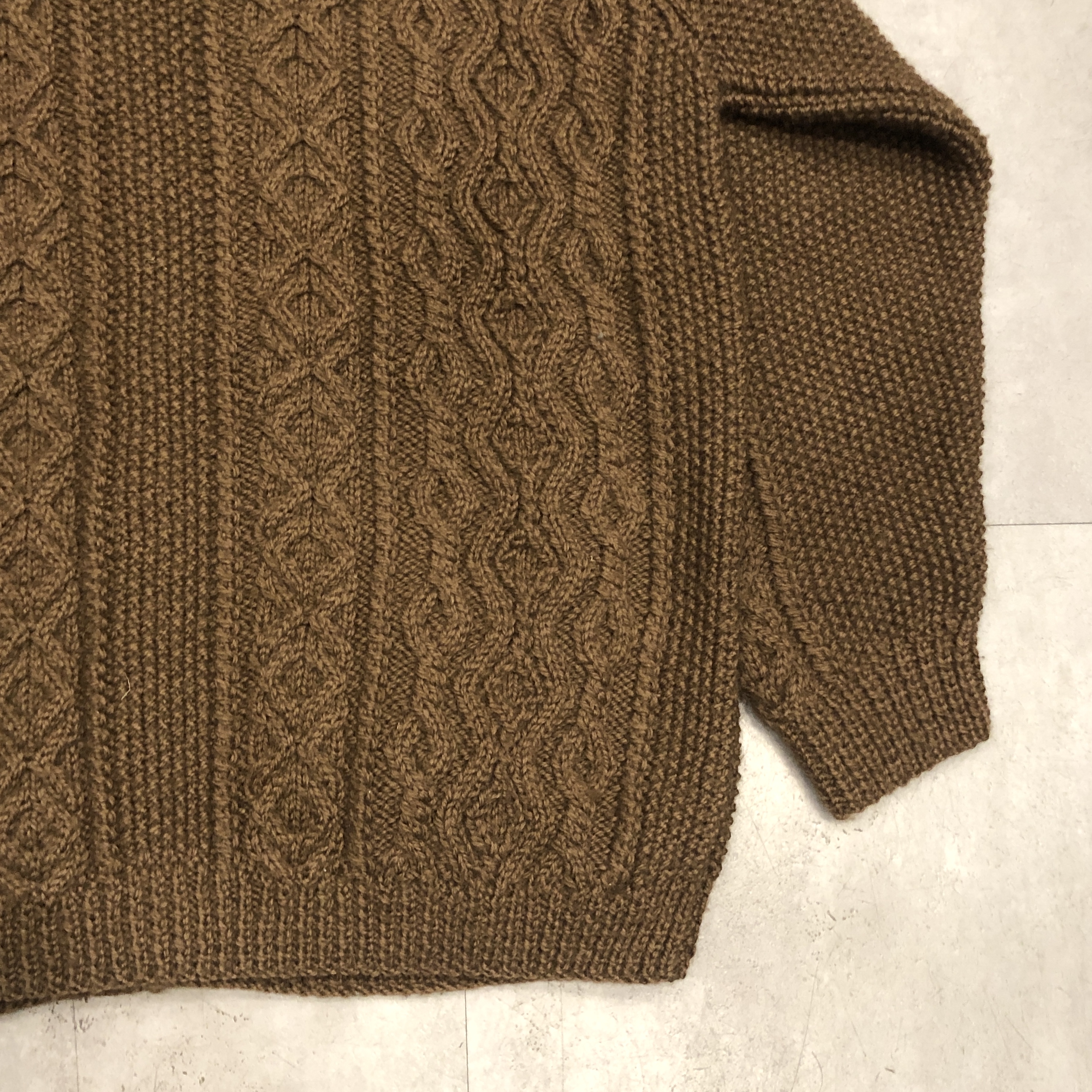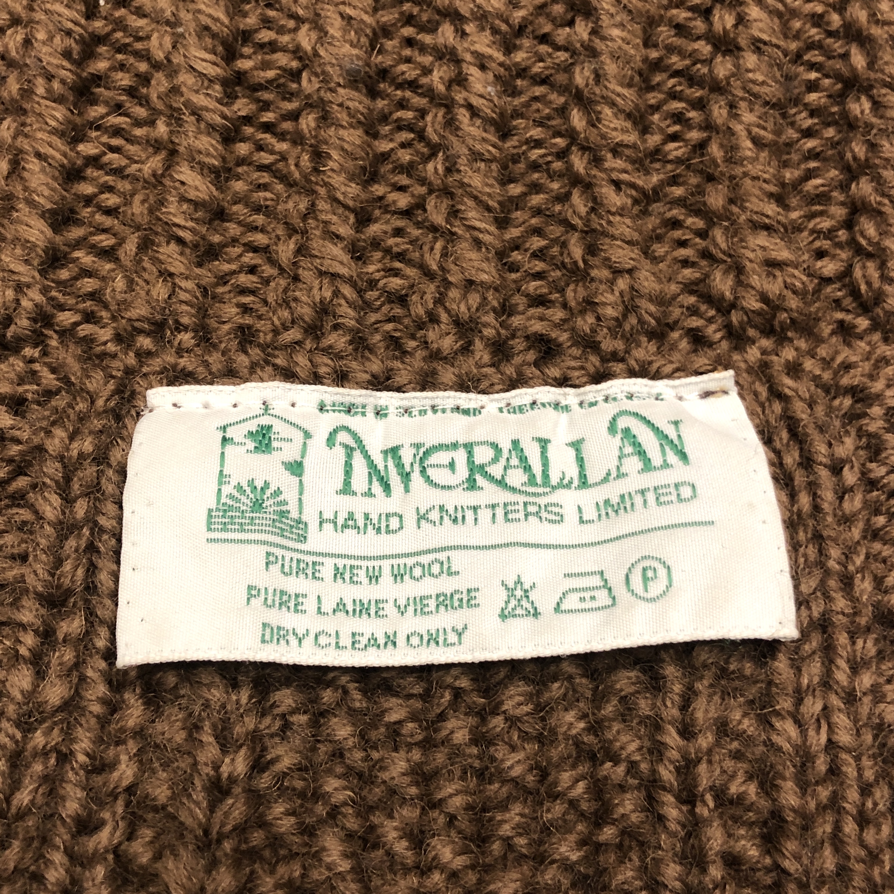 - 1970年代より続くスコットランド発の名門〈INVERALLAN〉による、名作「3A」ハンドニットカーディガンのご紹介です。熟練した職人の手仕事により、1着編み上げるのに60時間以上を要するとも言われる名品。当個体はライトな生地感、クラシックなアラン編みの模様と、存在感のあるウッドボタン、ざっくりとしたピュアニューウールの肉厚な風合いが相まって、まさに“一生モノ”と呼ぶにふさわしい佇まいです。