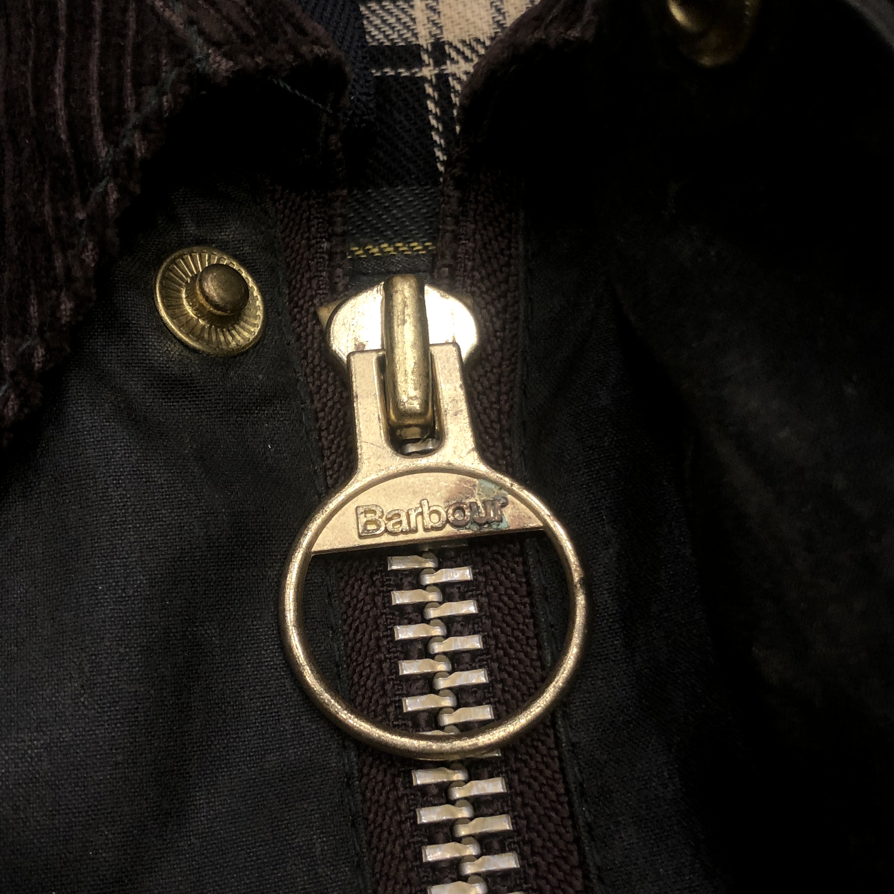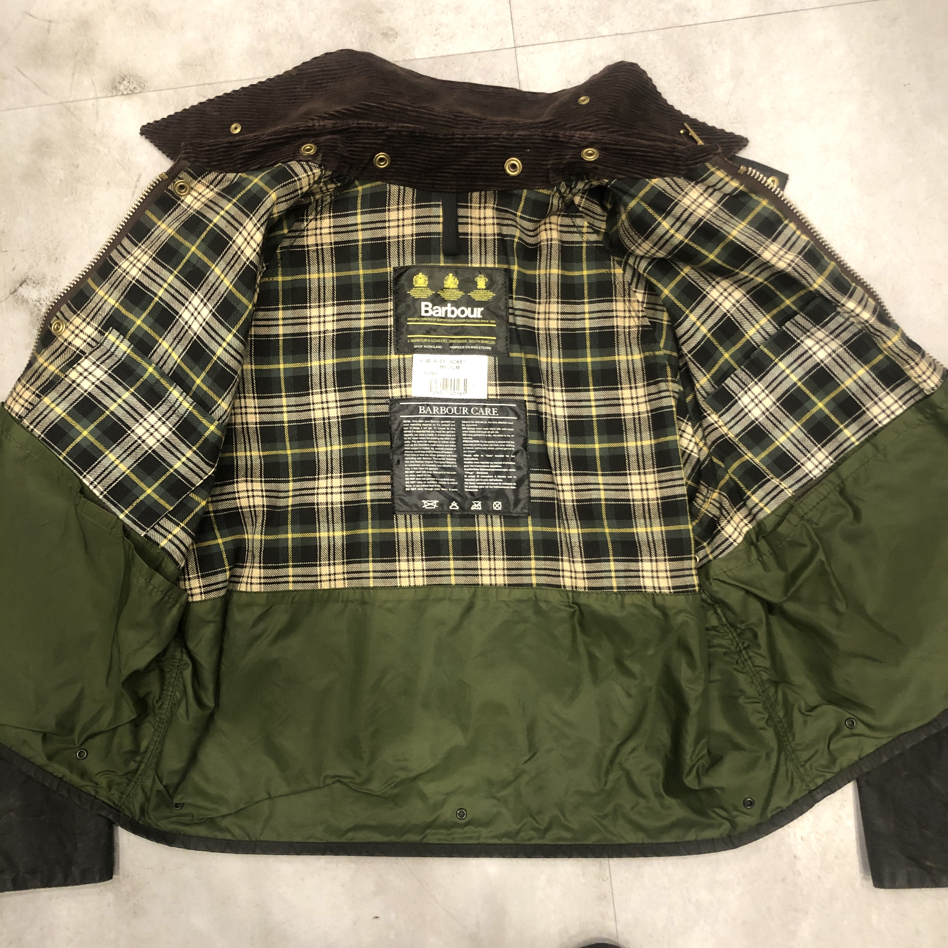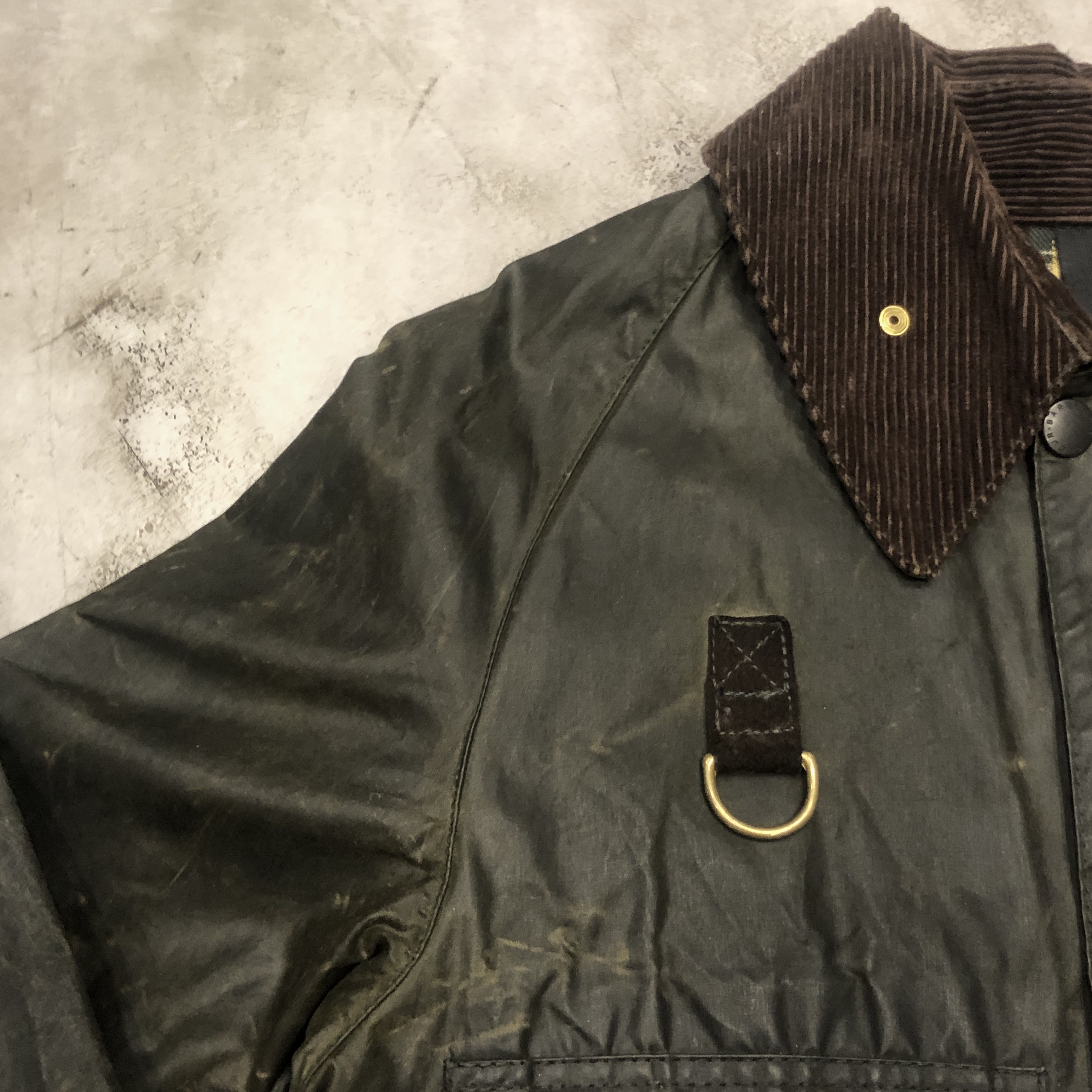 フロントにはスナップボタンとダブルジップを採用し、防風性と利便性を両立。ダークオリーブのワックスドコットンにブラウンのコーデュロイ襟が映える伝統的な佇まいは、BARBOURのフィッシングラインならではの魅力を放っています。