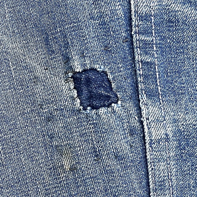 - 画像のように、汚れ、キズ、スレがあり、右袖や前左裾等に手縫いで簡易的なリペアがございます。