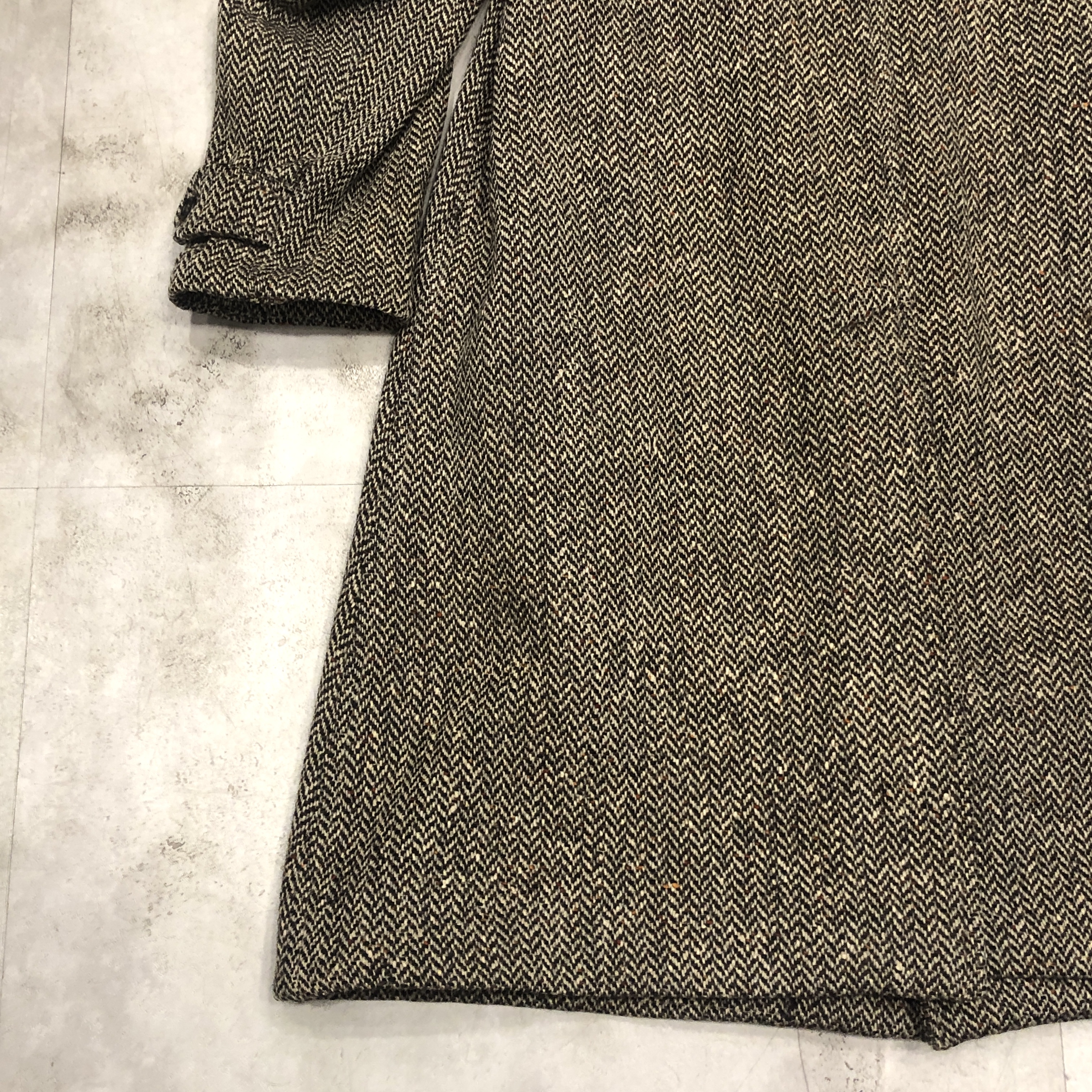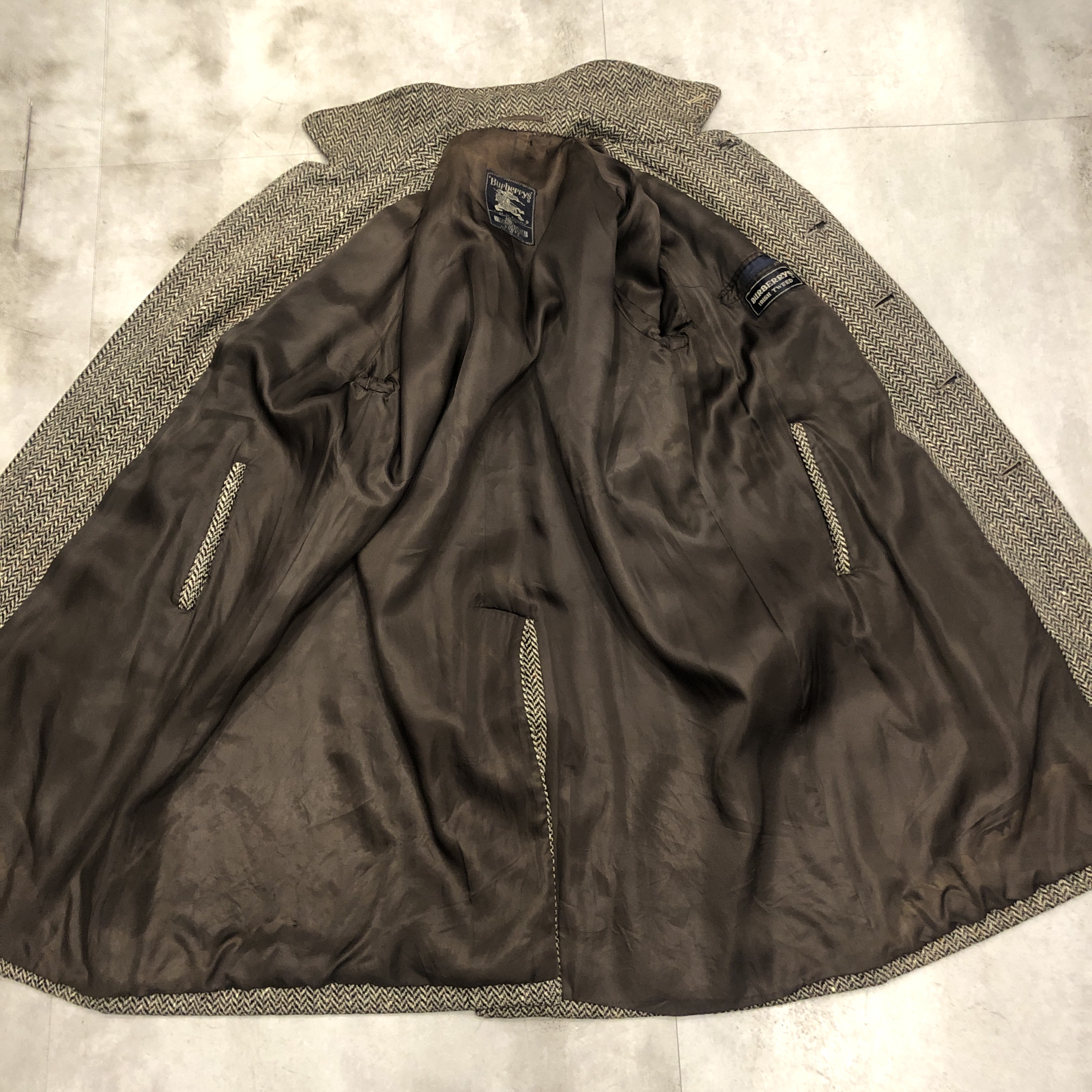 - 英国伝統のクラフツマンシップが息づく Burberrys のバルマカーンコート。本個体は希少な IRISH TWEED を贅沢に使用した一着です。アイルランド産ツイード特有の素朴で力強い織りと深みのある色調は、雨風に強く長年の着用に耐える耐久性を備え、クラシックコートに相応しい風格を漂わせています。
