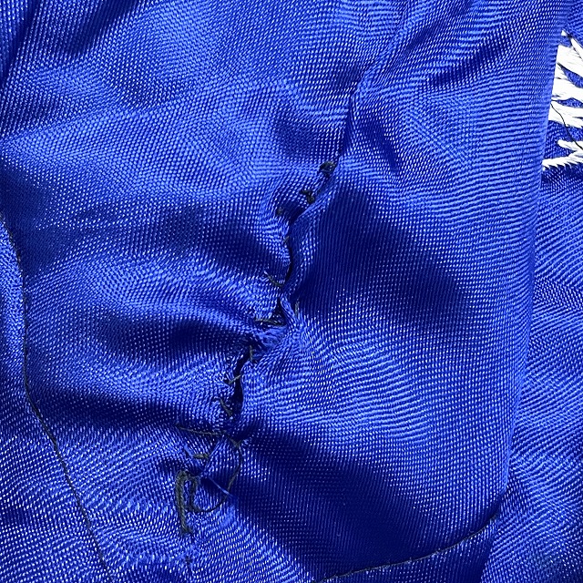 裏地にステッチ抜けや手縫いで簡易的なリペアがあり、スレーキに破れがございます。