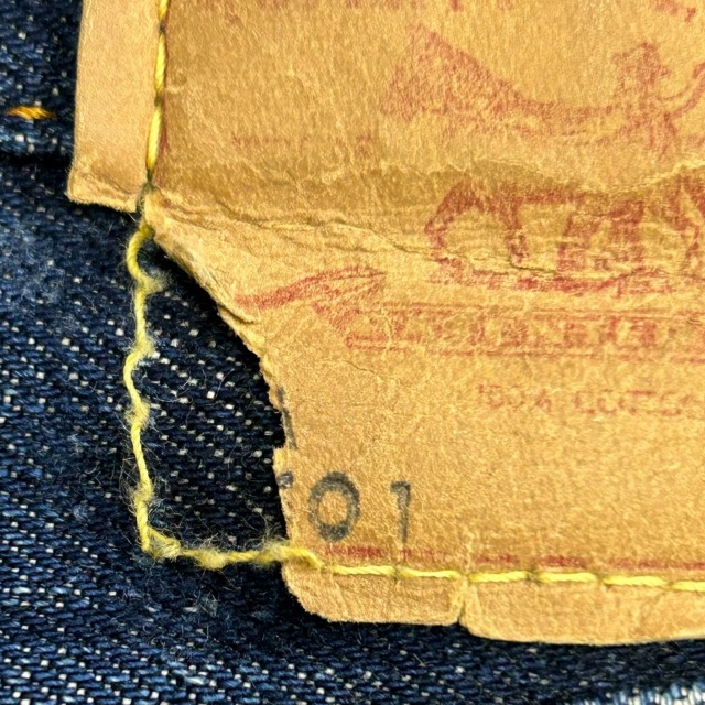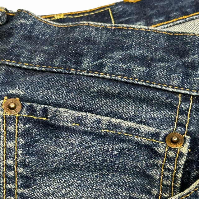 - トップボタン裏刻印『4』、足長R、並行ステッチ、ウェストチェーンステッチ