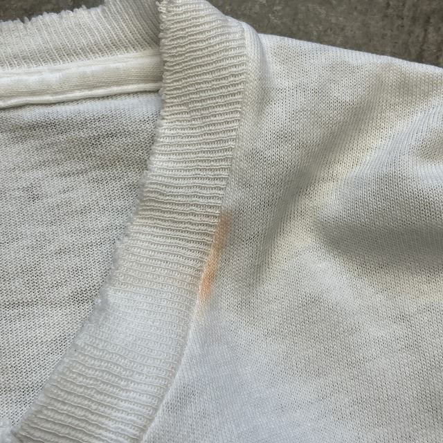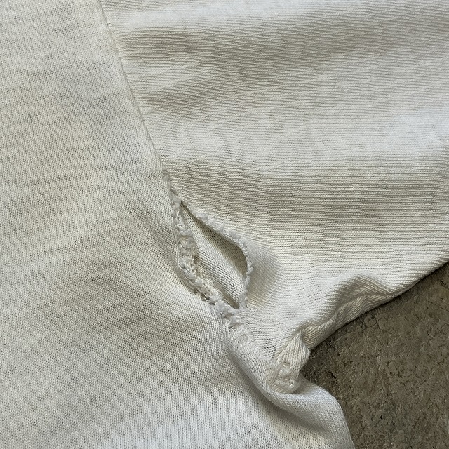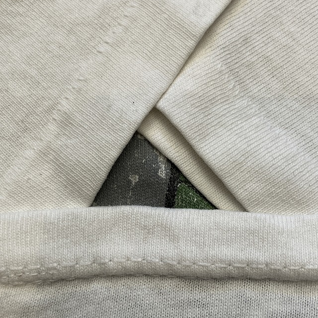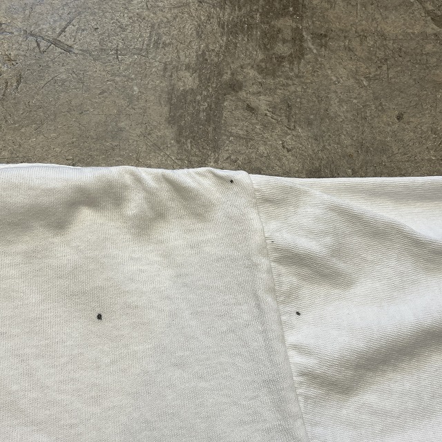 - 襟先、袖付け根部分にダメージ、裾先にステッチ抜けや、ほつれがみられます。また、画像の様な襟元の色移り、肩付近に小さな汚れがみられます。その他、スレ等の年代相応の着用感がみられ、ユーズド慣れされた方におすすめの商品です。