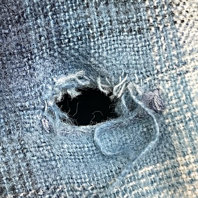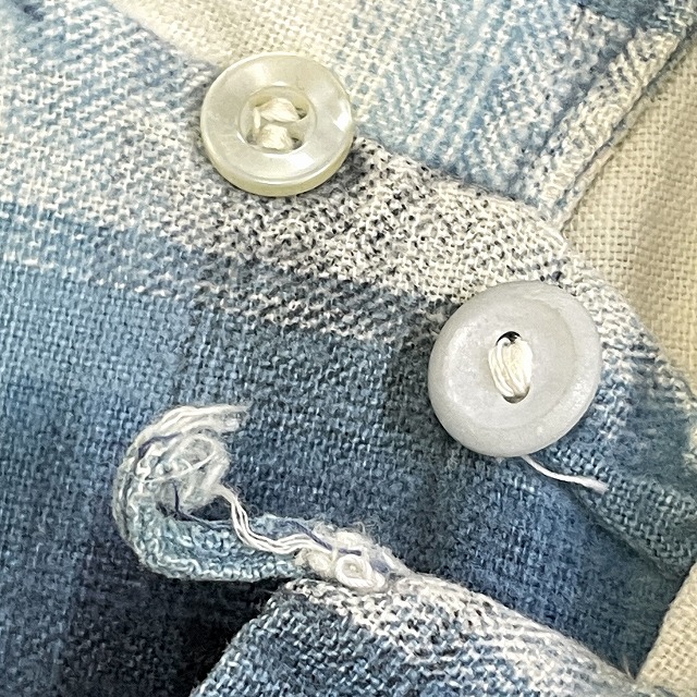 ボタンループの片側が取れており、ボタンホールにホツレがございます。