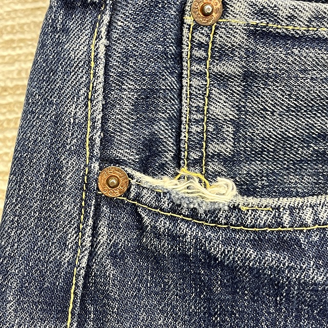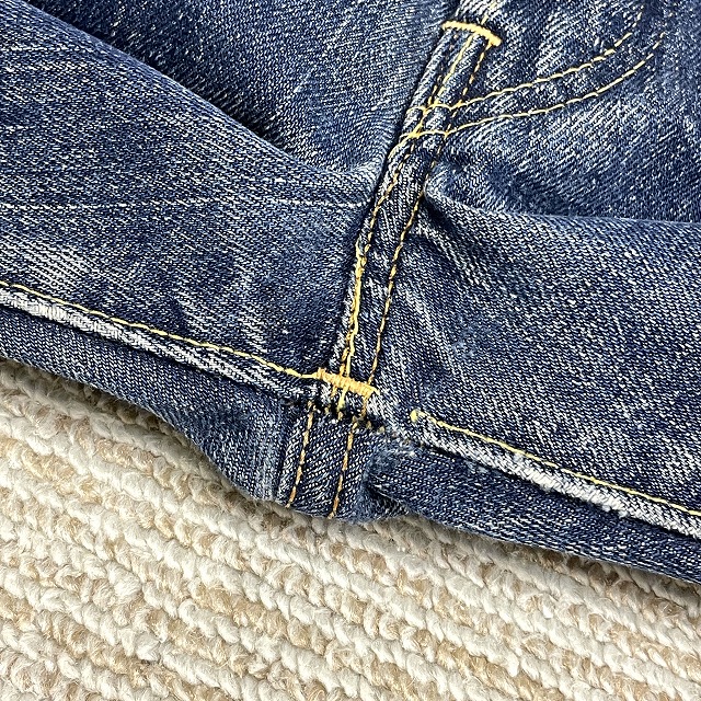 - トップボタン裏刻印『6』、不均等V、平行ステッチ