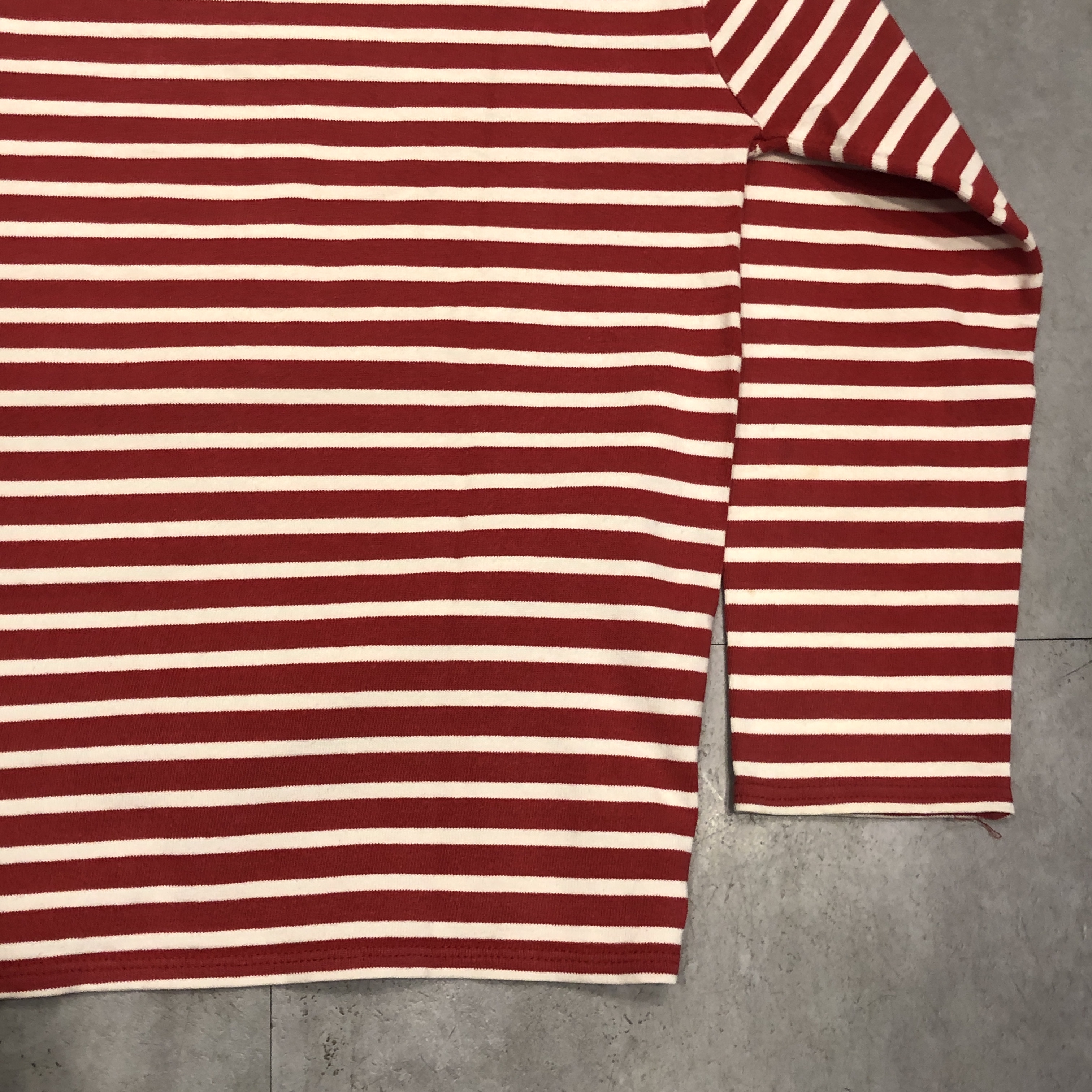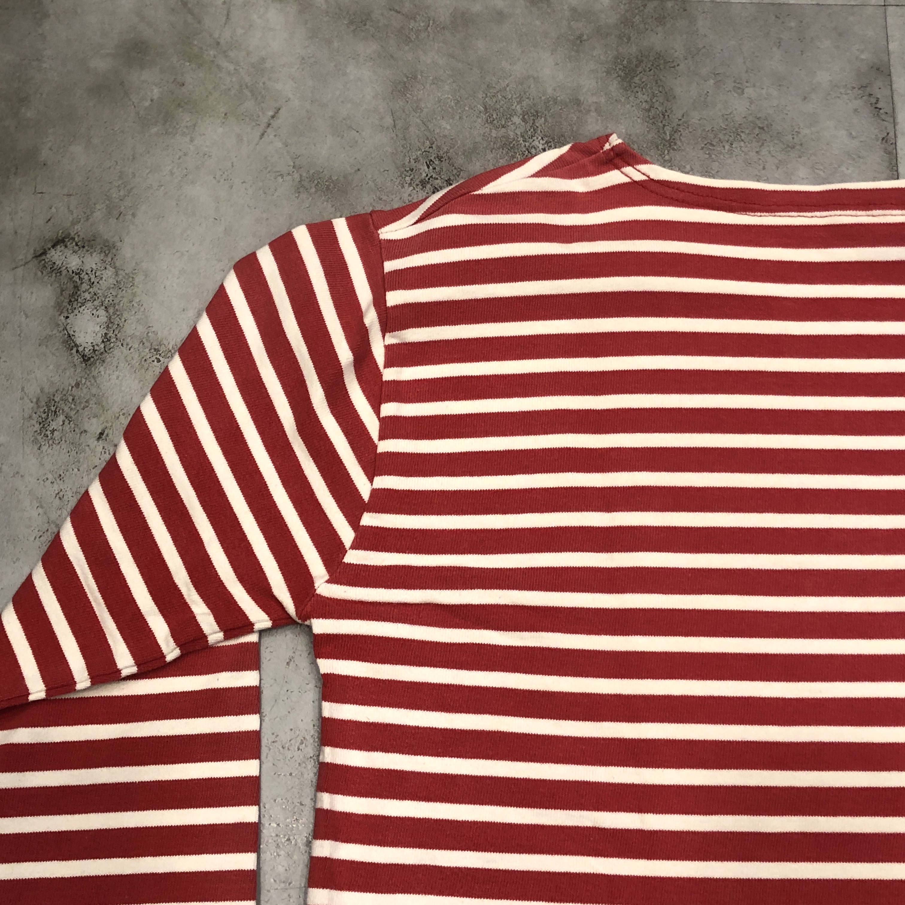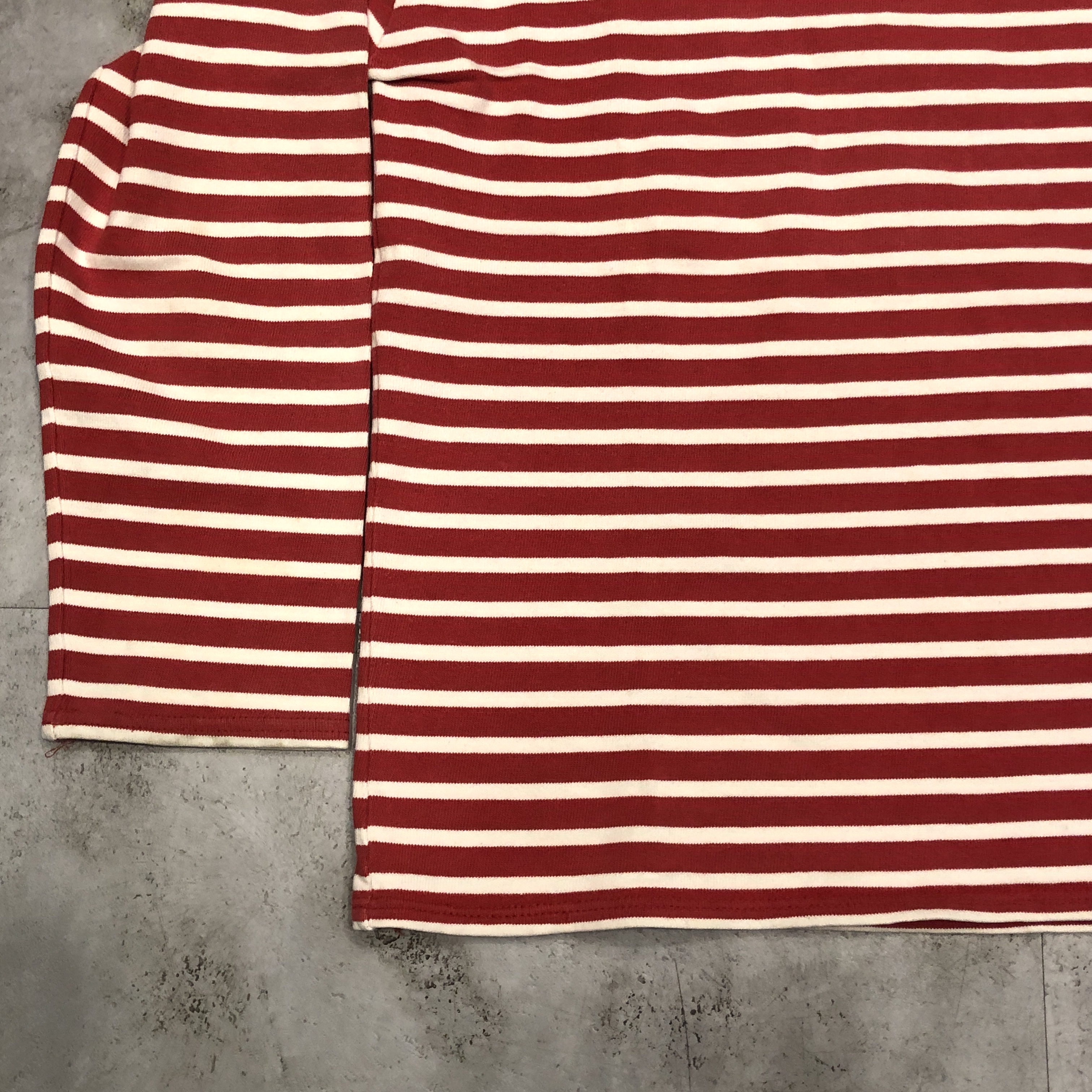 今回ご紹介するのは永遠の定番、レッド/ ホワイトのボーダーカラー。ミリタリーやワークスタイルにも馴染み、カジュアルからシックまで幅広く対応します。素材は100%コットンの目の詰まった天竺生地。着始めはしっかりとした張り感があり、洗い込むことで徐々に柔らかく、肌馴染みの良い風合いへと育っていきます。