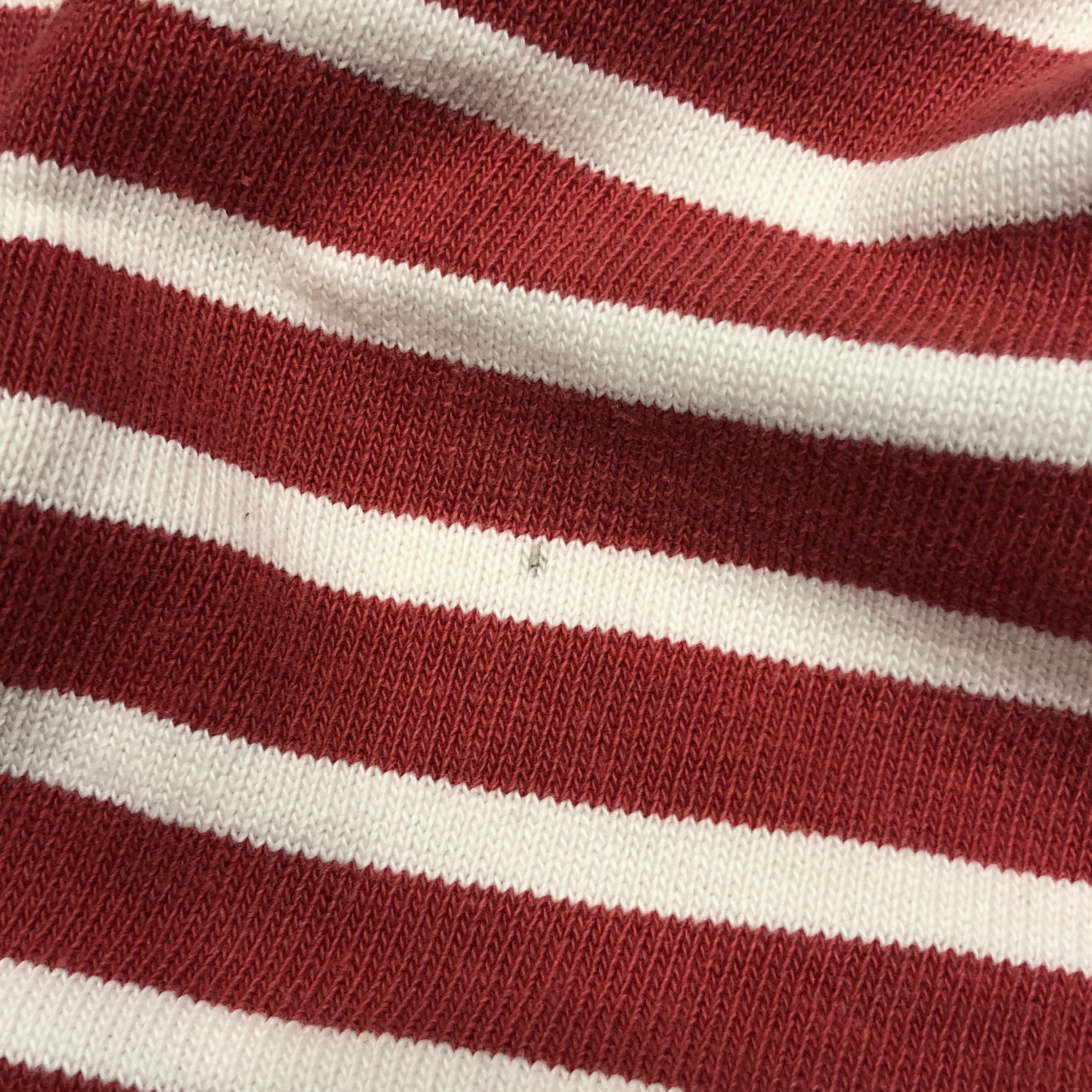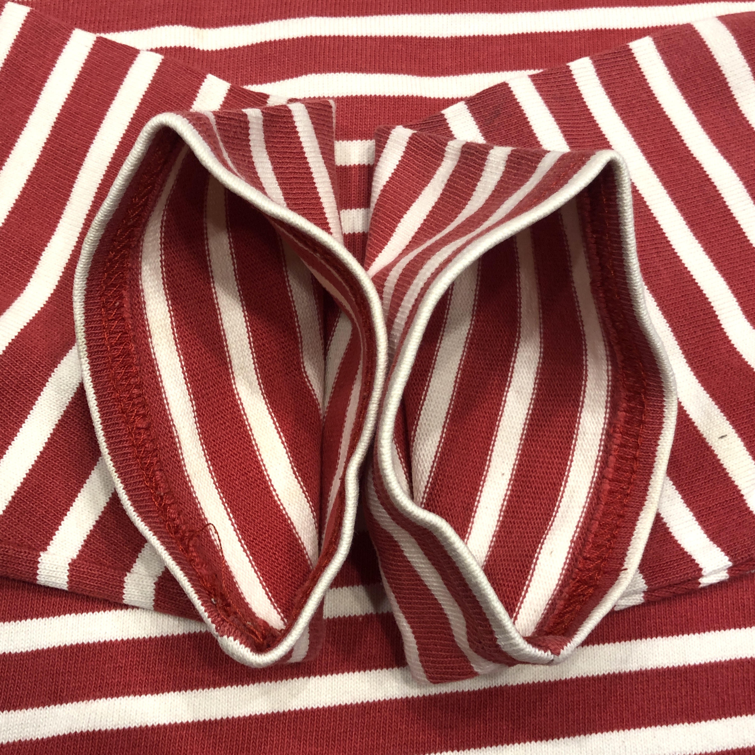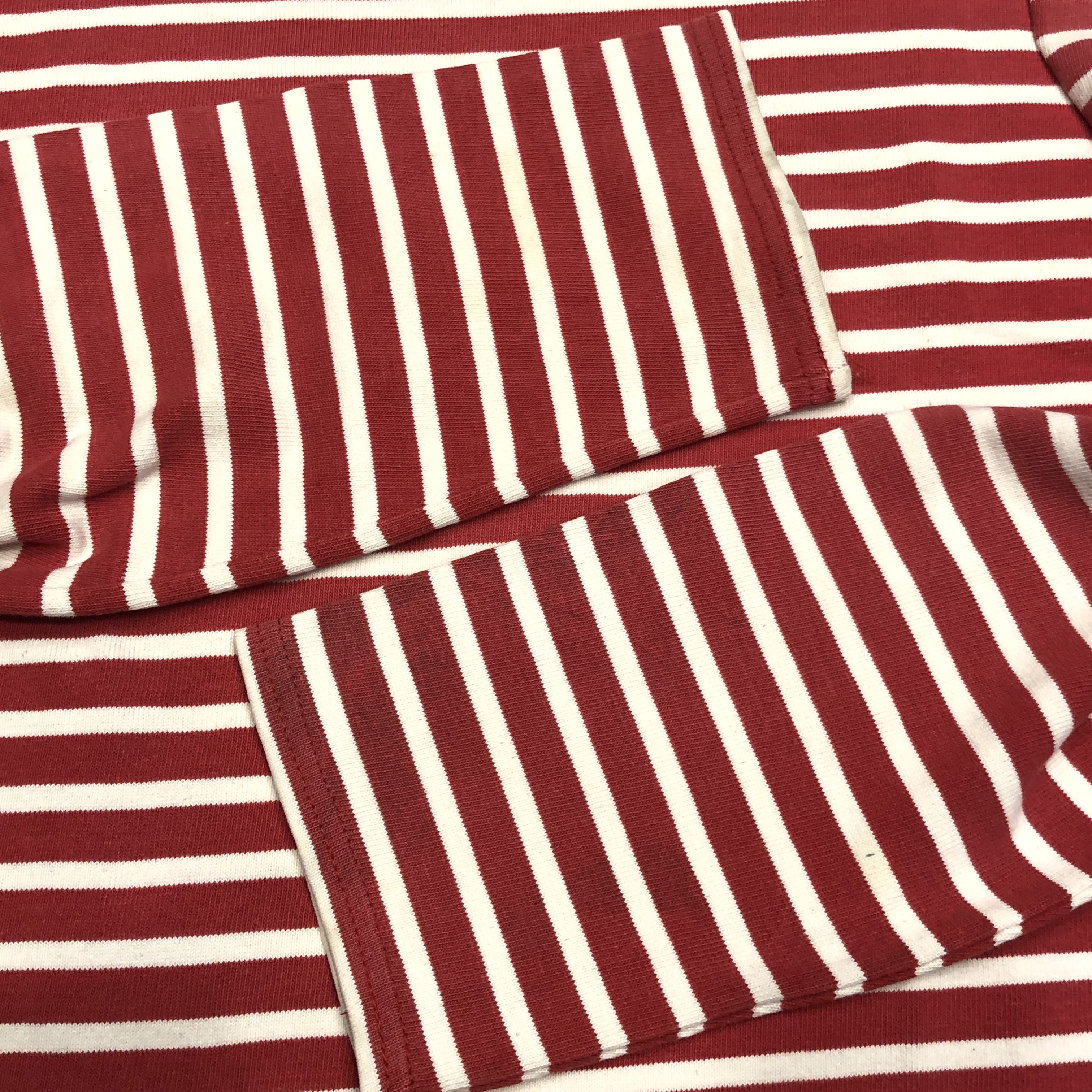 今回ご紹介するのは永遠の定番、レッド/ ホワイトのボーダーカラー。ミリタリーやワークスタイルにも馴染み、カジュアルからシックまで幅広く対応します。素材は100%コットンの目の詰まった天竺生地。着始めはしっかりとした張り感があり、洗い込むことで徐々に柔らかく、肌馴染みの良い風合いへと育っていきます。