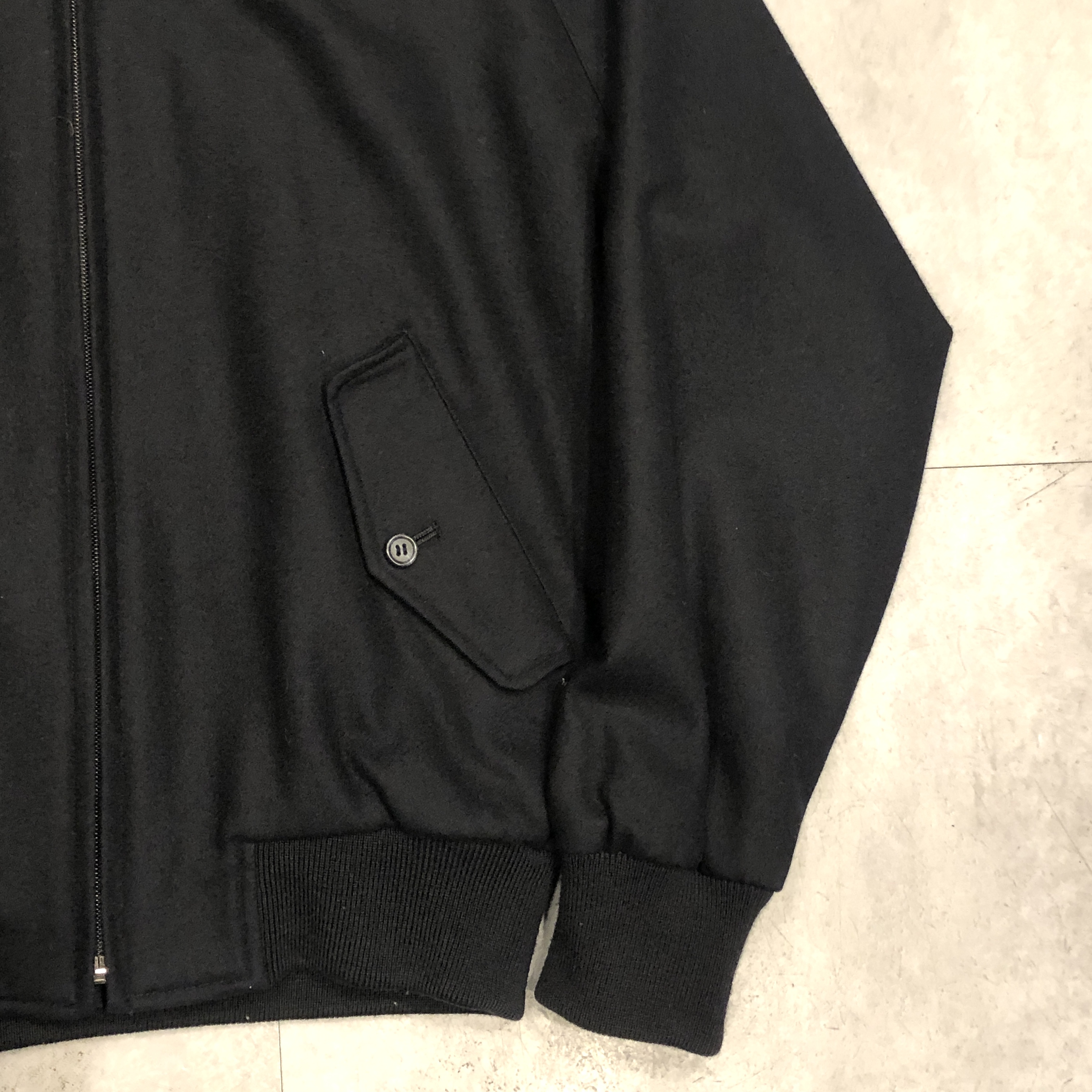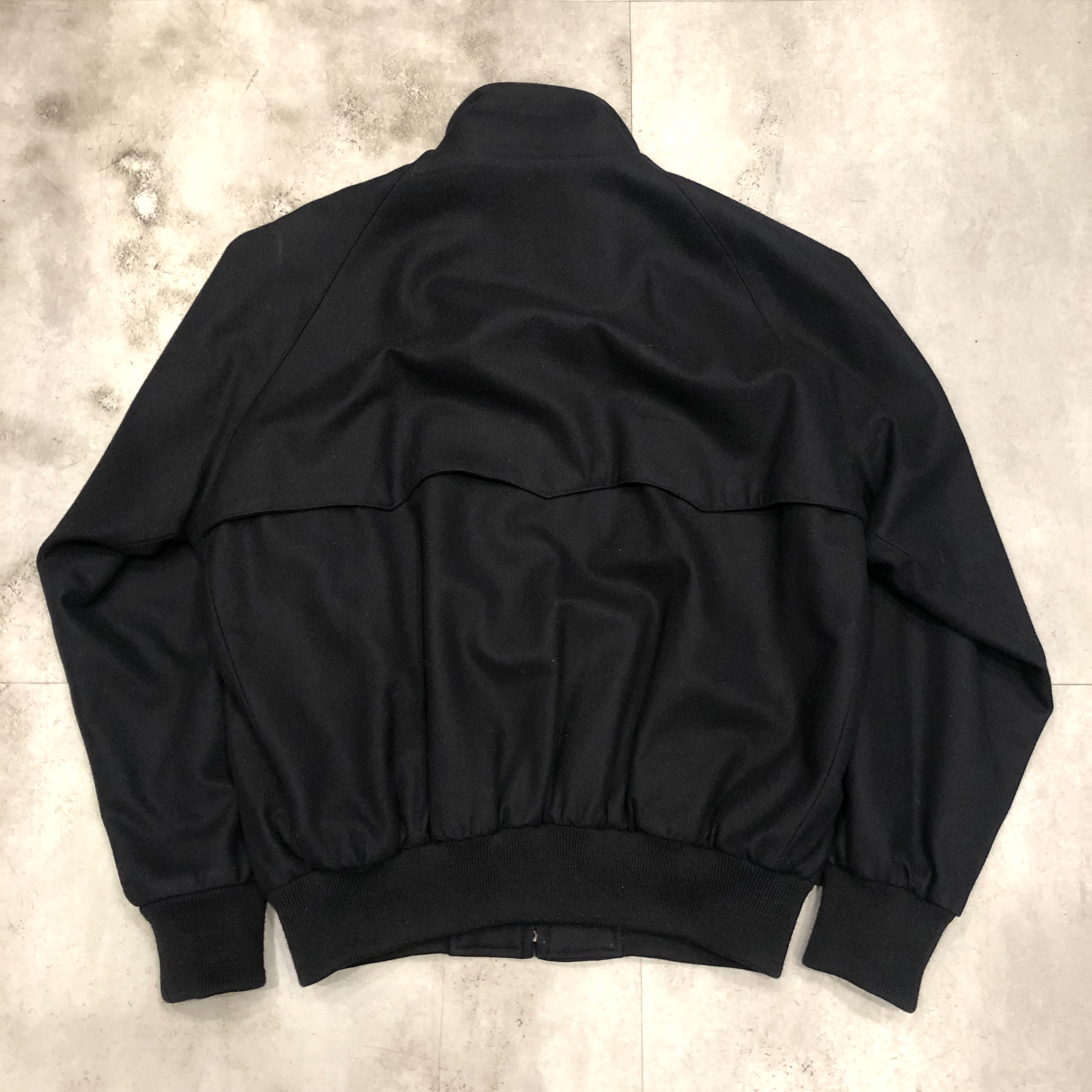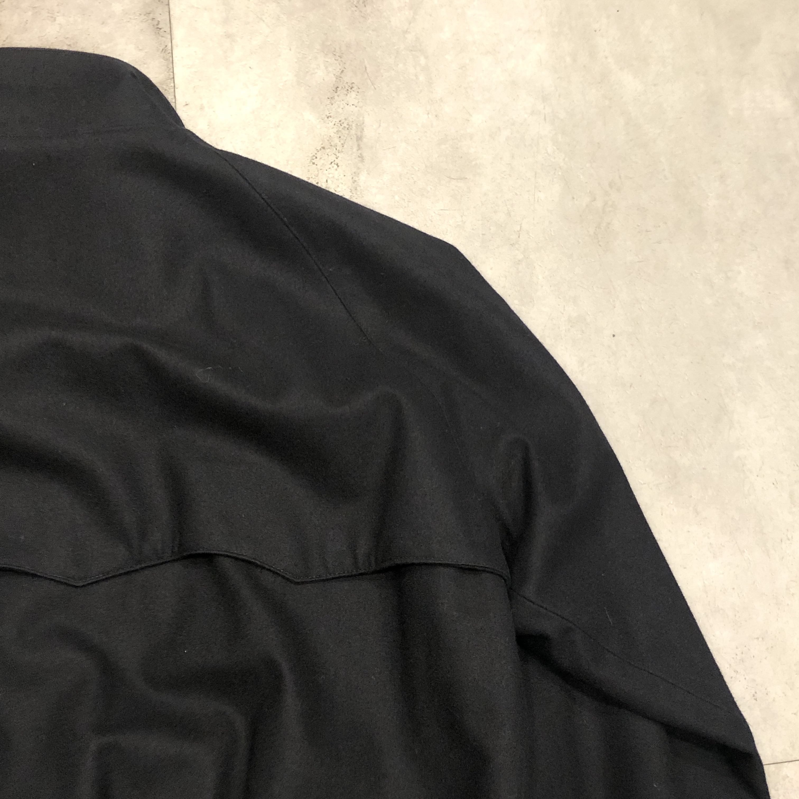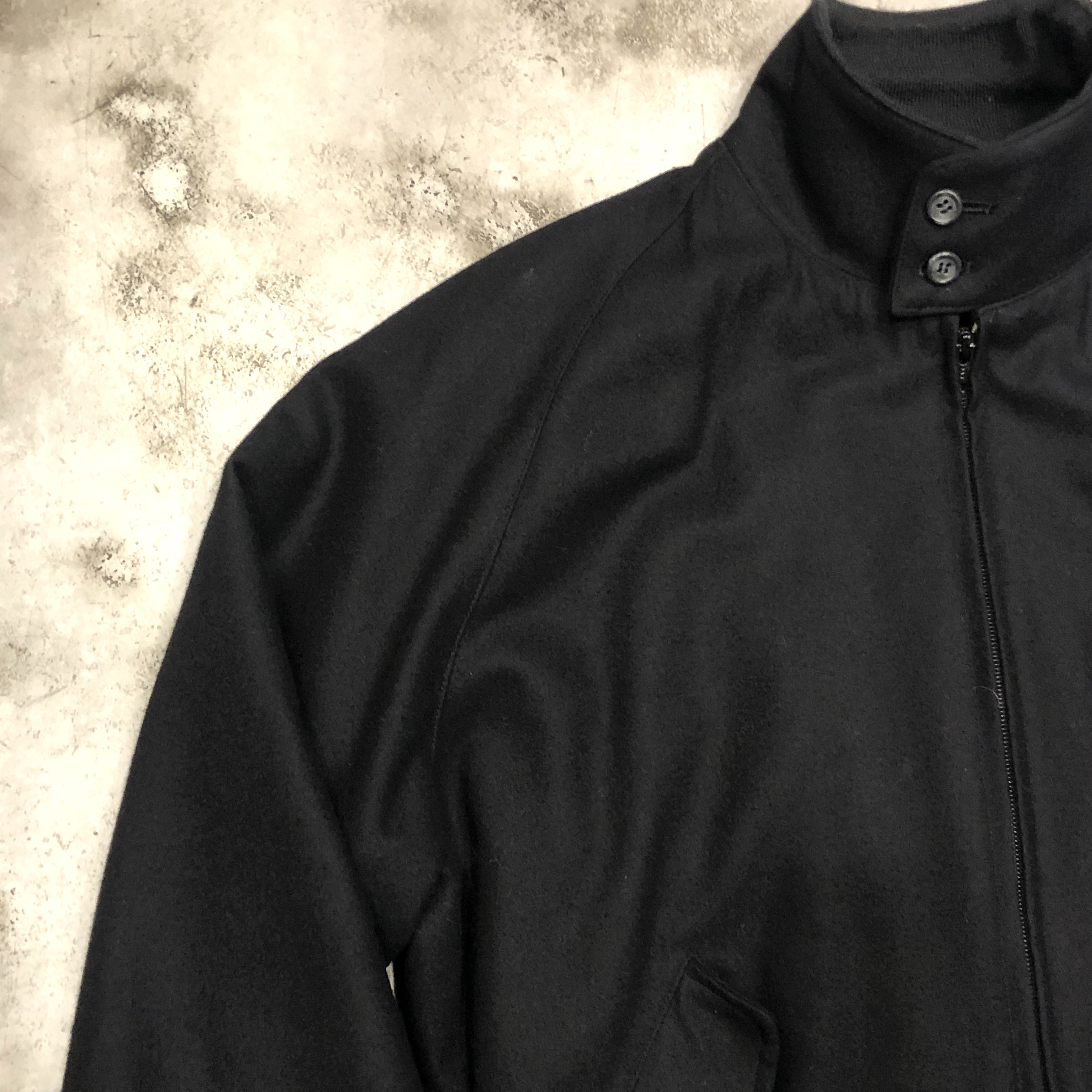 ベースはクラシックなハリントンジャケット。G-9型を踏襲しつつも、こちらはコットンではなくウール主体のファブリックを採用。表記はウール90%・ナイロン10%。しっかりとした肉感がありながらも滑らかで、どこか上品な光沢を感じる生地です。ネイビーというカラーも相まって、非常に落ち着いた大人の佇まいに仕上がっています。