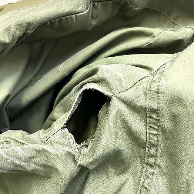 袖の縫製部分にステッチ抜けがあり、右脇裏地に破れがございます。