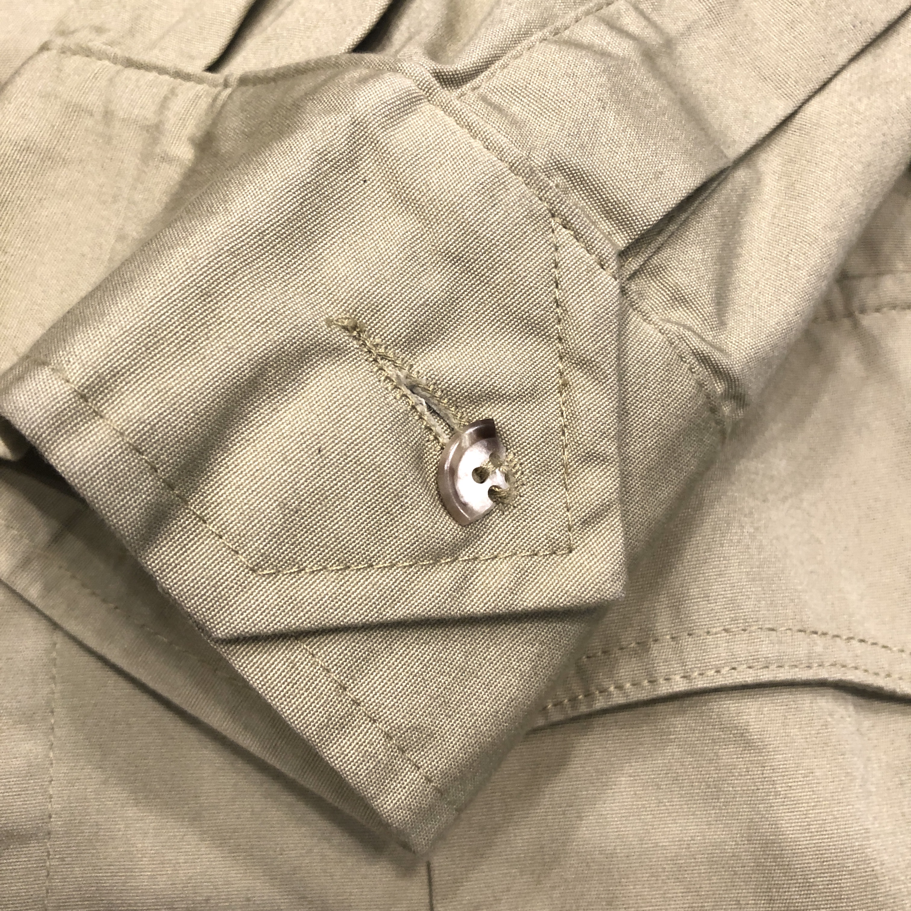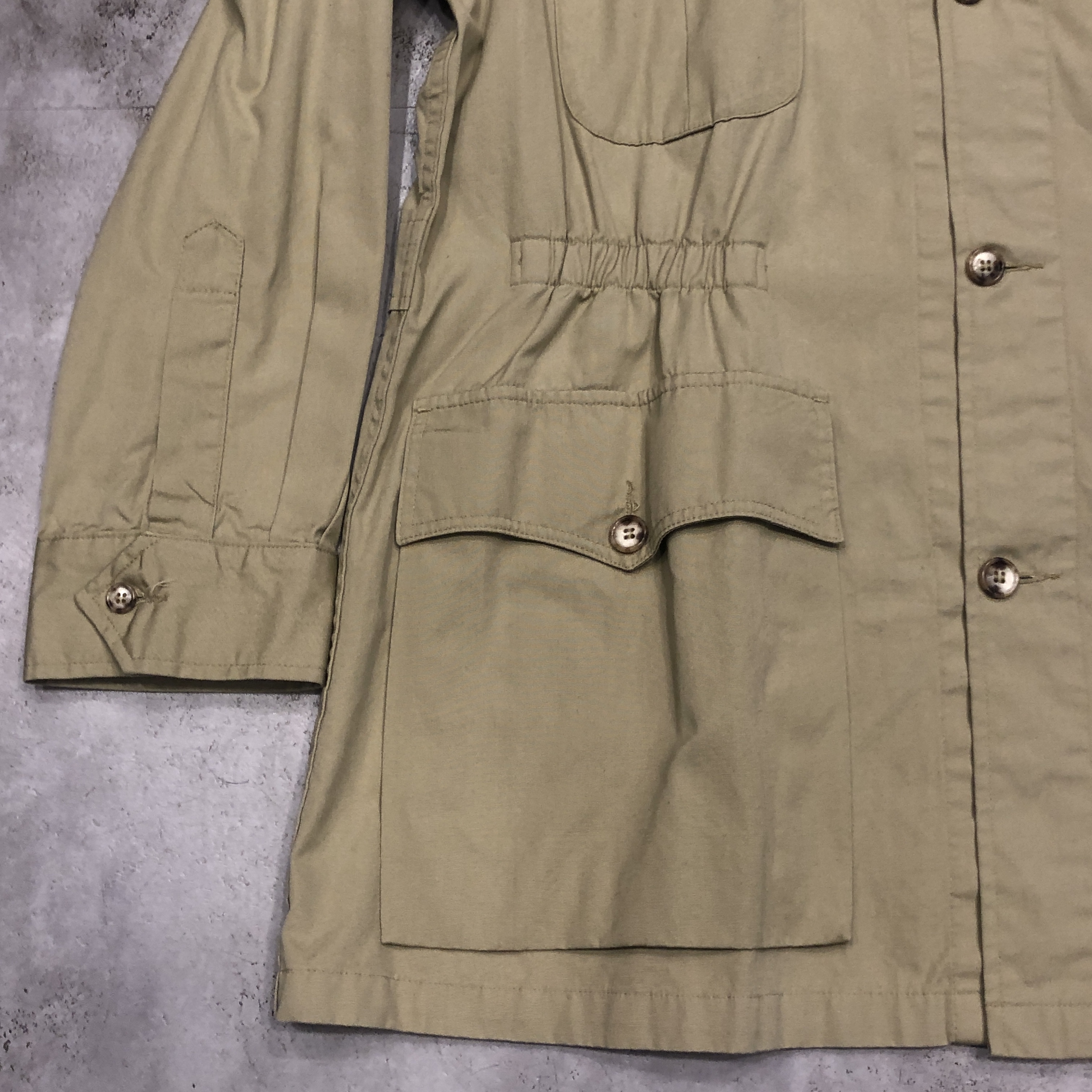 表地はウィリス&ガイガー伝統の“コットン・ブッシュポプリン”。7.5オンスという厚みを持ちながら、しなやかで水にも強く、経年で美しい表情を見せてくれます。4つの大型フラップポケット、肩のキルティング補強、絶妙なウエストギャザー、ミリタリージャケット譲りのショルダーループなど、随所に機能美が溢れるディテール。内タグには当時から変わらぬ開発コンセプトが誇らしげに記されています。