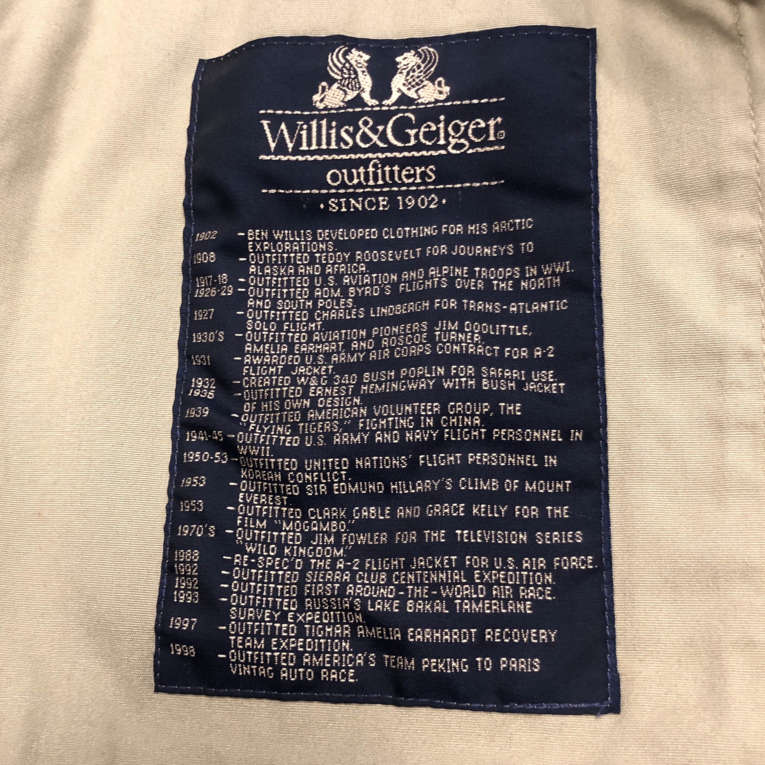 - WILLIS&GEIGERというブランド名が持つ響きだけで、冒険者の血が騒ぐ。1902年創業の老舗アウトフィッターが、世界中の探検家・冒険家・アウトドアズマンのために生み出したのが、まさにこの“ヘミングウェイ・ジャケット”。その名の通り、ノーベル文学賞作家・アーネスト・ヘミングウェイのために設計されたフィールドウェアであり、アフリカ・サファリやアマゾンの密林、北米の山岳地帯など、過酷なフィールドで信頼され続けた本物の一着です。