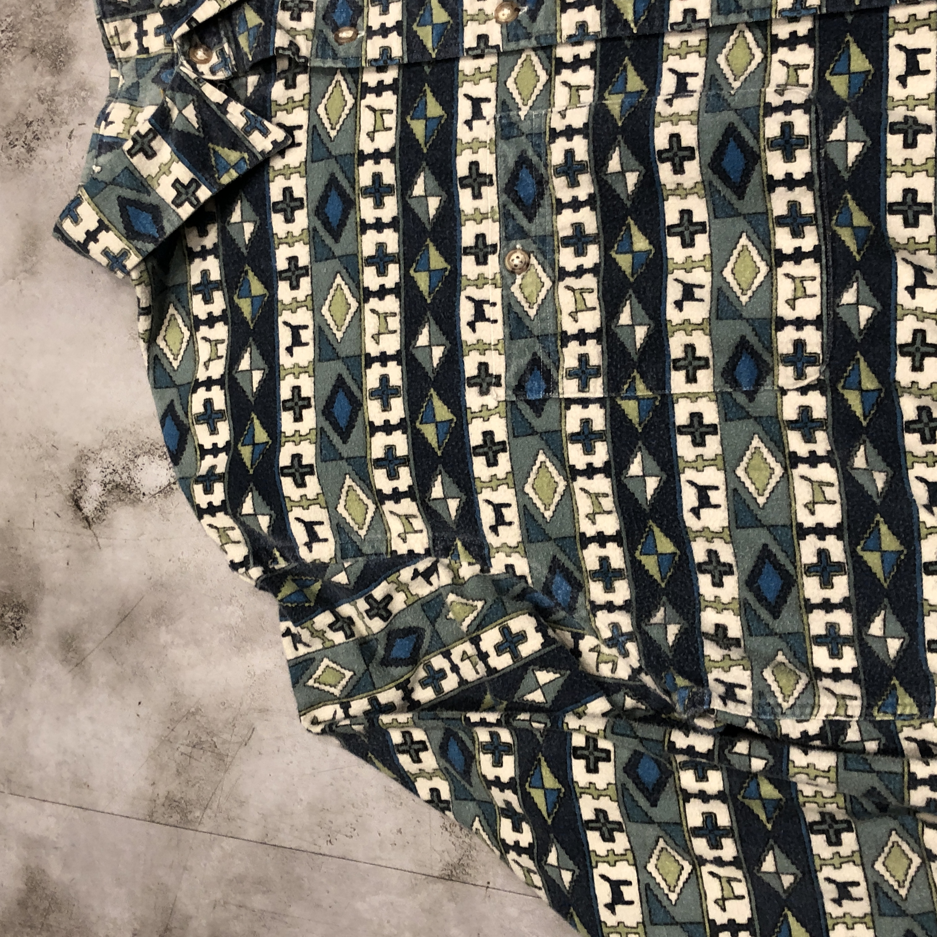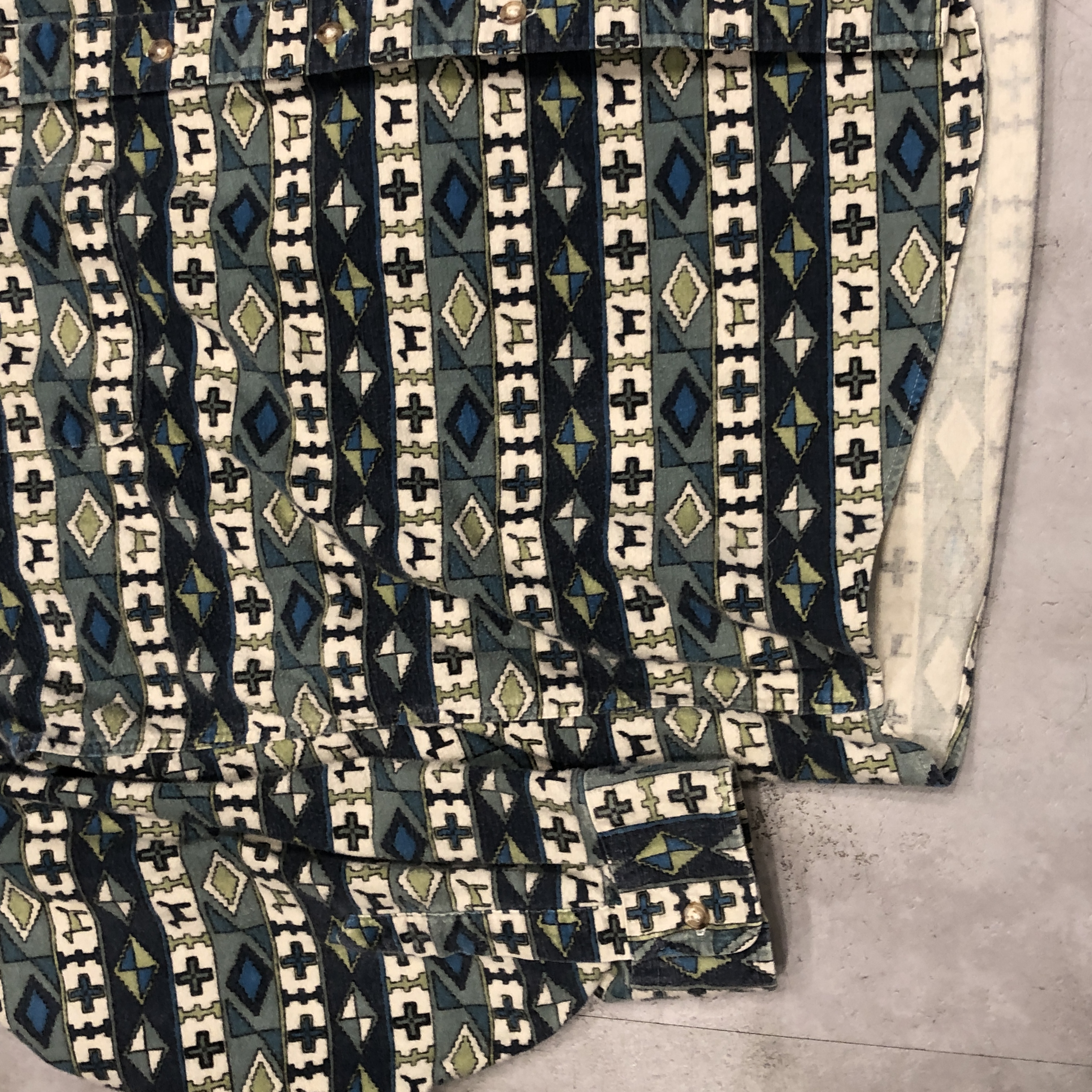 特徴的なのはこの柄。クロスモチーフやダイヤ柄、小さな動物のようなアイコンが規則的に並び、ネイティブ文様をベースにしながらも、どこか抽象的で洗練された印象。