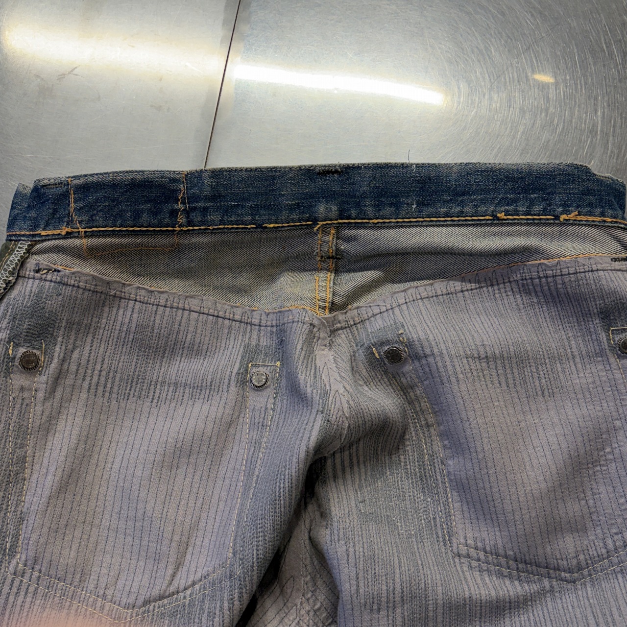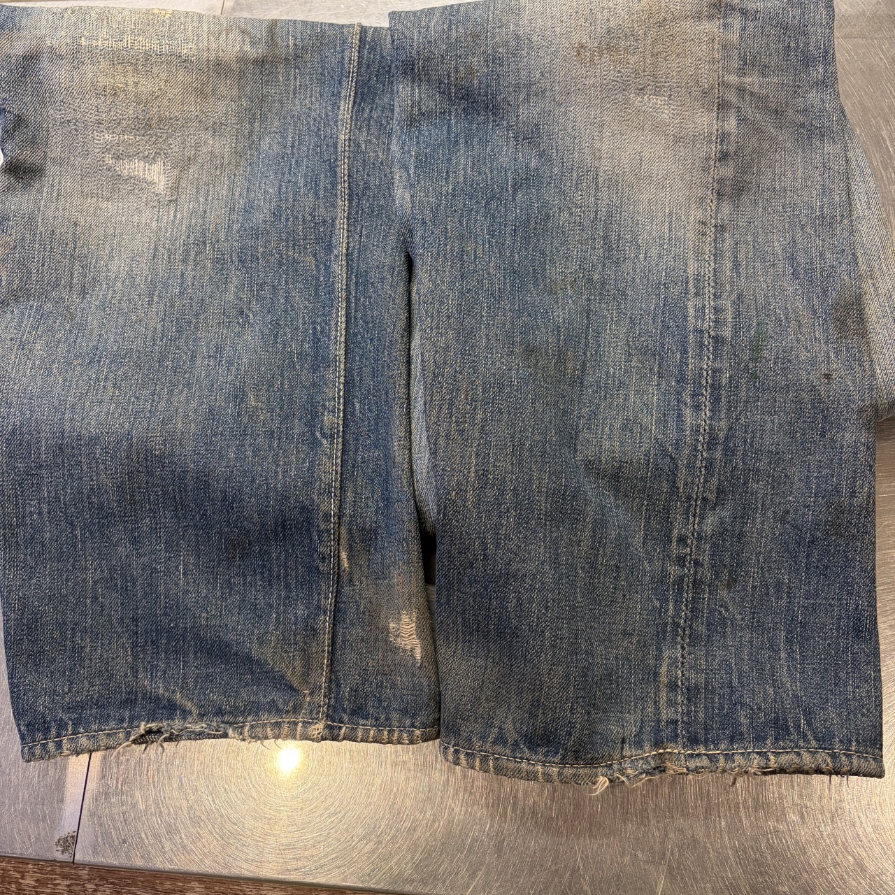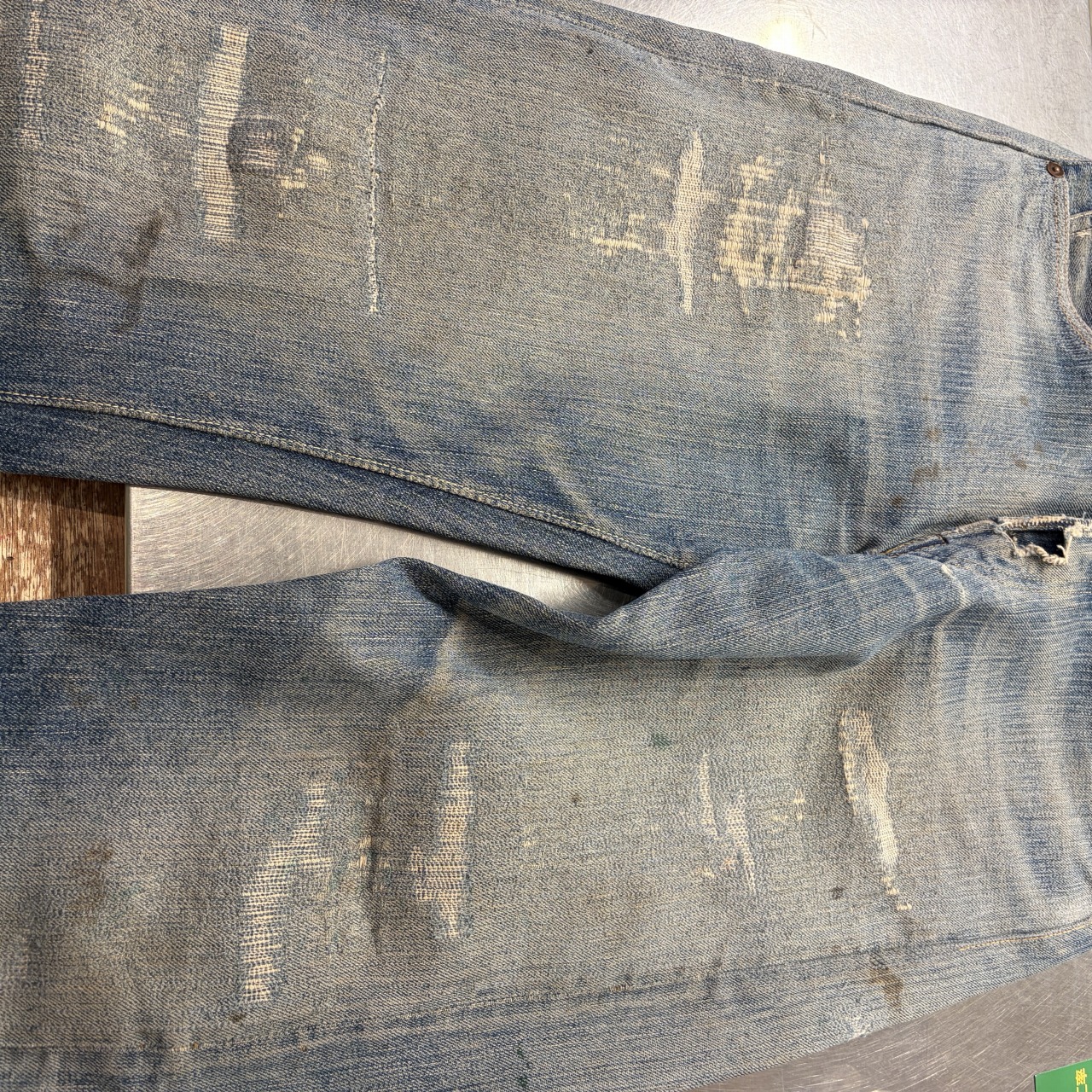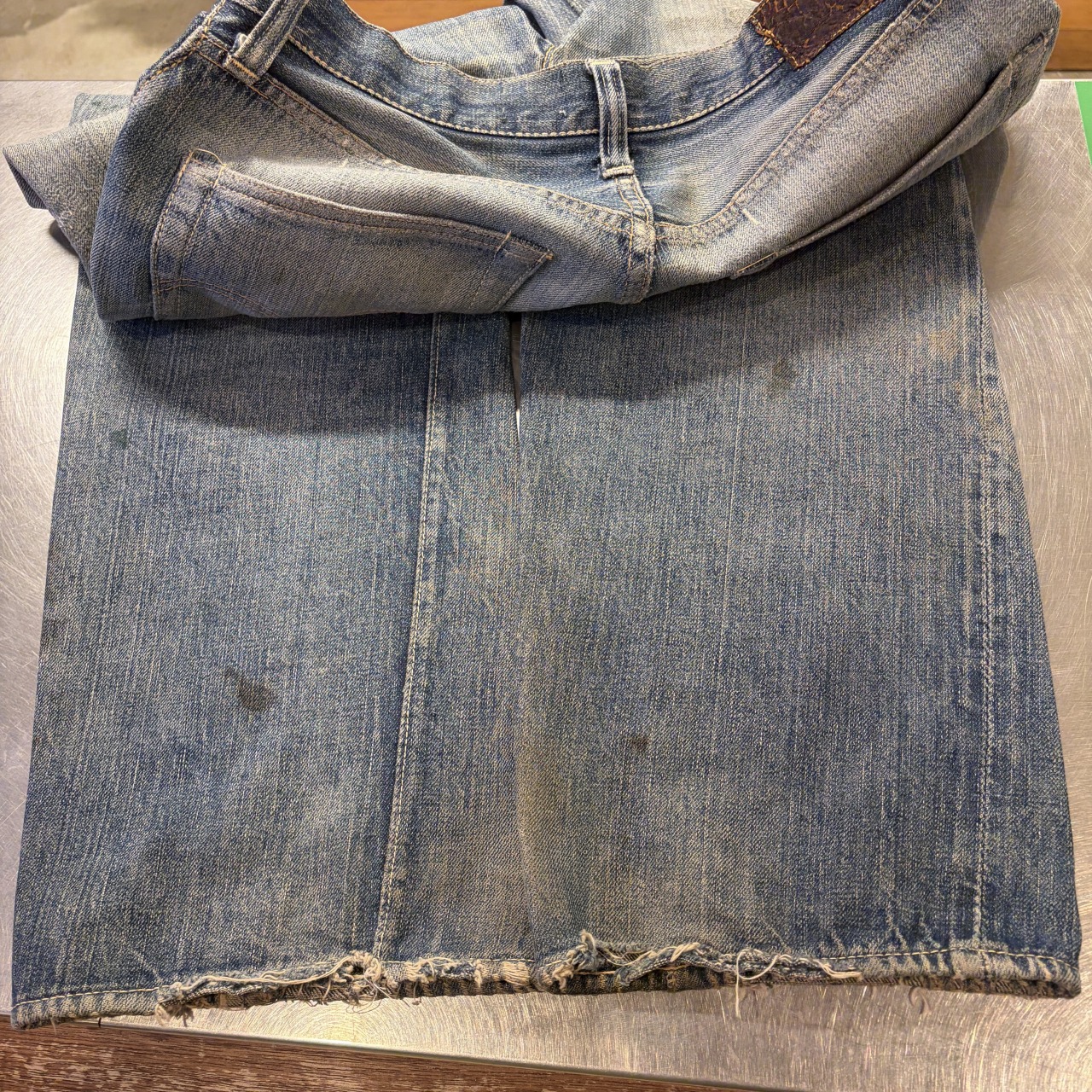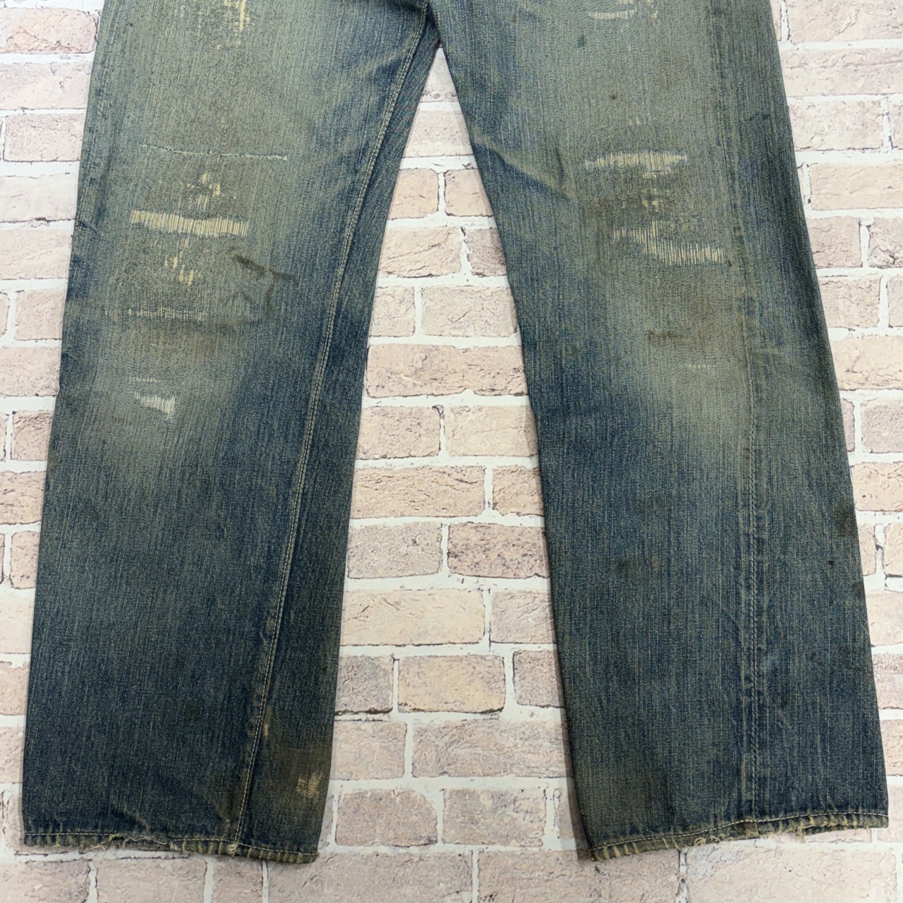 - 全体的にダメージや汚れがあり着用感ございます。リペア、リメイクも全体的にされており、ボタン等も付け替えられています。