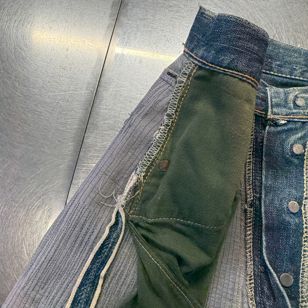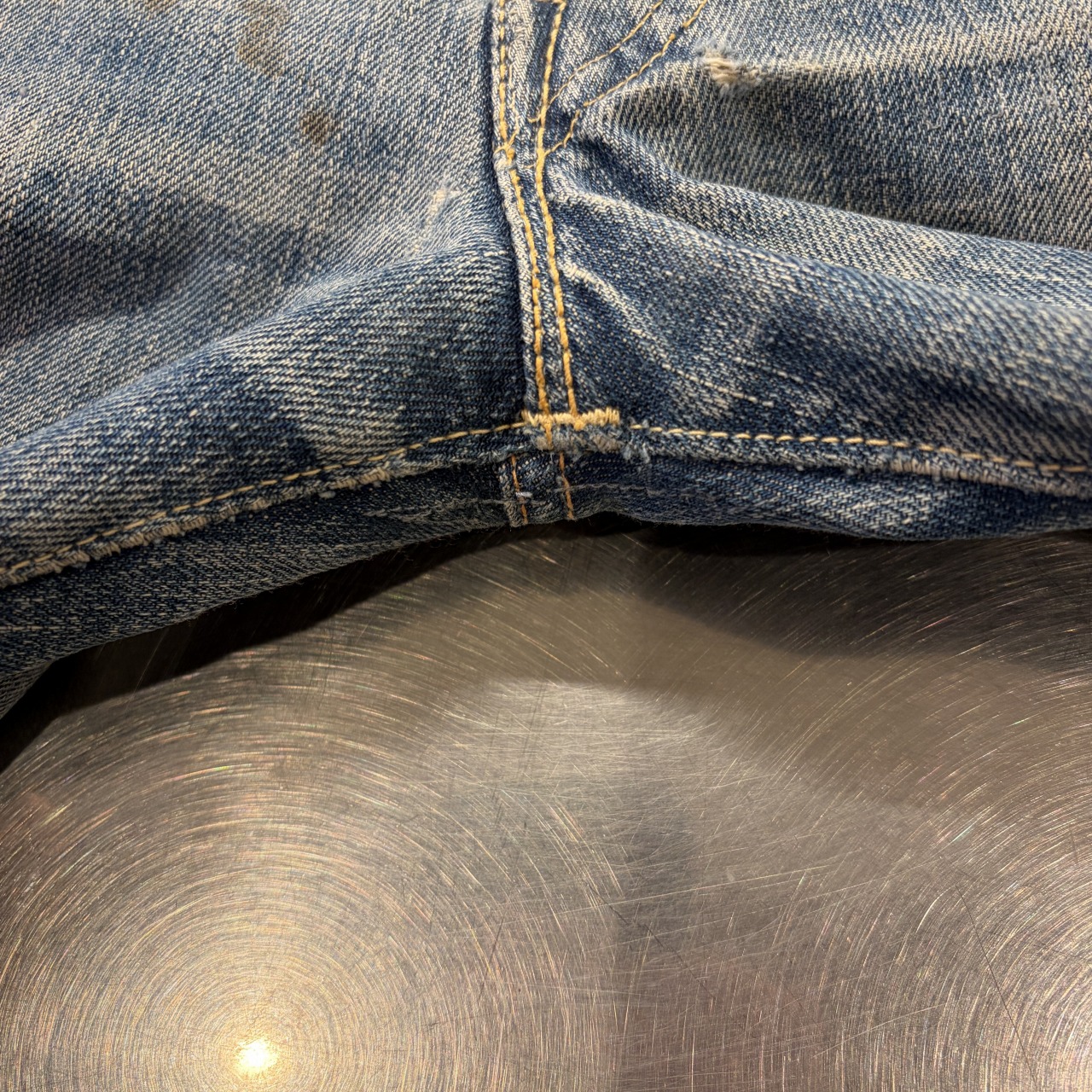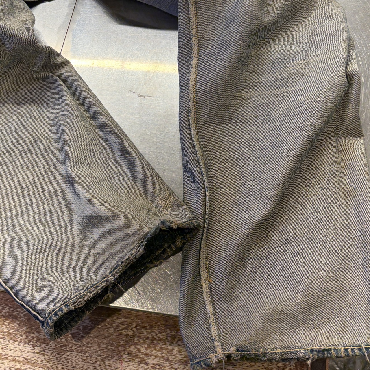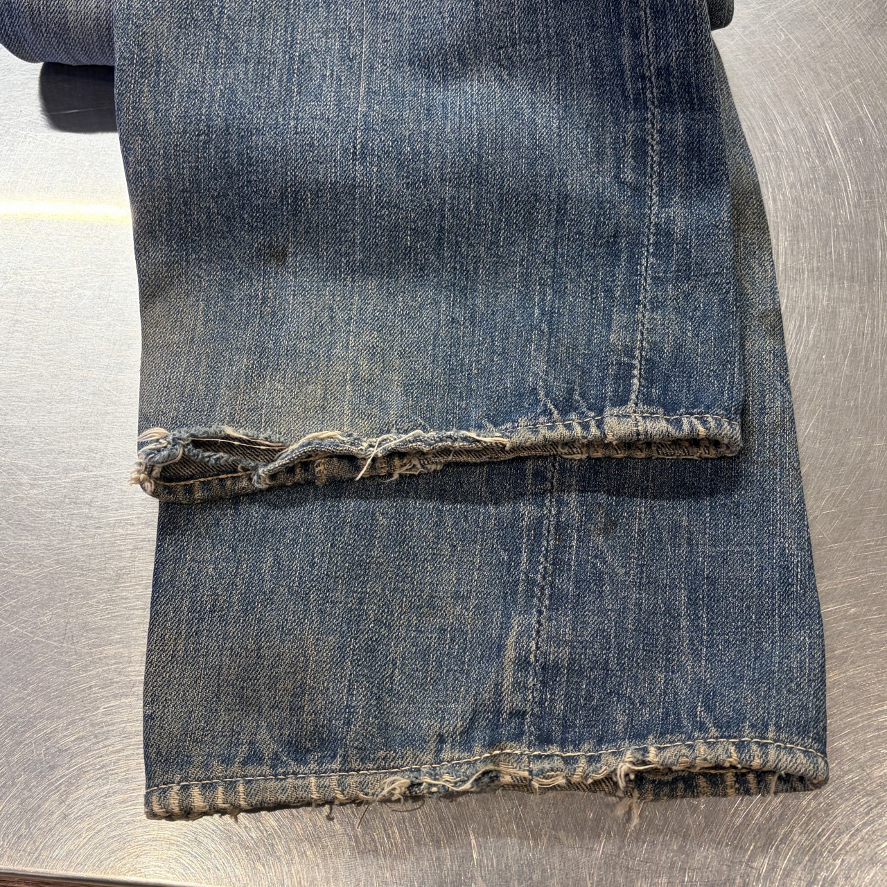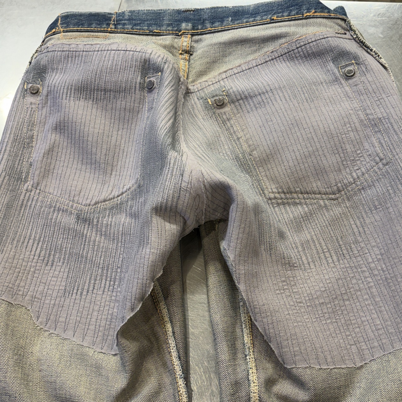 - 全体的にダメージや汚れがあり着用感ございます。リペア、リメイクも全体的にされており、ボタン等も付け替えられています。