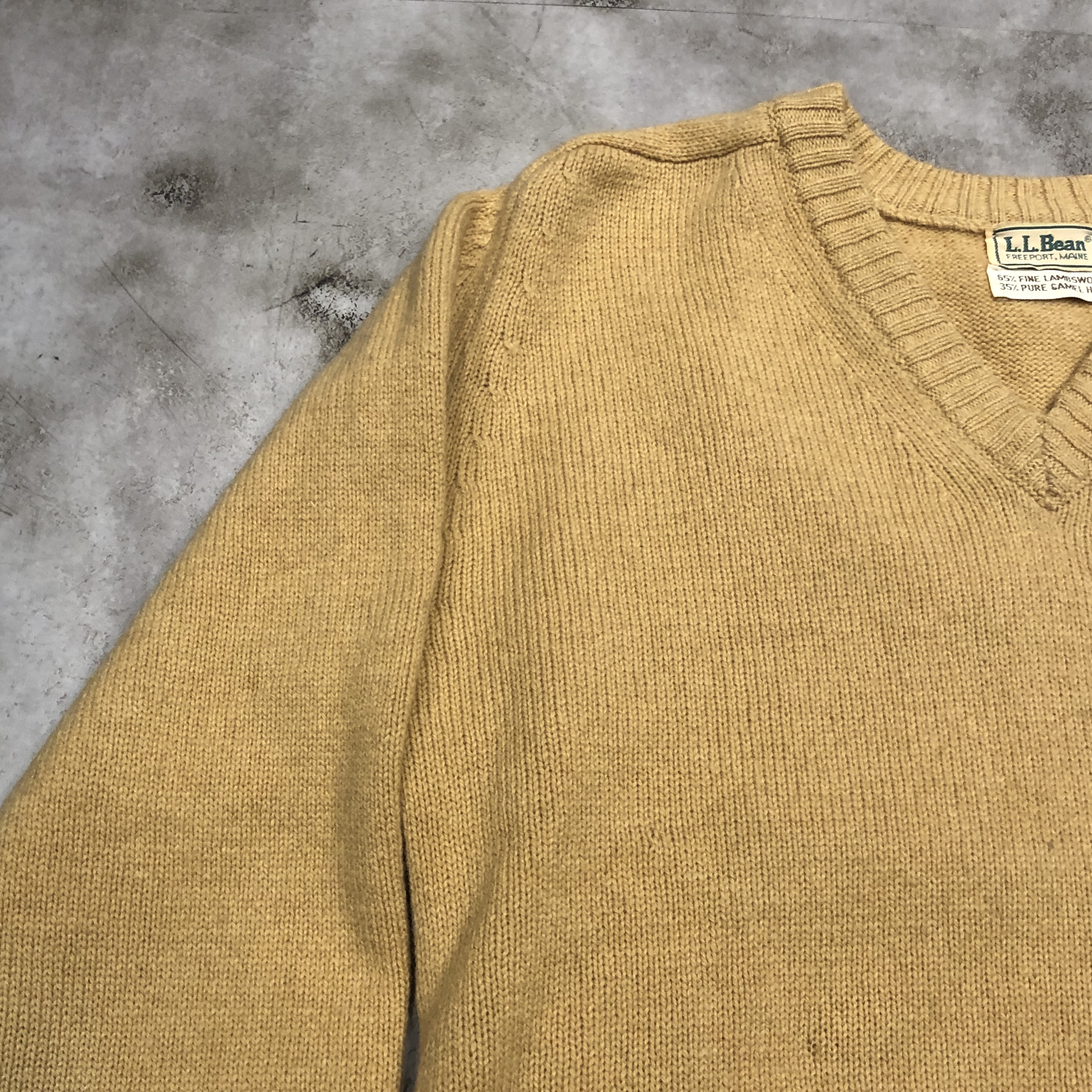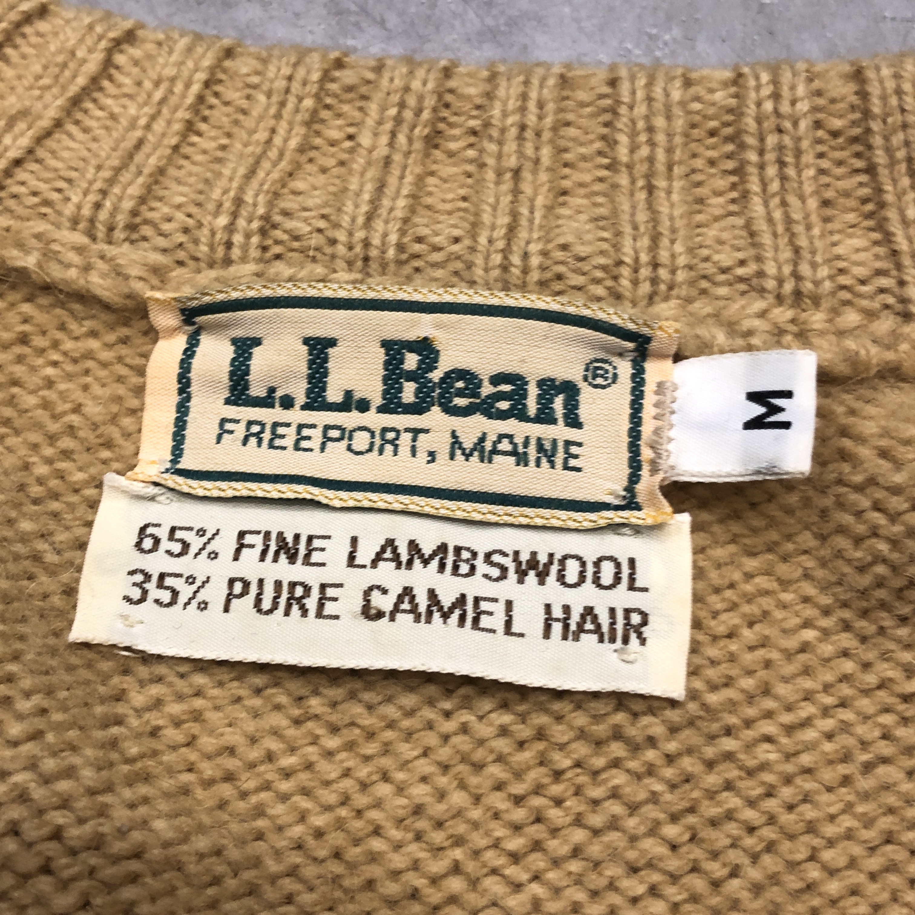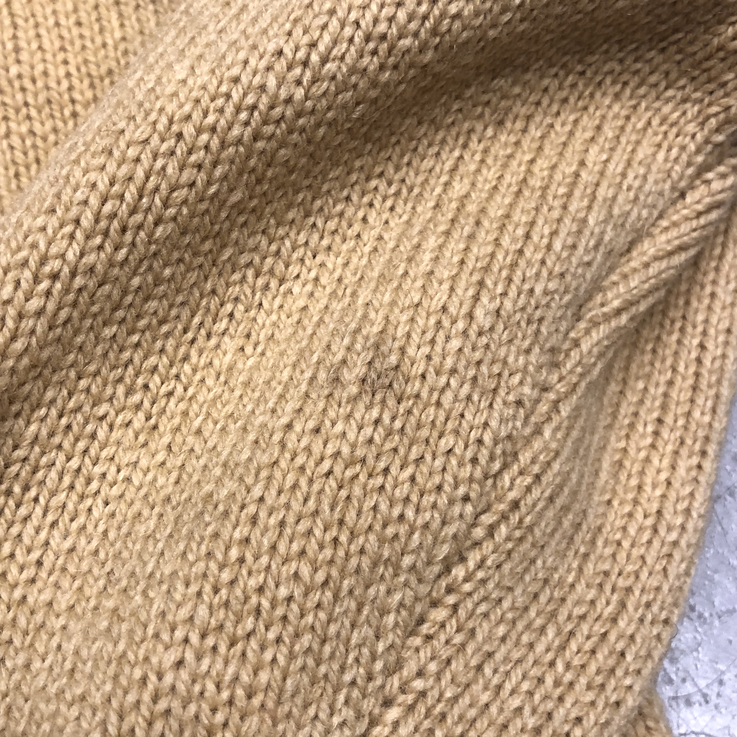 タグ表記からも確認できる通り、素材は65%ファインラムズウール × 35%ピュアキャメルヘア。この配合がとにかく秀逸で、単なるウールニットとは一線を画す質感を持っています。