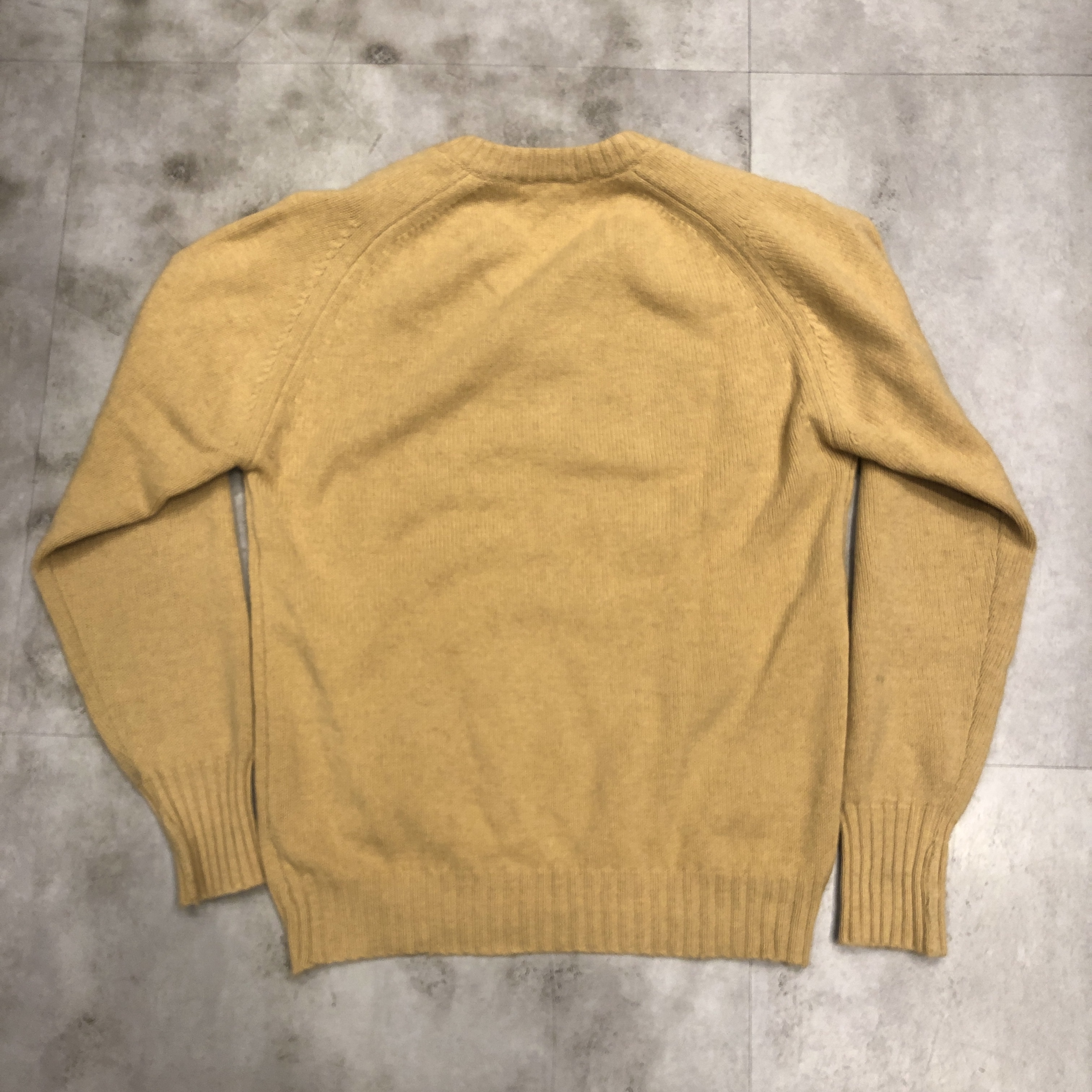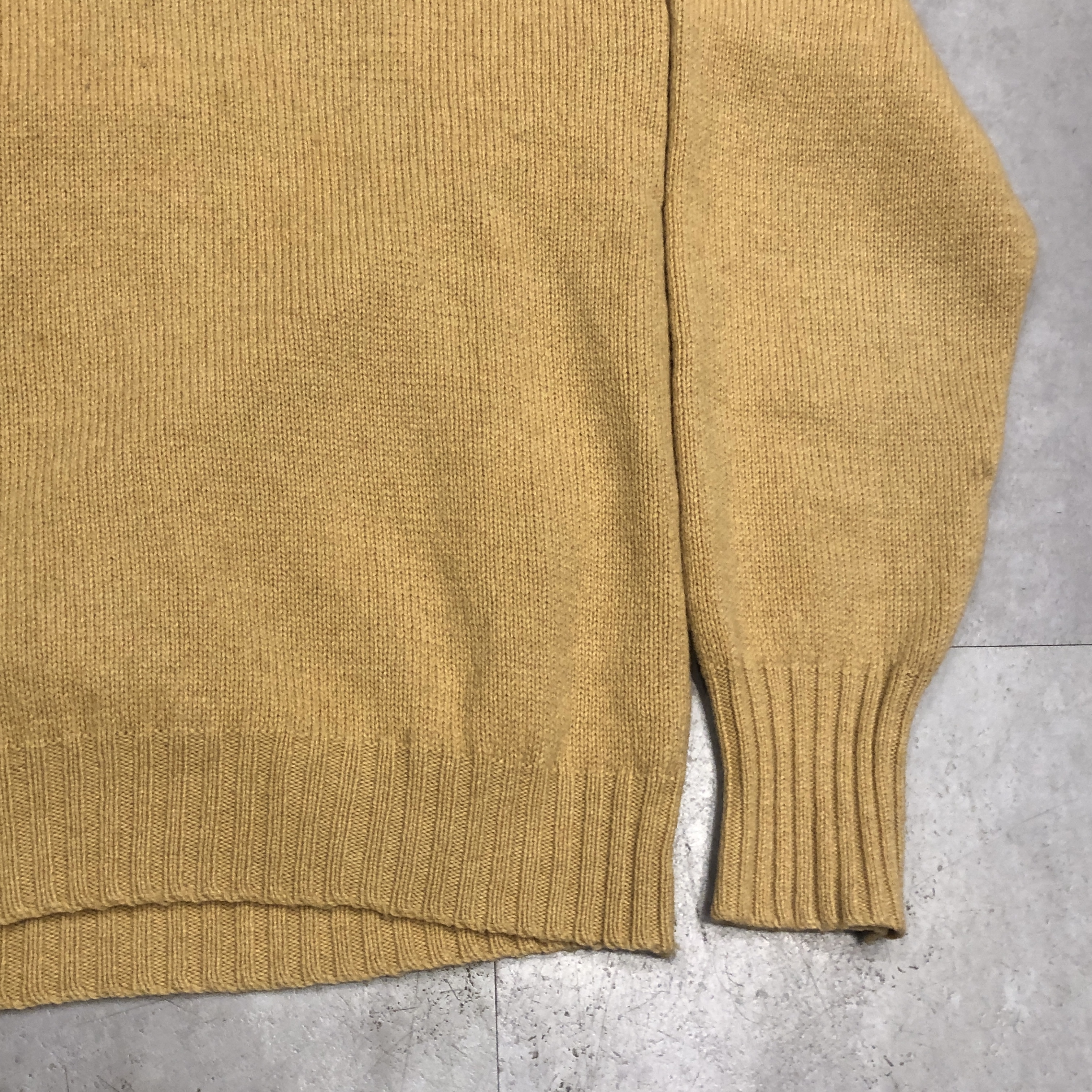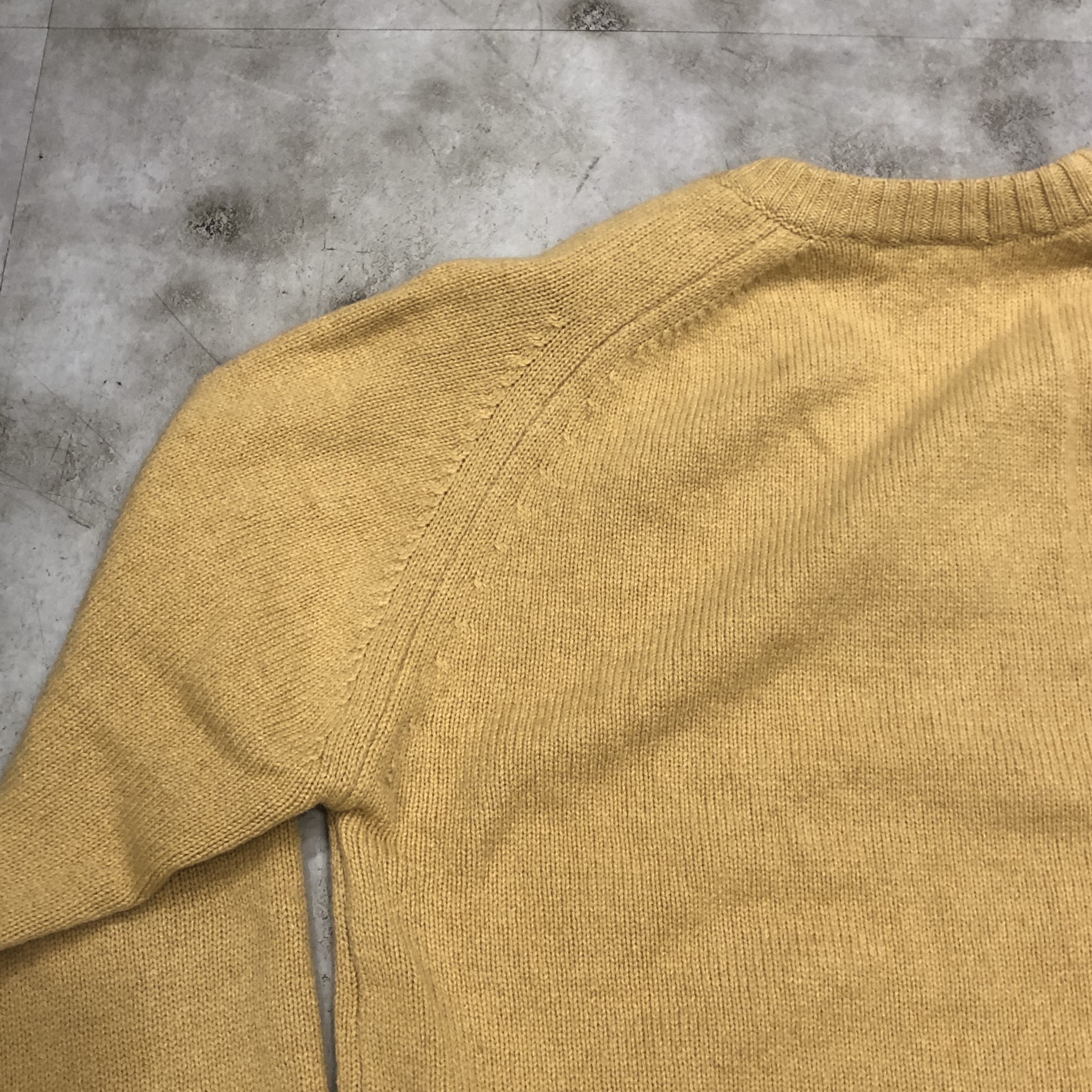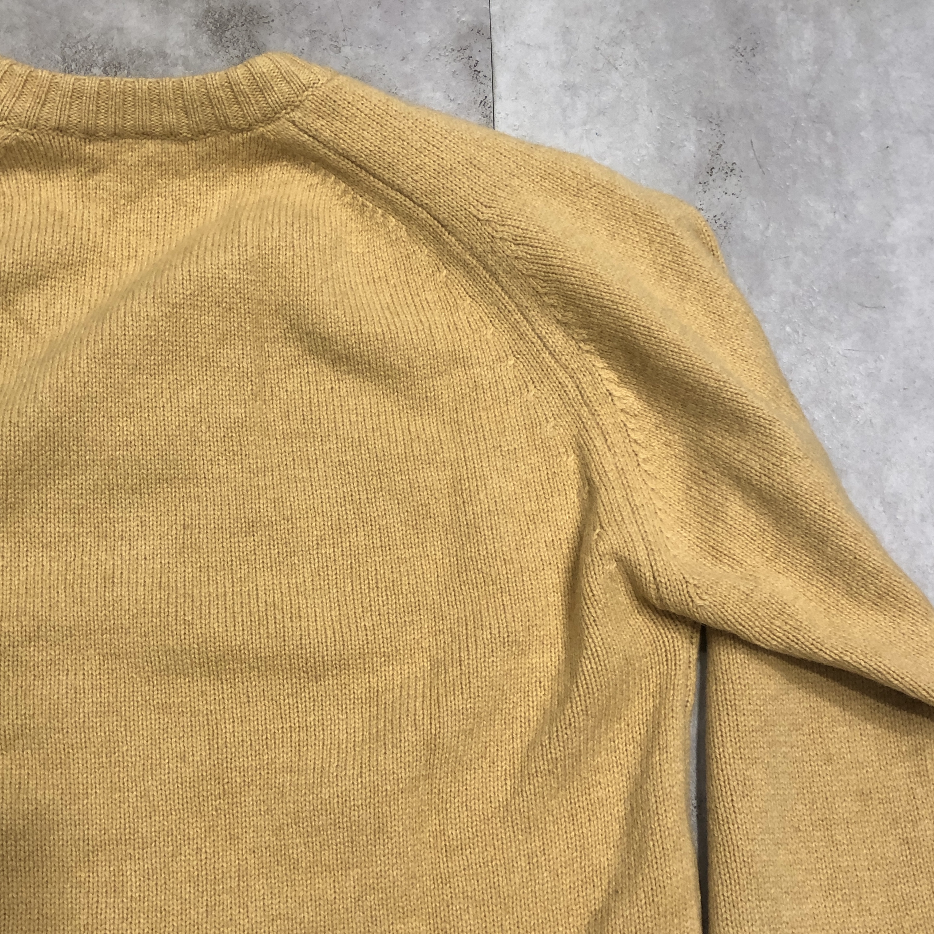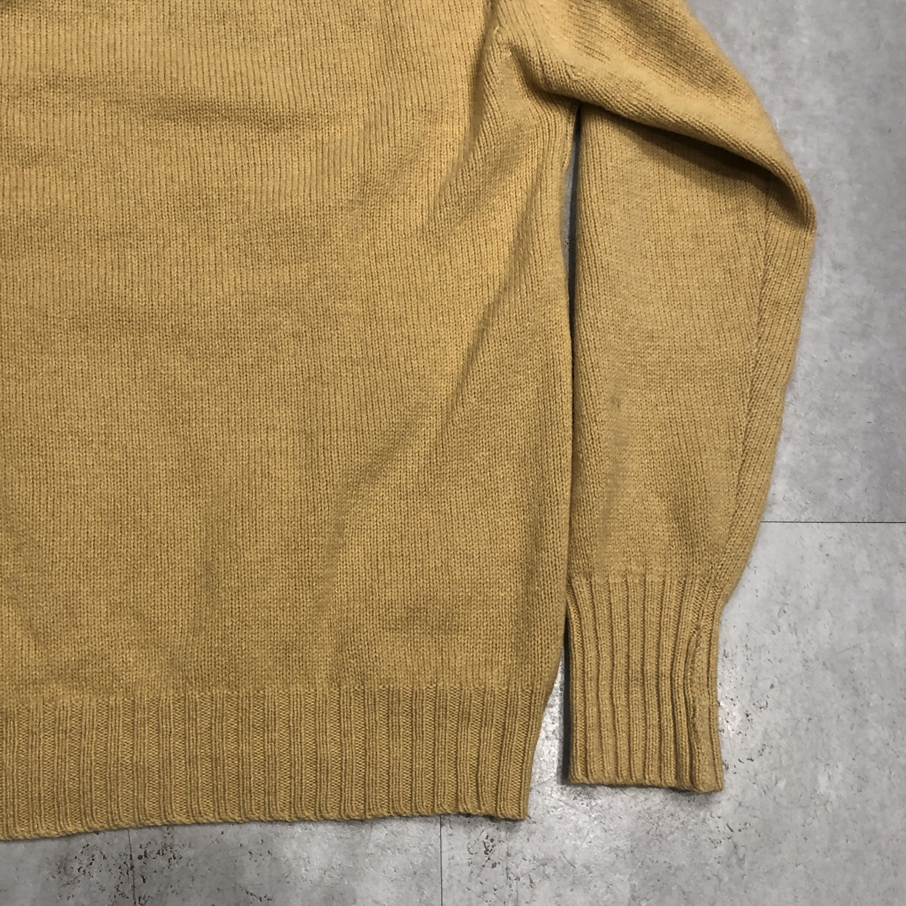 カラーは、いわゆるキャメルベージュですが、やや黄味を帯びたこのトーンは、どこかヴィンテージらしい深みを感じさせる色合い。シンプルなVネックだからこそ、この色と素材の良さがダイレクトに伝わってきます。