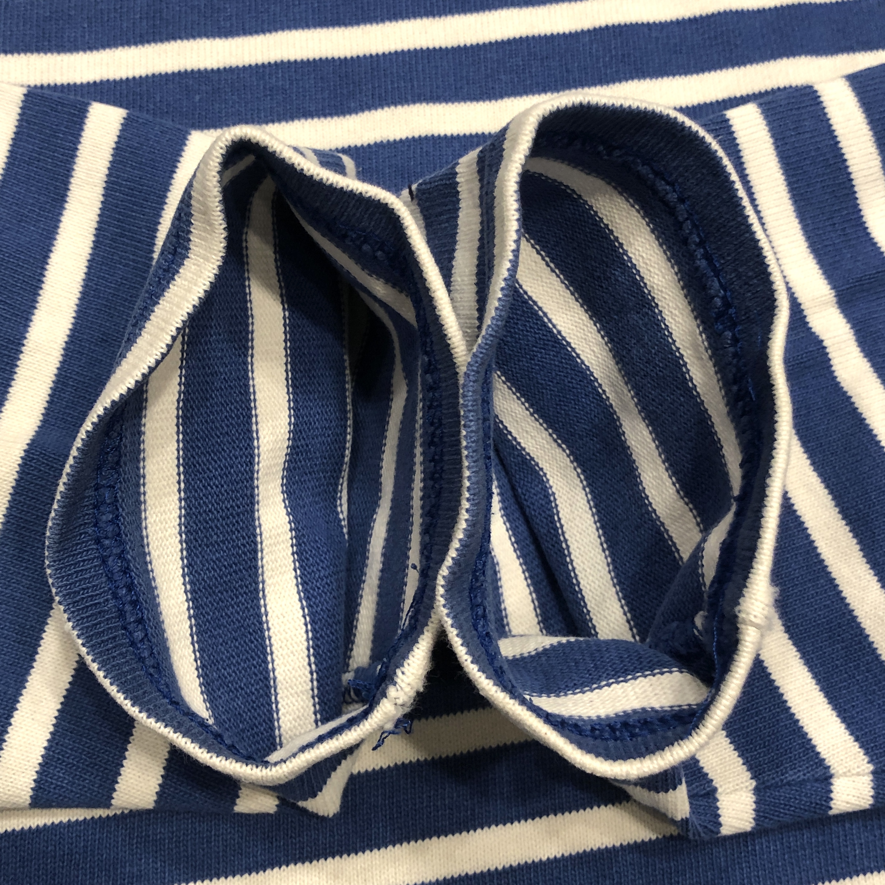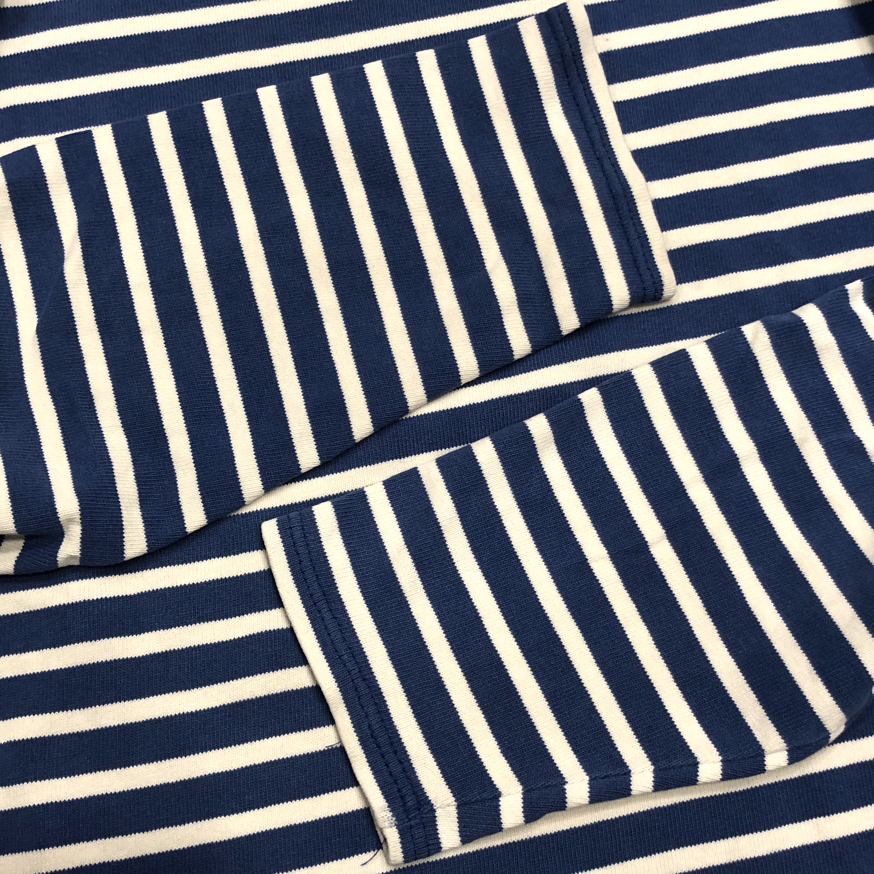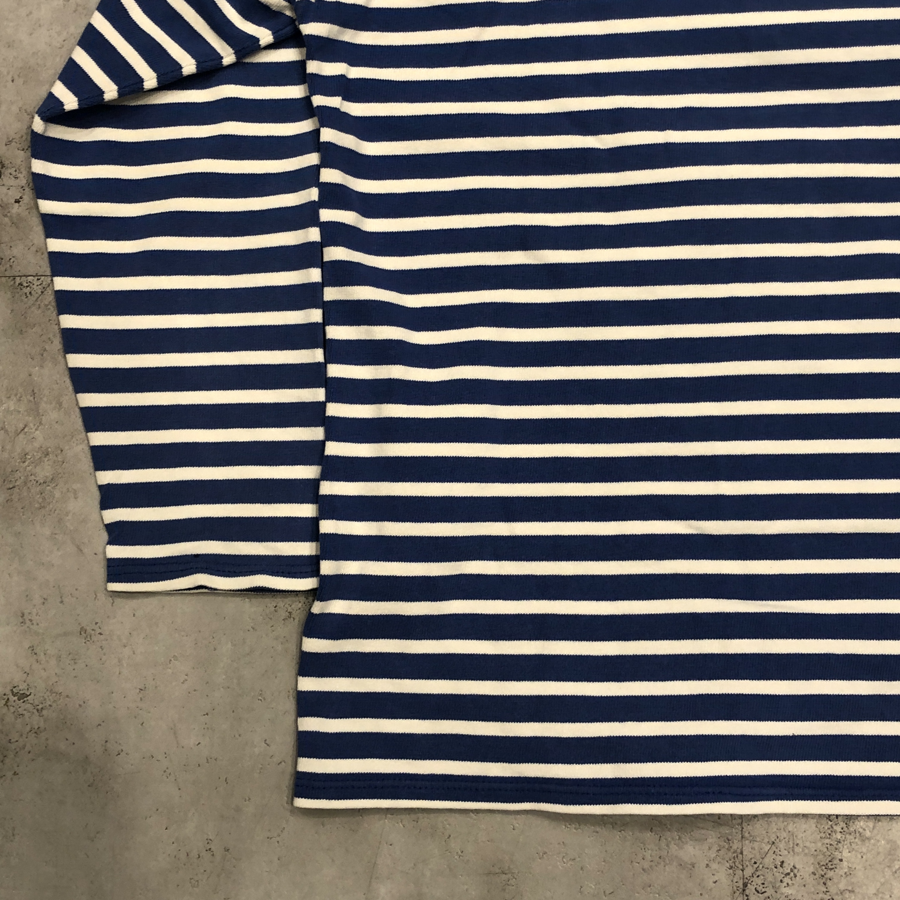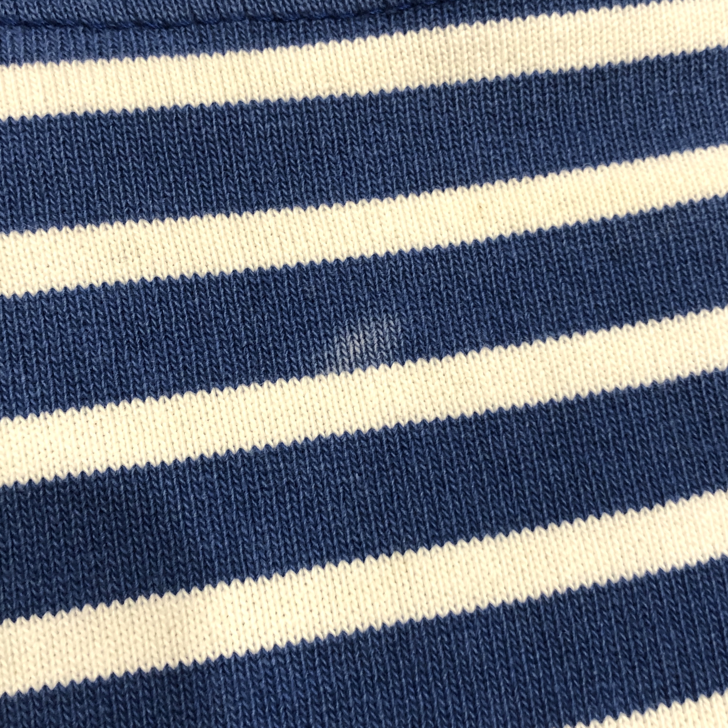 今回ご紹介するのは永遠の定番、ブルー/ ホワイトのボーダーカラー。ミリタリーやワークスタイルにも馴染み、カジュアルからシックまで幅広く対応します。素材は100%コットンの目の詰まった天竺生地。着始めはしっかりとした張り感があり、洗い込むことで徐々に柔らかく、肌馴染みの良い風合いへと育っていきます。