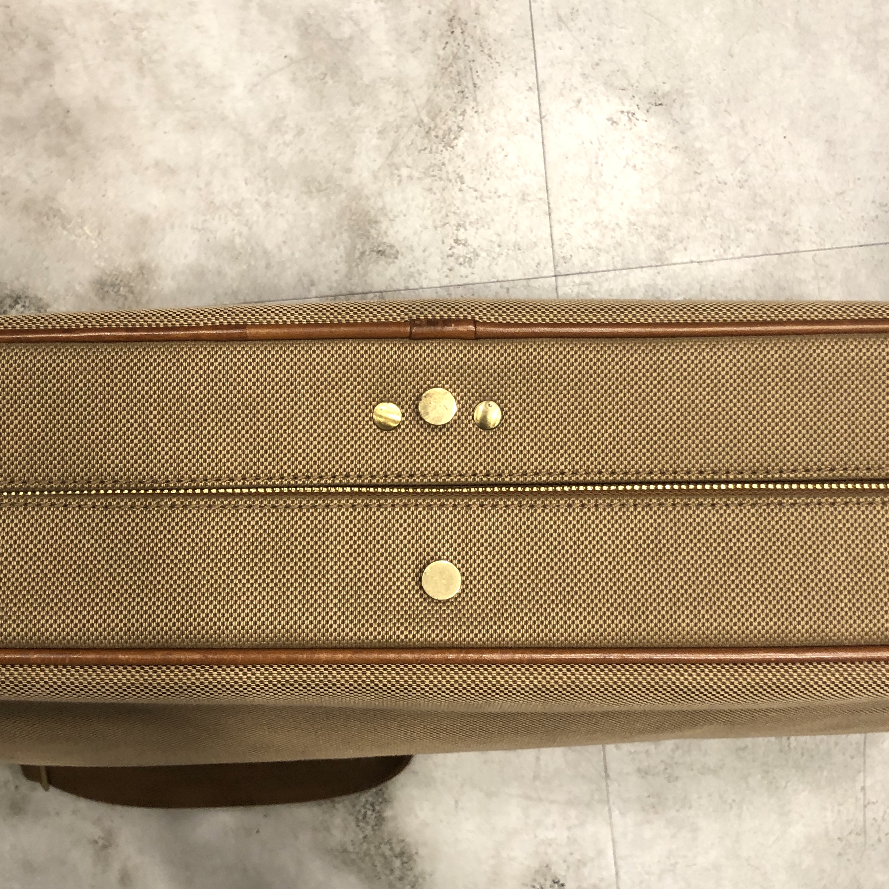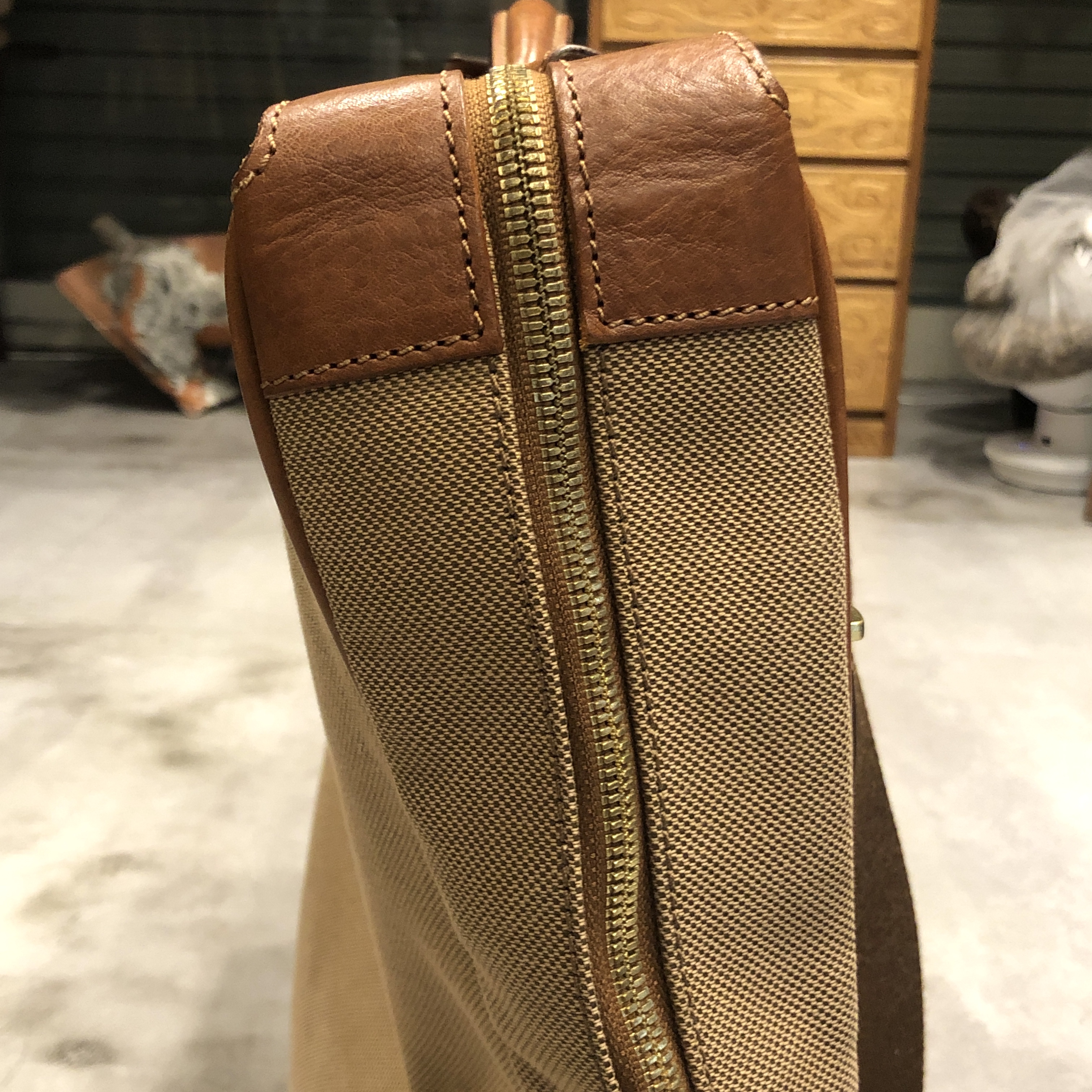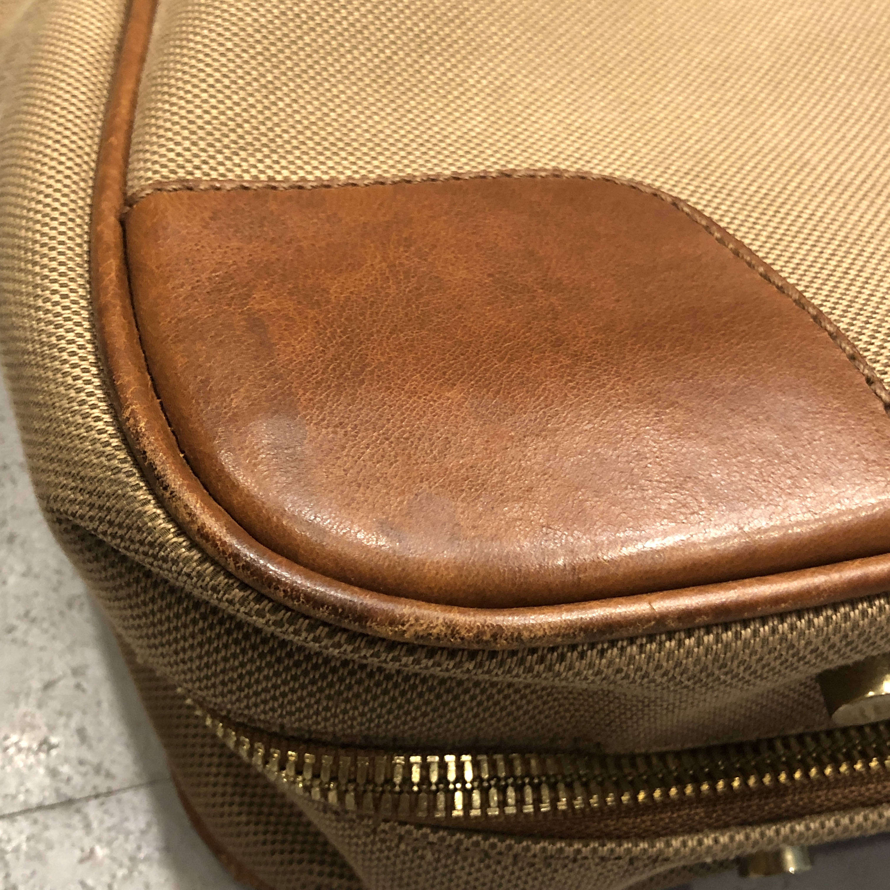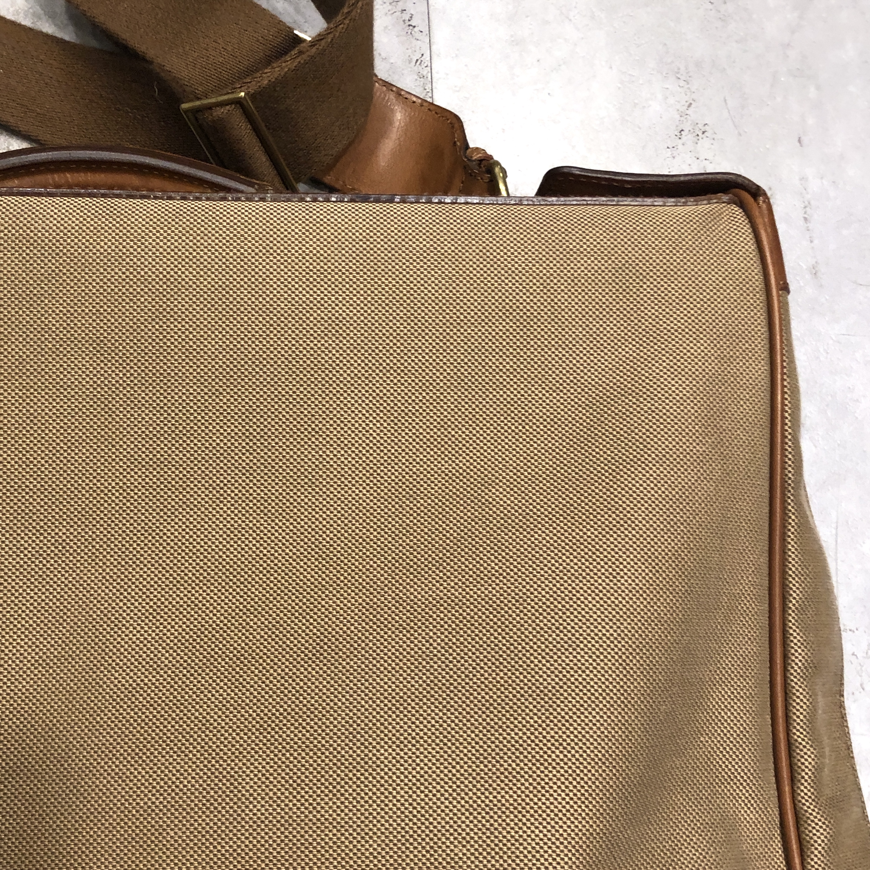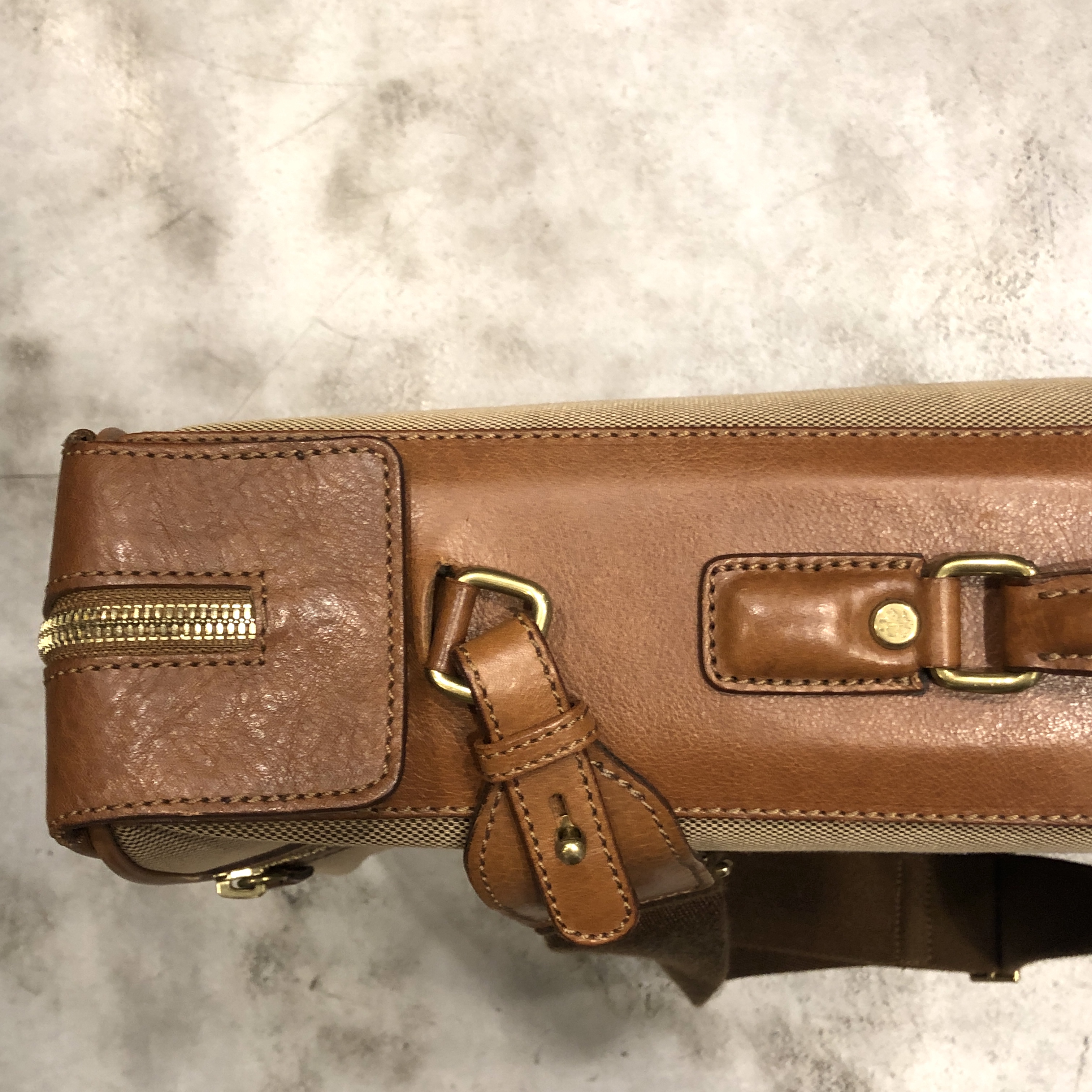 ベージュベースのボディに、ブラウンレザーのトリミング。