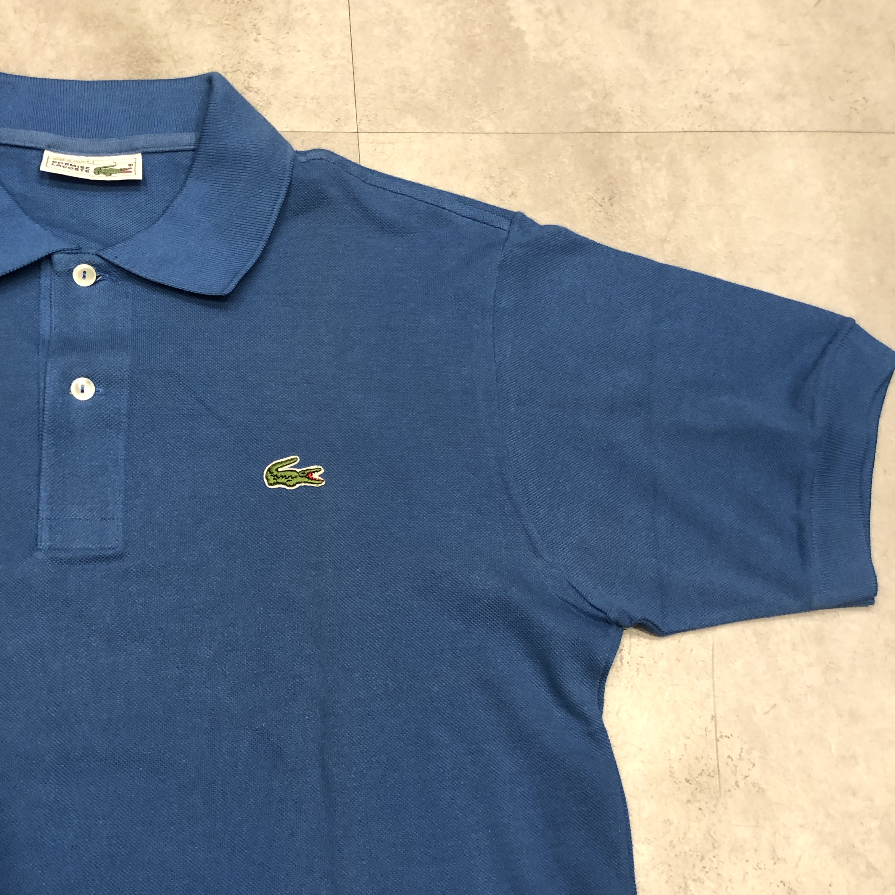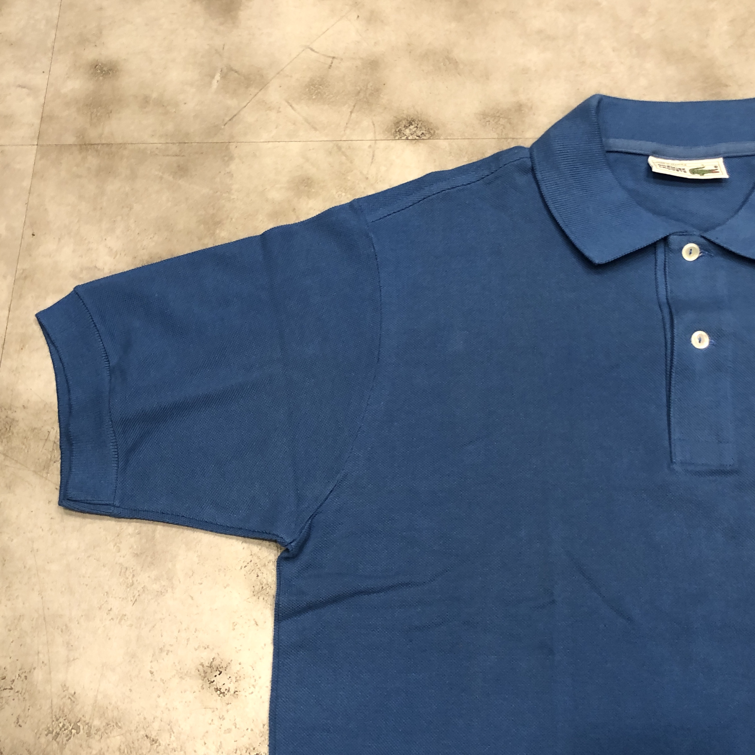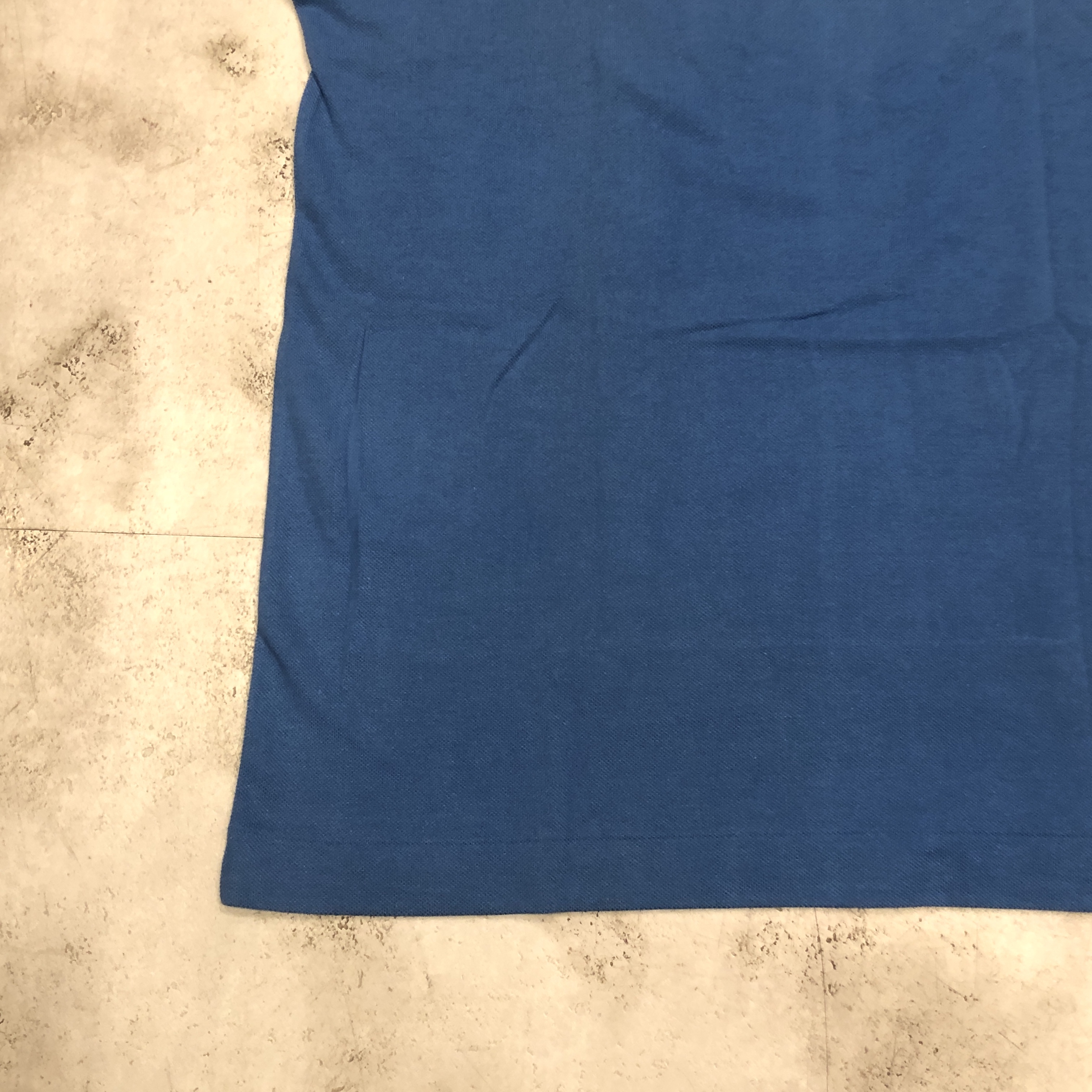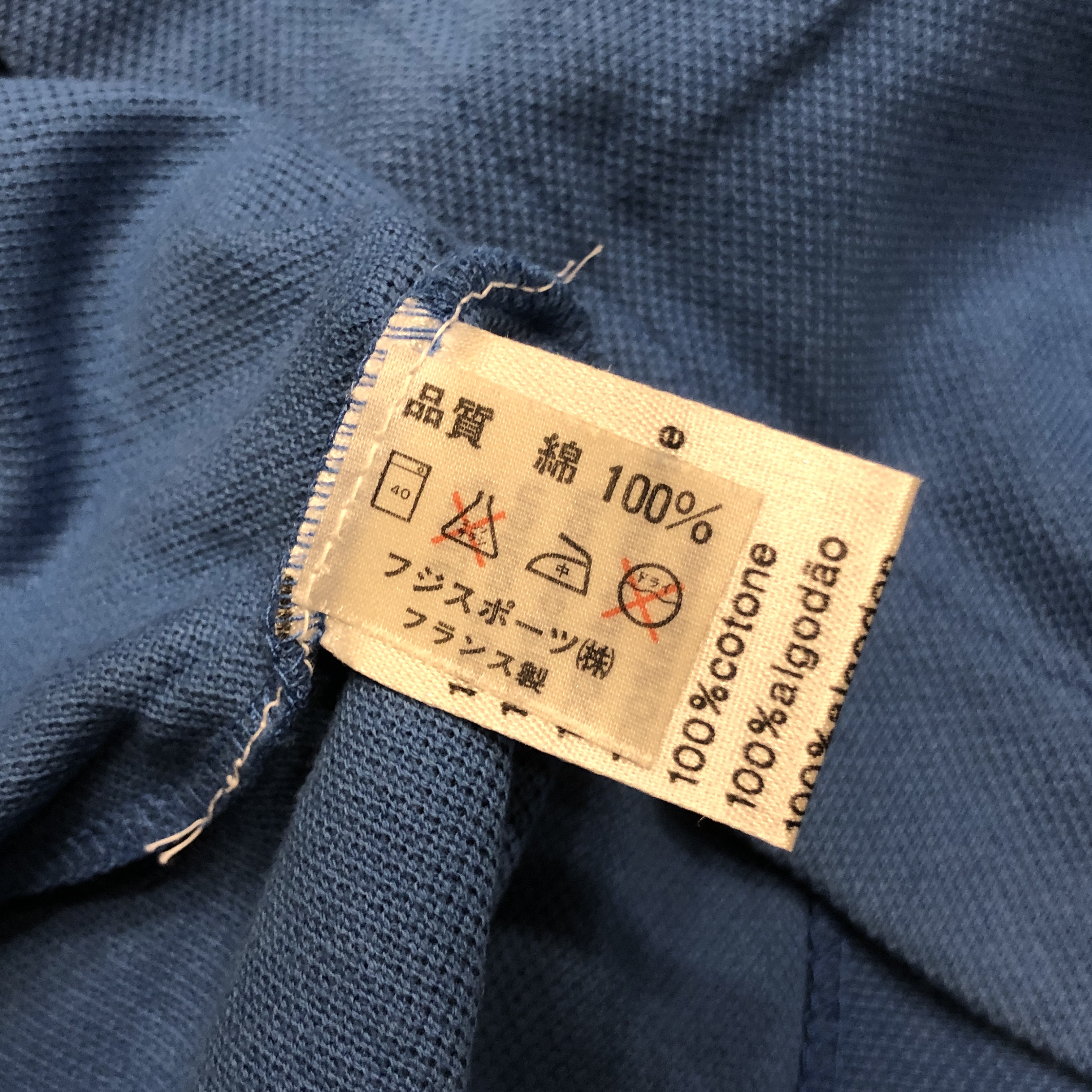 こちらはシックなブルーカラー、タグ表記“4”サイズの一着。ブランドのアイコンとも言えるワニのワッペンが胸元にしっかりと鎮座し、さりげなく存在感を放っています。