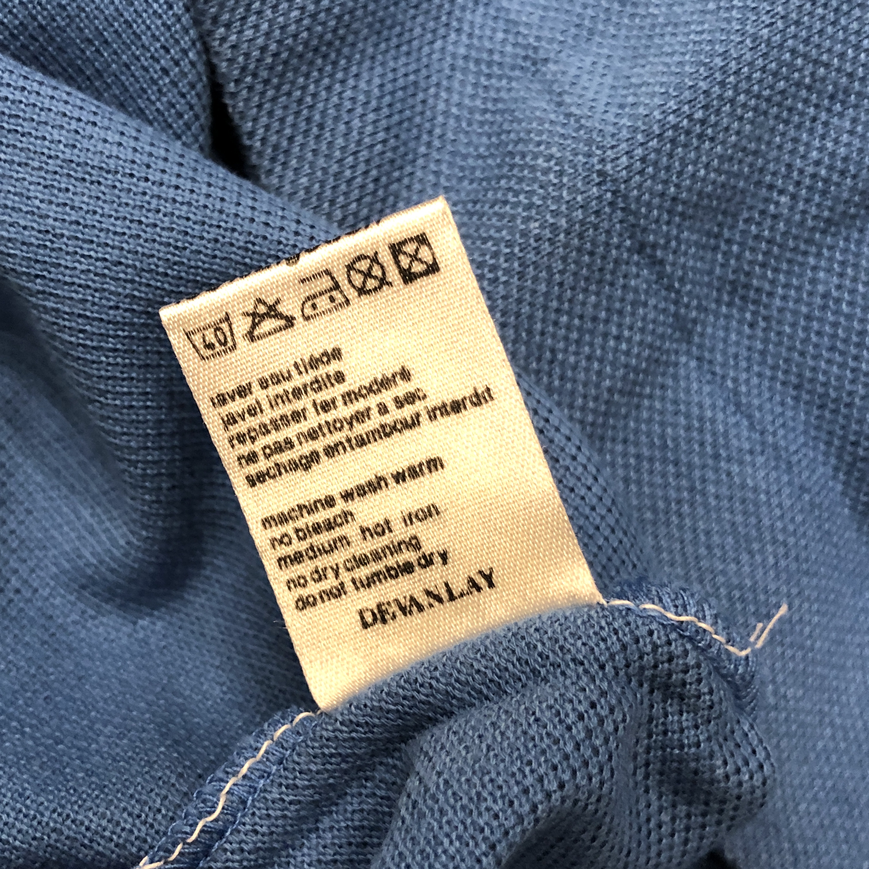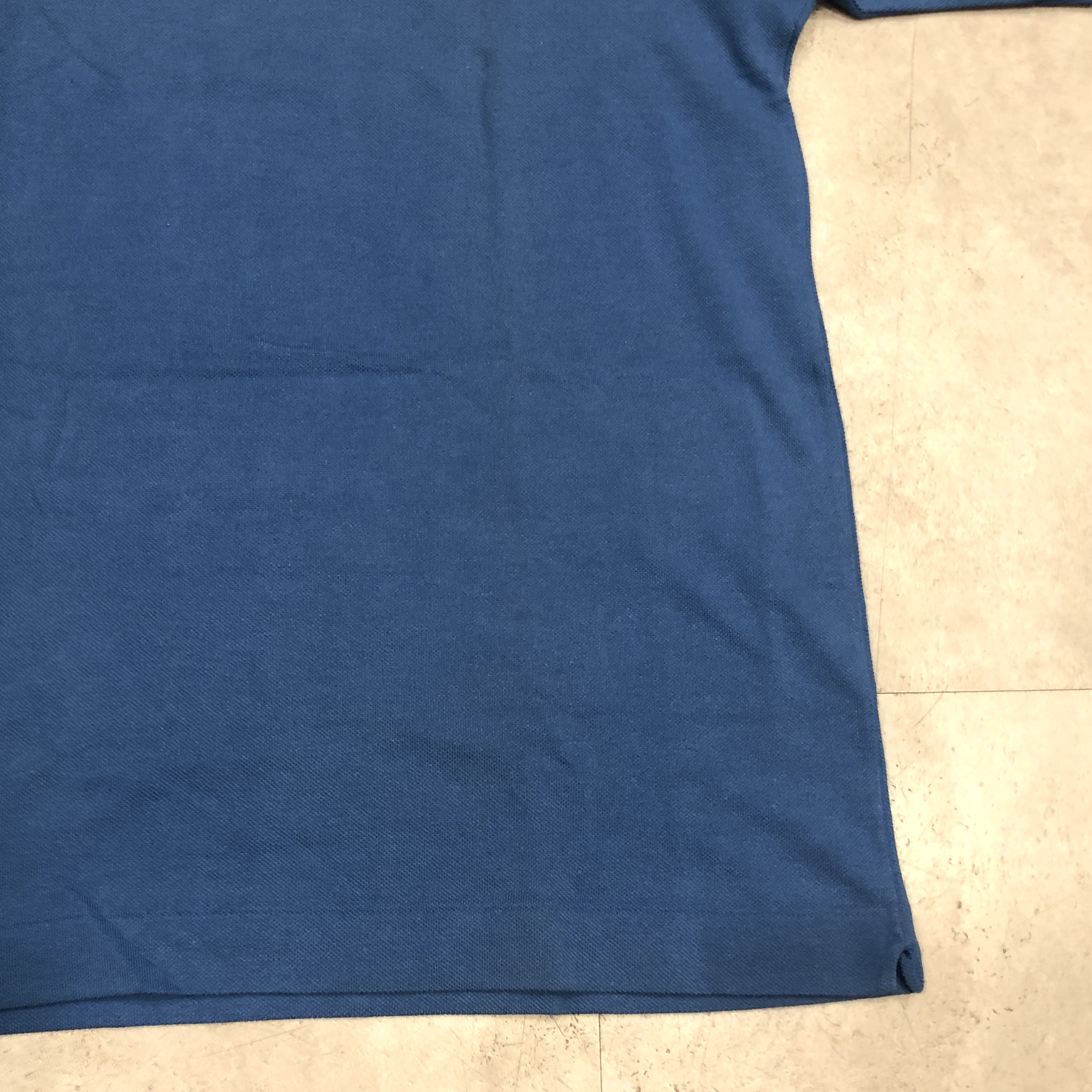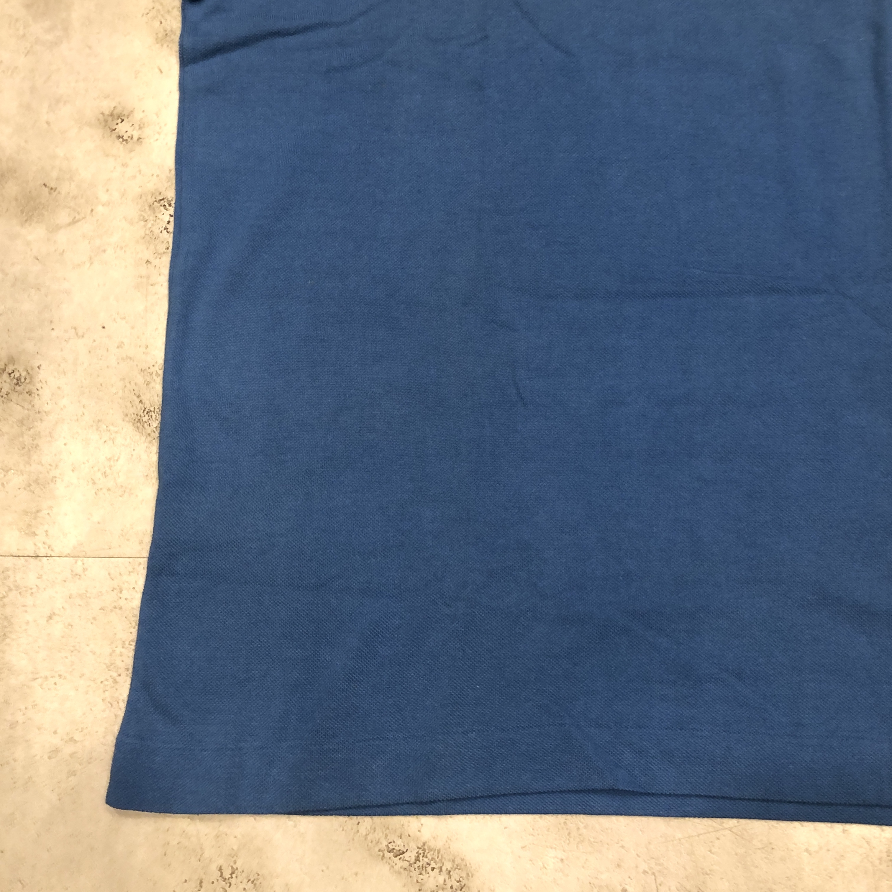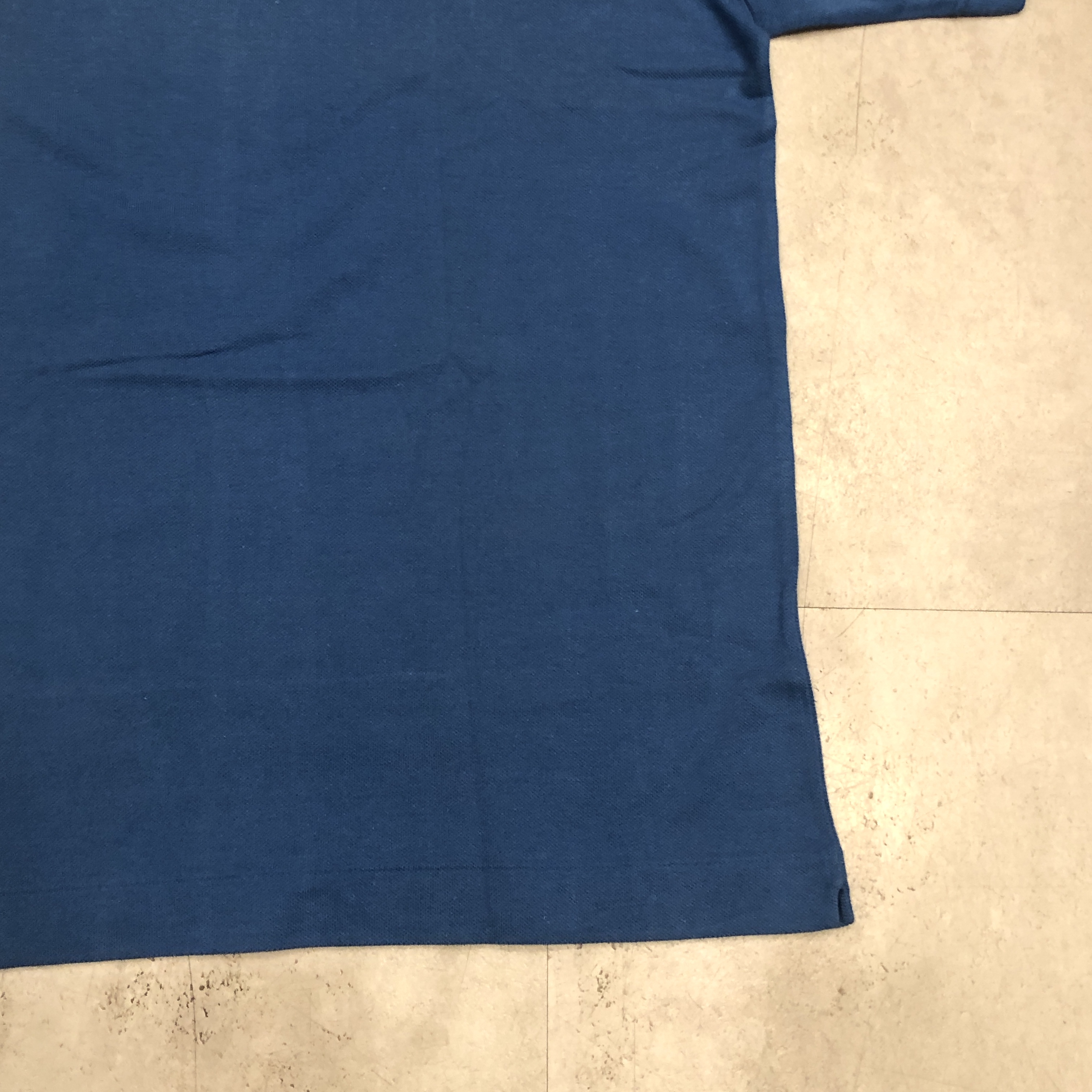 こちらはシックなブルーカラー、タグ表記“4”サイズの一着。ブランドのアイコンとも言えるワニのワッペンが胸元にしっかりと鎮座し、さりげなく存在感を放っています。
