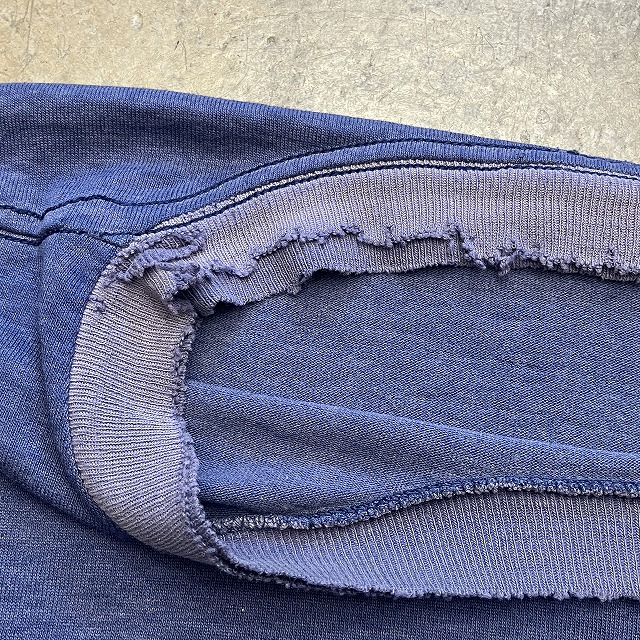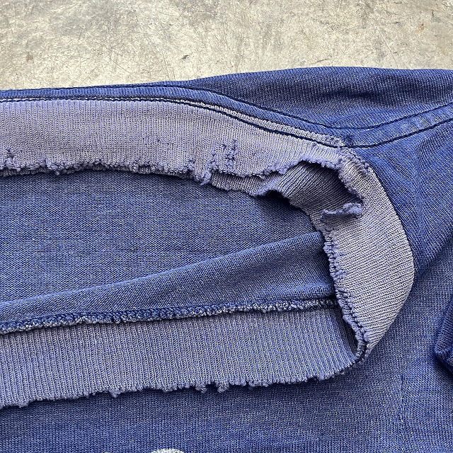 - 襟にダメージ、所々に小穴や、薄汚れがみられます。また、ボディ左袖付近にリペアがみられます。その他、スレ、アタリ等の年代相応の着用感がみられ、ユーズド慣れされた方や雰囲気重視の方におすすめの商品です。