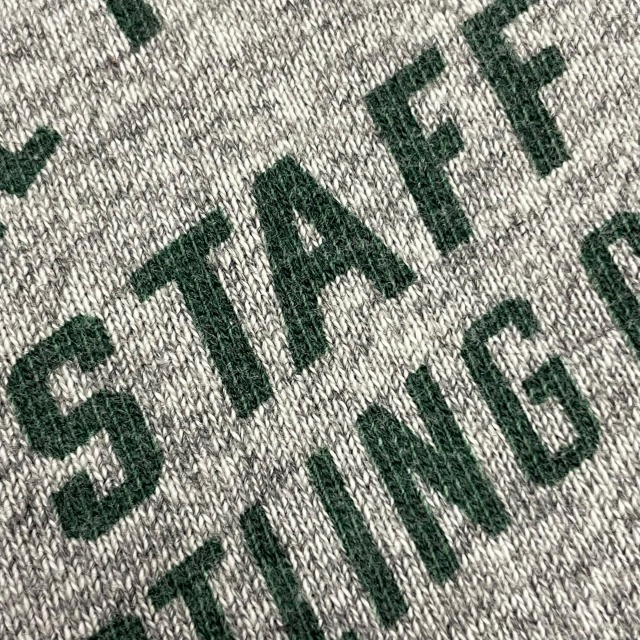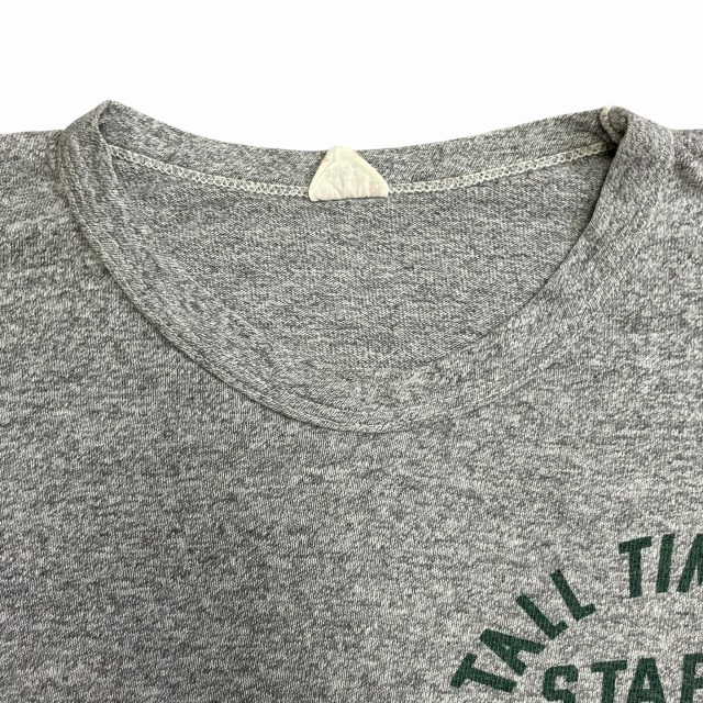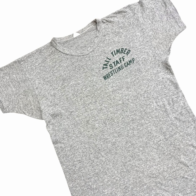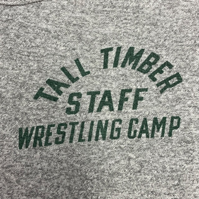 霜降りグレー×グリーン、染み込みプリント「TALL TIMBER STAFF WRESTLING CAMP」