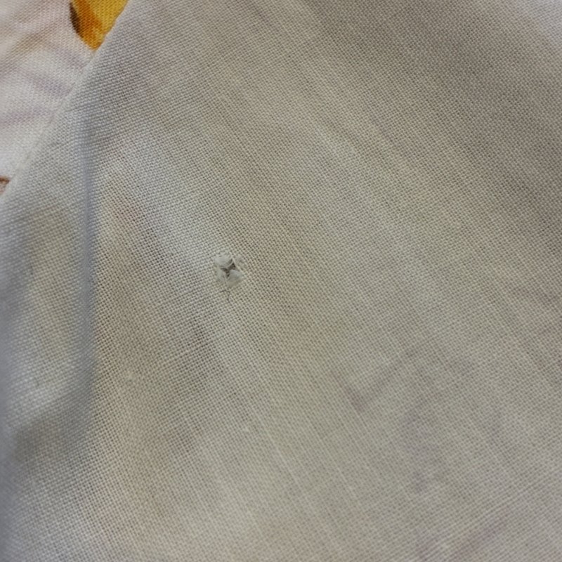 - 左袖に一箇所と前面左下辺りに二箇所、画像の様な小穴がございます。