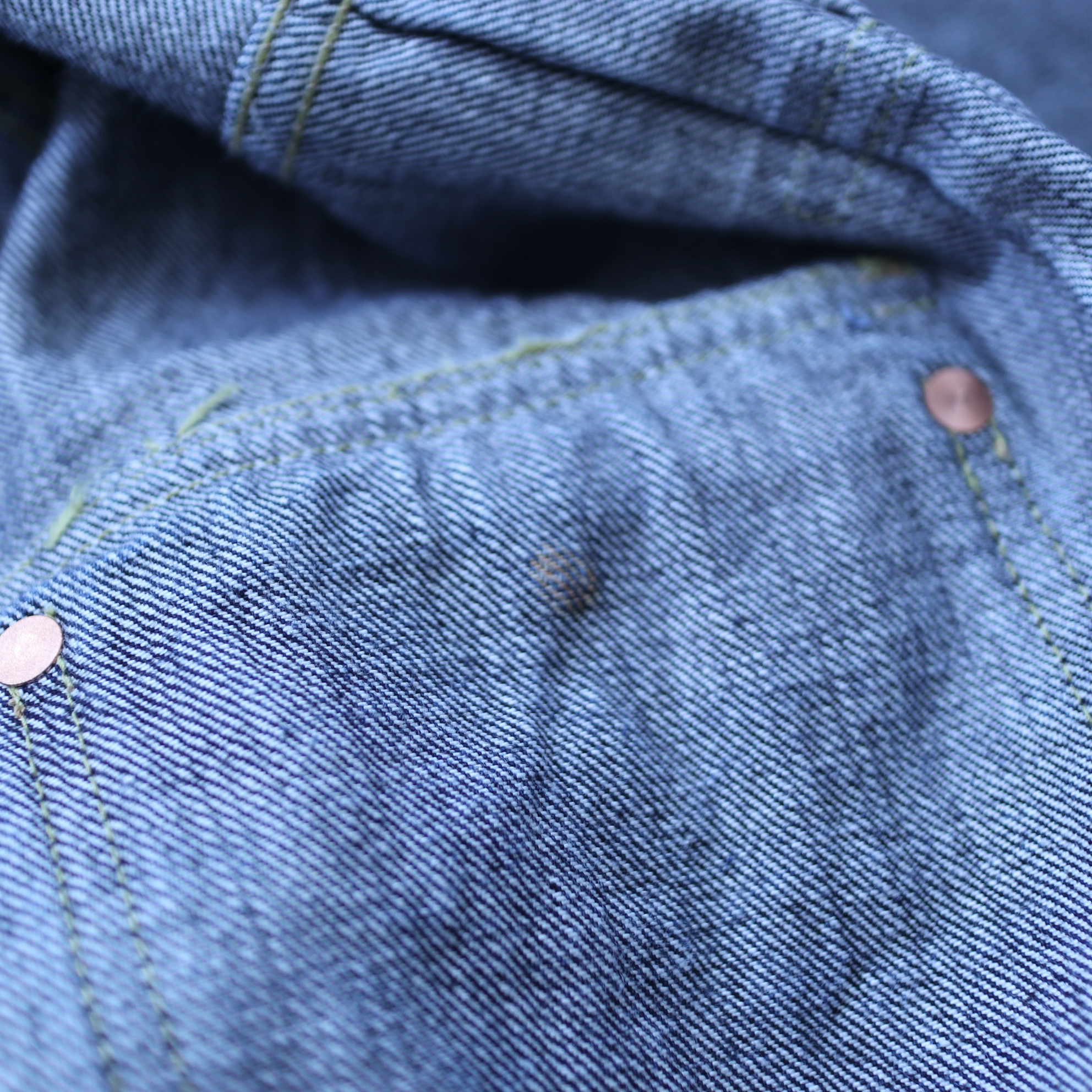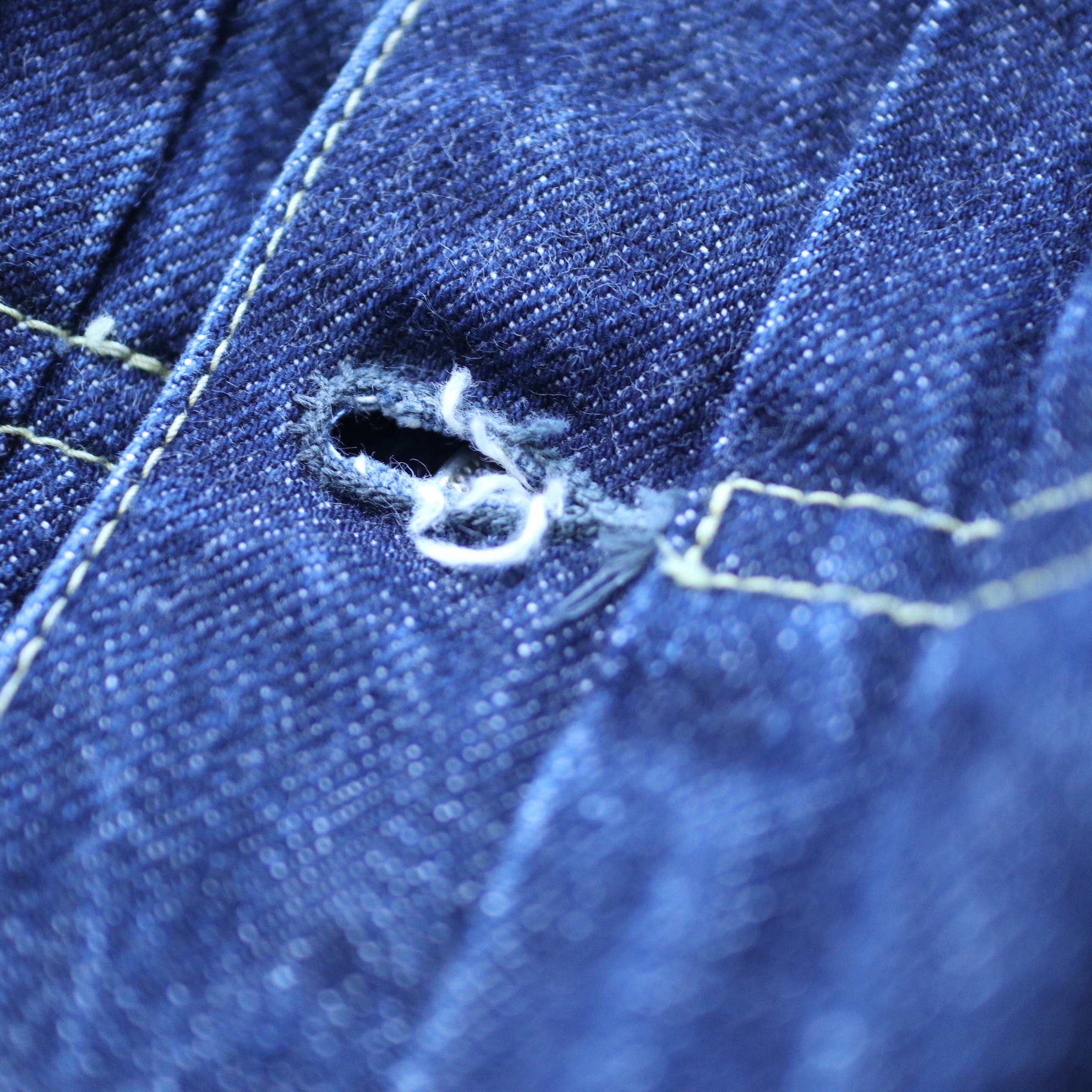 - 裏地にリベットの移染、ボタンホールにほつれがあります。