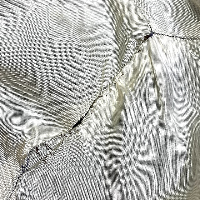- 画像のように、スレ、薄汚れ、小傷、毛羽立ちがあり、裏地の右アームホールに手縫いで簡易的なリペアがございます。