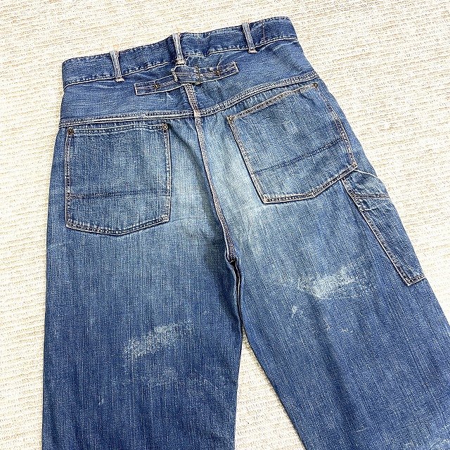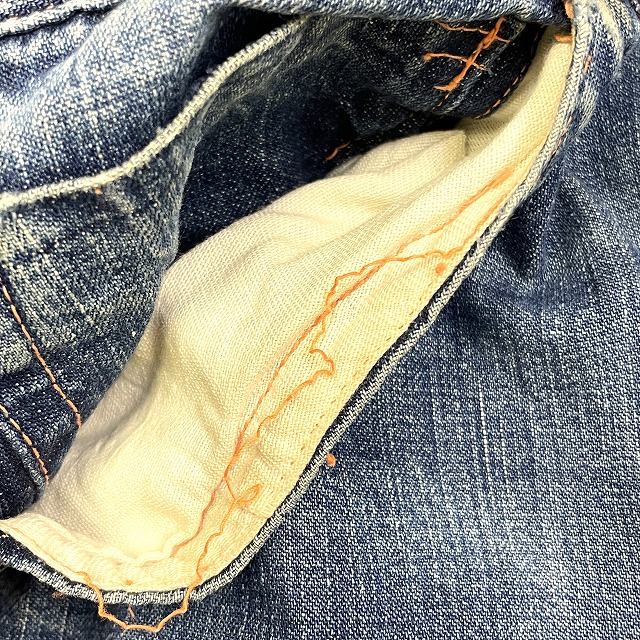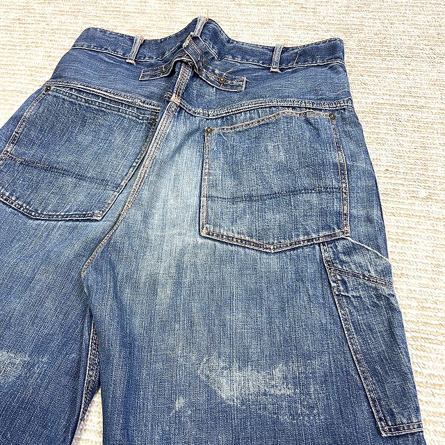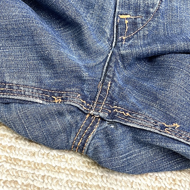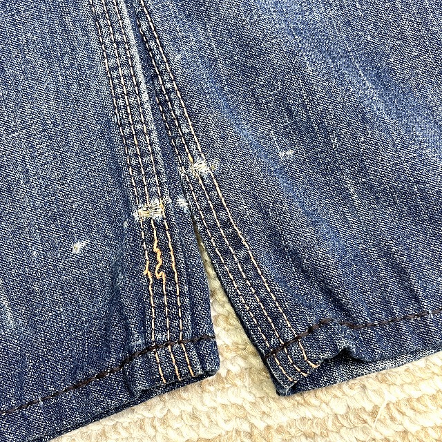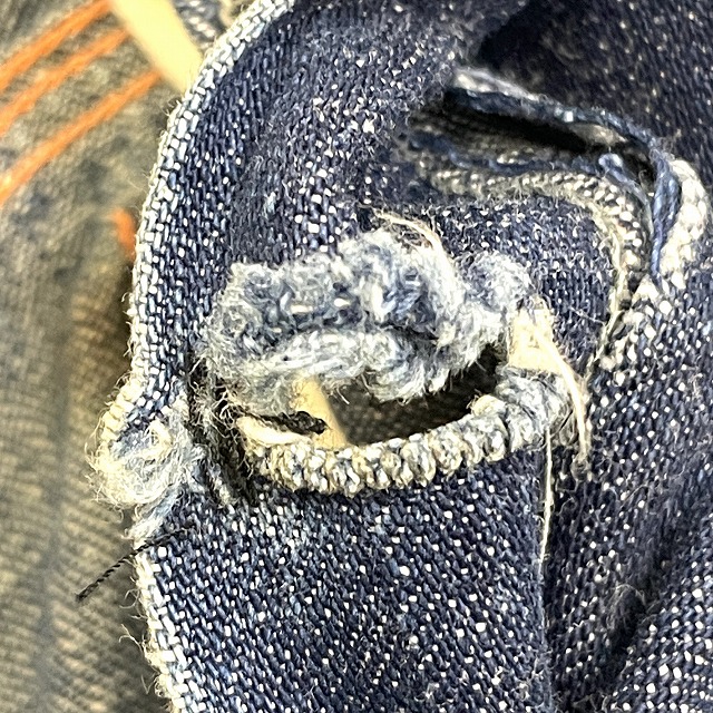 ボタンホール、ポケット、左膝付近にリペアがございます。