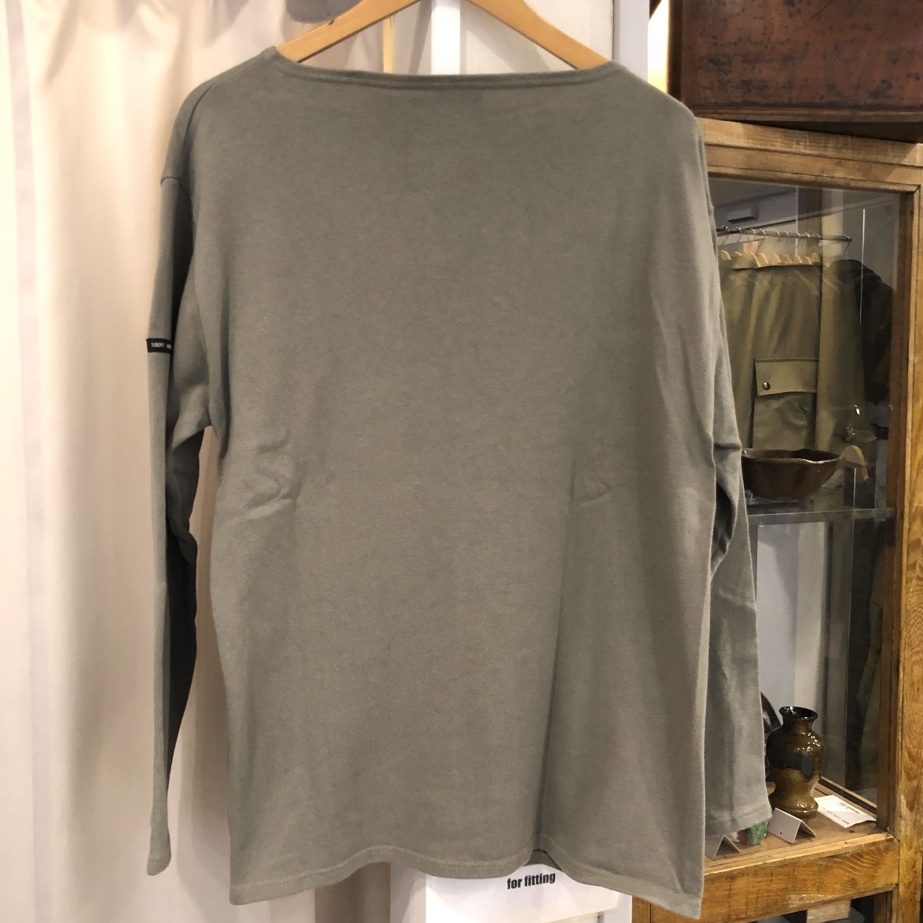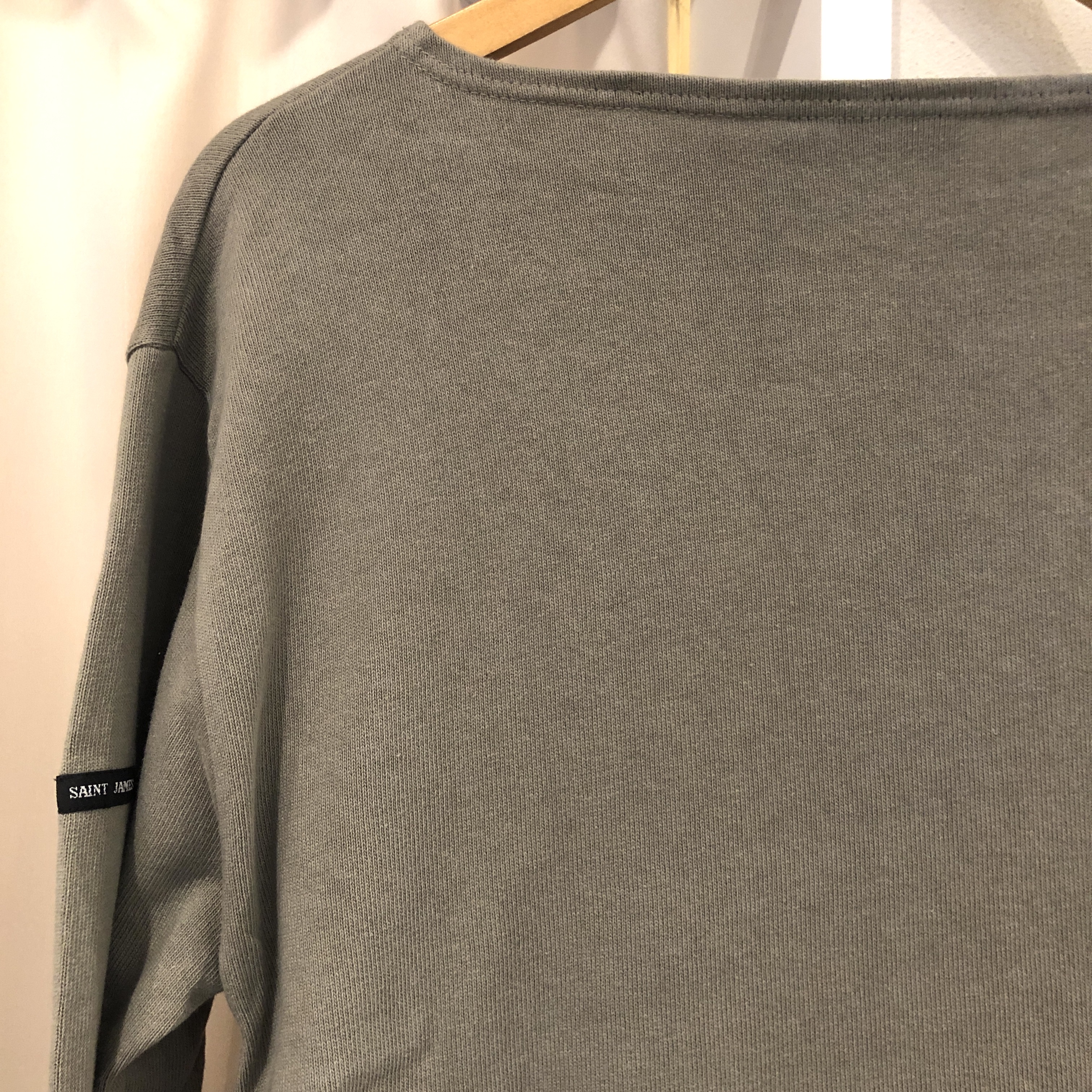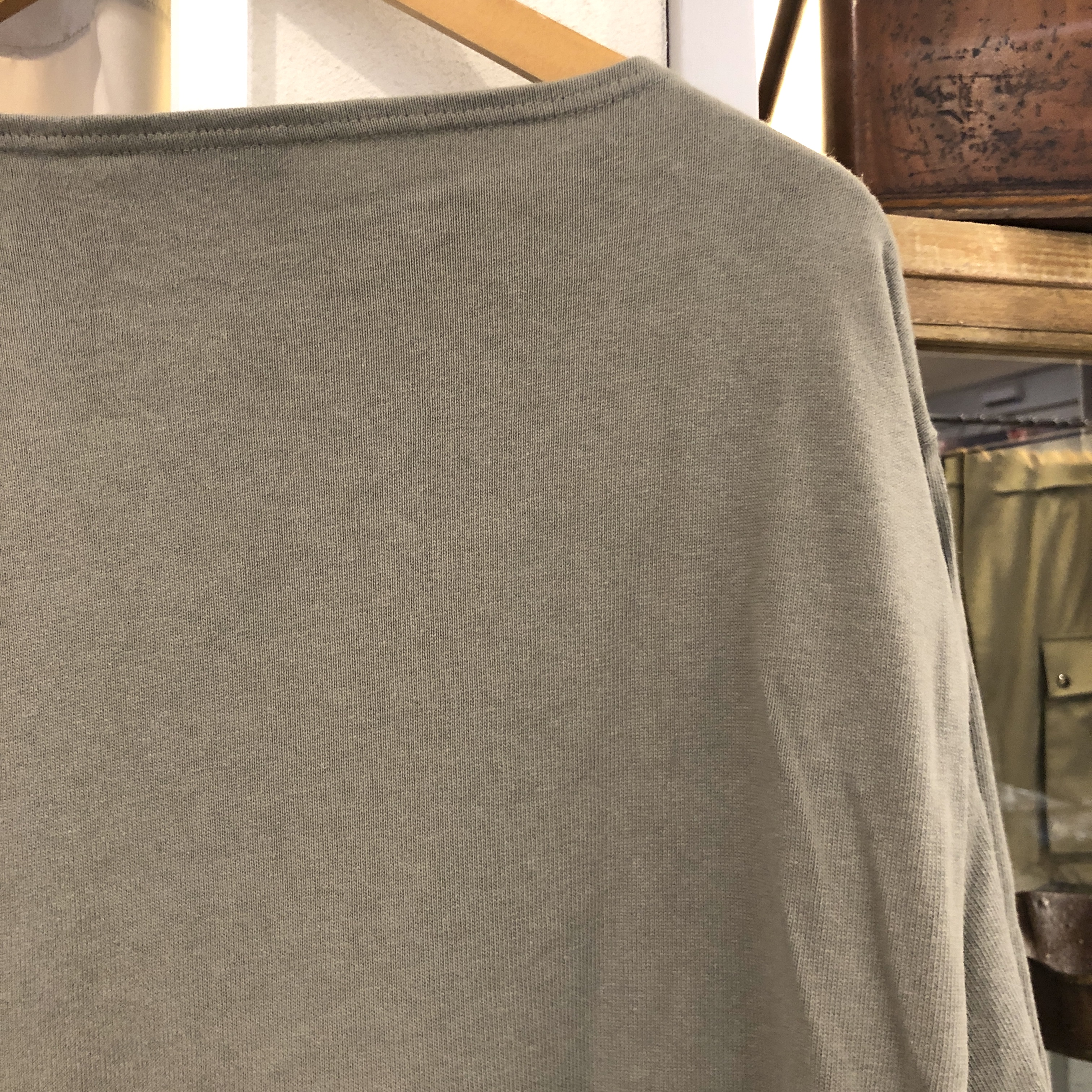 クラシックなボートネックと肩線の落ちたストレートなパターンは、重ね着にも最適。袖口にはブランドロゴのネームパッチを控えめに配置。製造はもちろんフランス自社工場で行われ、国内正規代理店(ウェッソン社)のタグ付き。サイズはフランス表記T5(国際サイズML)で、男女問わずゆとりあるシルエットを楽しめます。