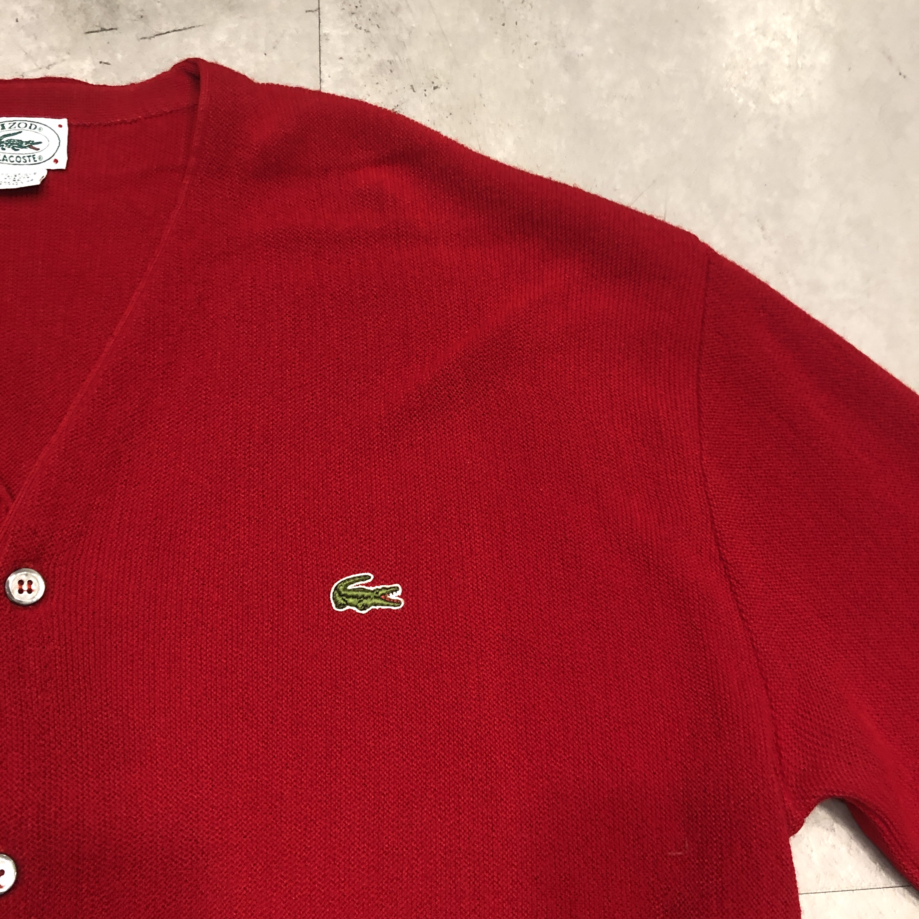 胸元に輝くワニのワンポイントと、潔いほど鮮烈なレッドのボディ。まさにアイビーリーガーの定番アイテムとして、50年代から80年代にかけて全米のキャンパスシーンを席巻した名作です。