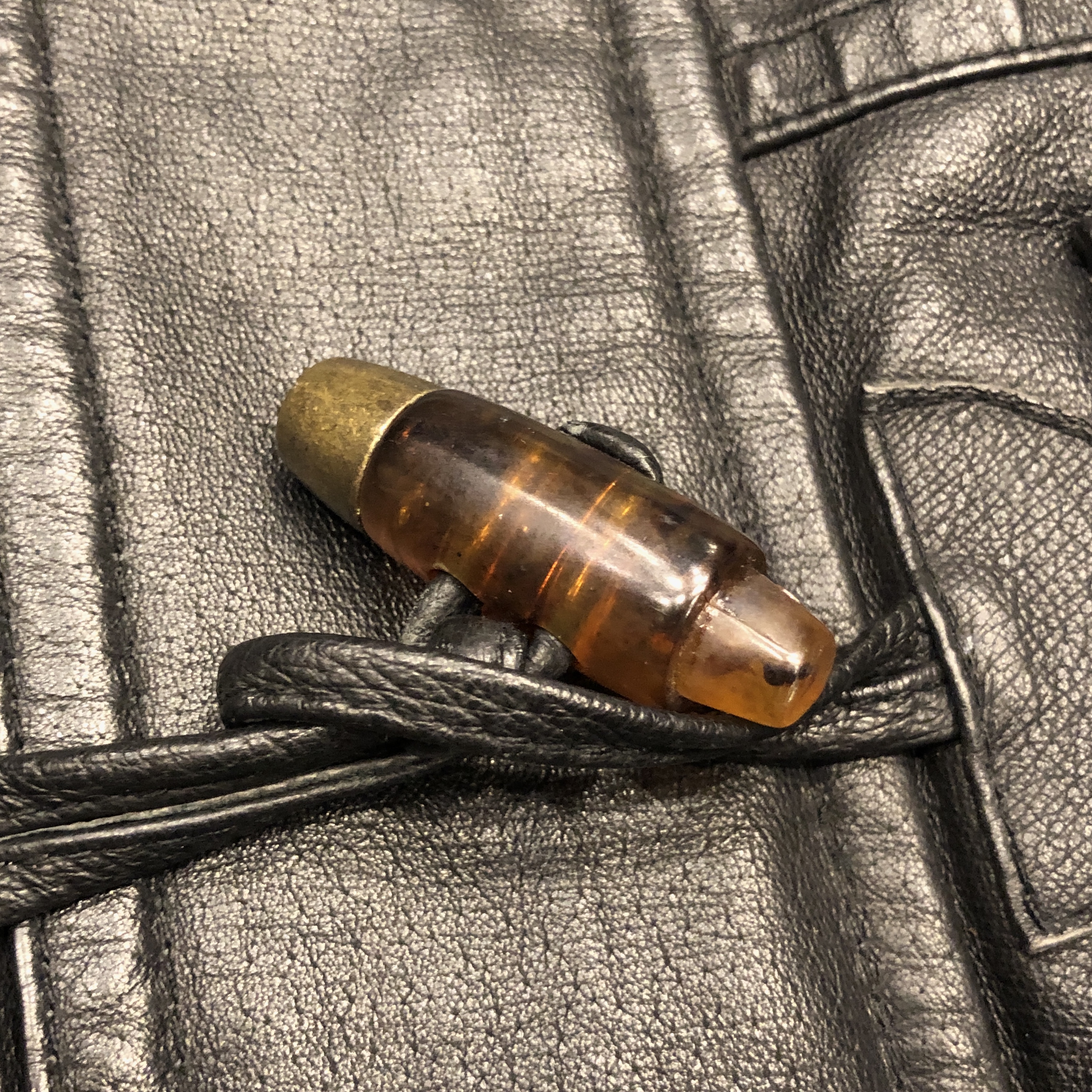 しなやかで重量感のある本革を贅沢に使用し、アクアスキュータムらしいクラブチェックの総裏地が映える逸品。特筆すべきは、トグル部分に配された琥珀を思わせる美しいパーツ。機能性を超えた装飾性が、クラシックなコートに独自の存在感を与えています。