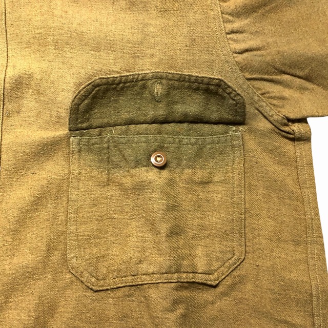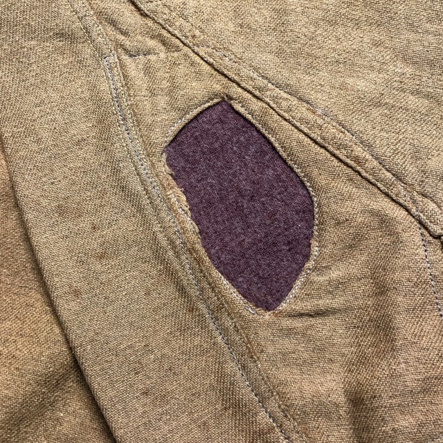 幅広の胸ポケット、襟裏、前立て裏には当て布付きです。
