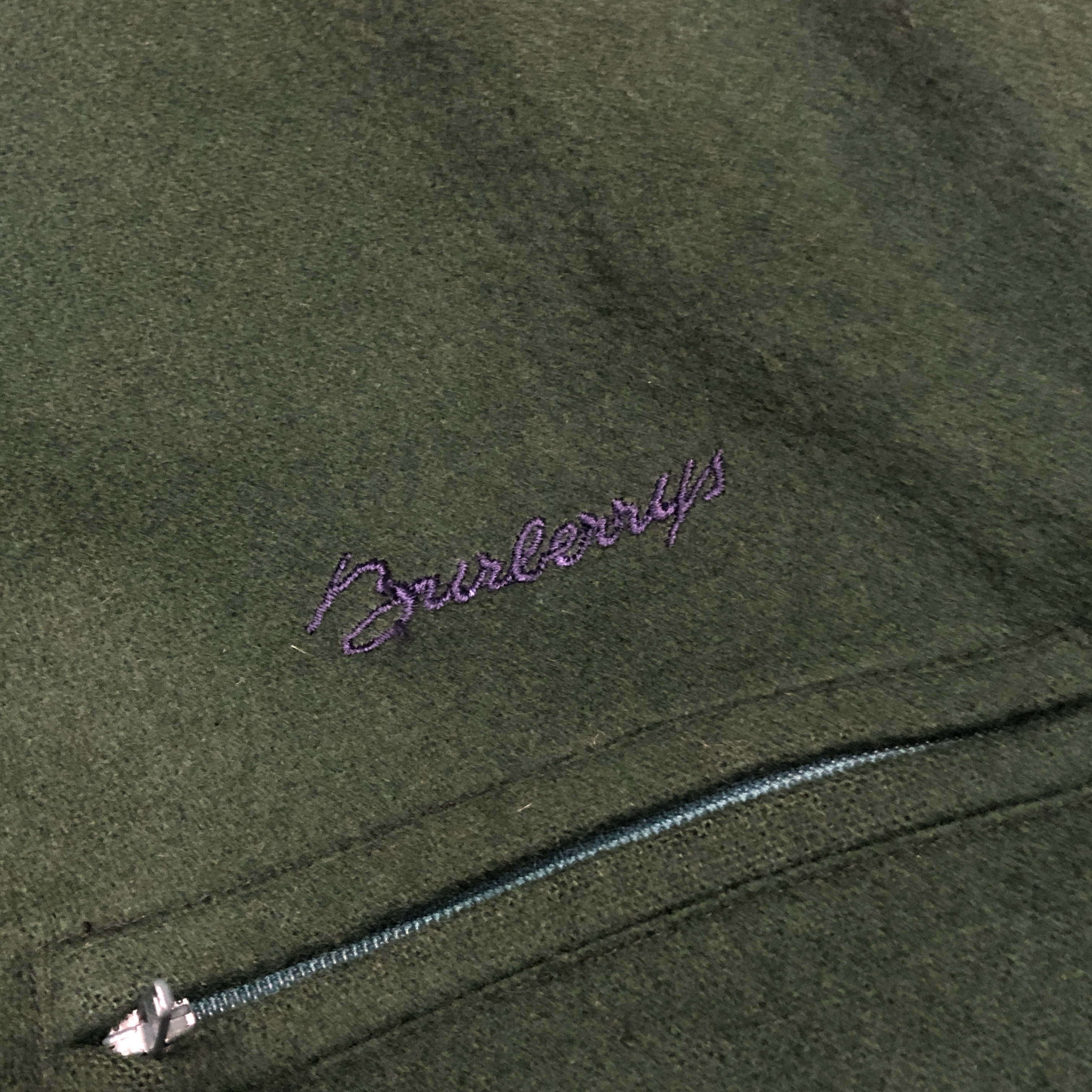 左胸にはBurberrysロゴの筆記体刺繍入り(パープルが渋いアクセント!)。裏地にはダークグリーンベースのタータンチェックを贅沢に使用し、クラシックと遊び心が共存しています。