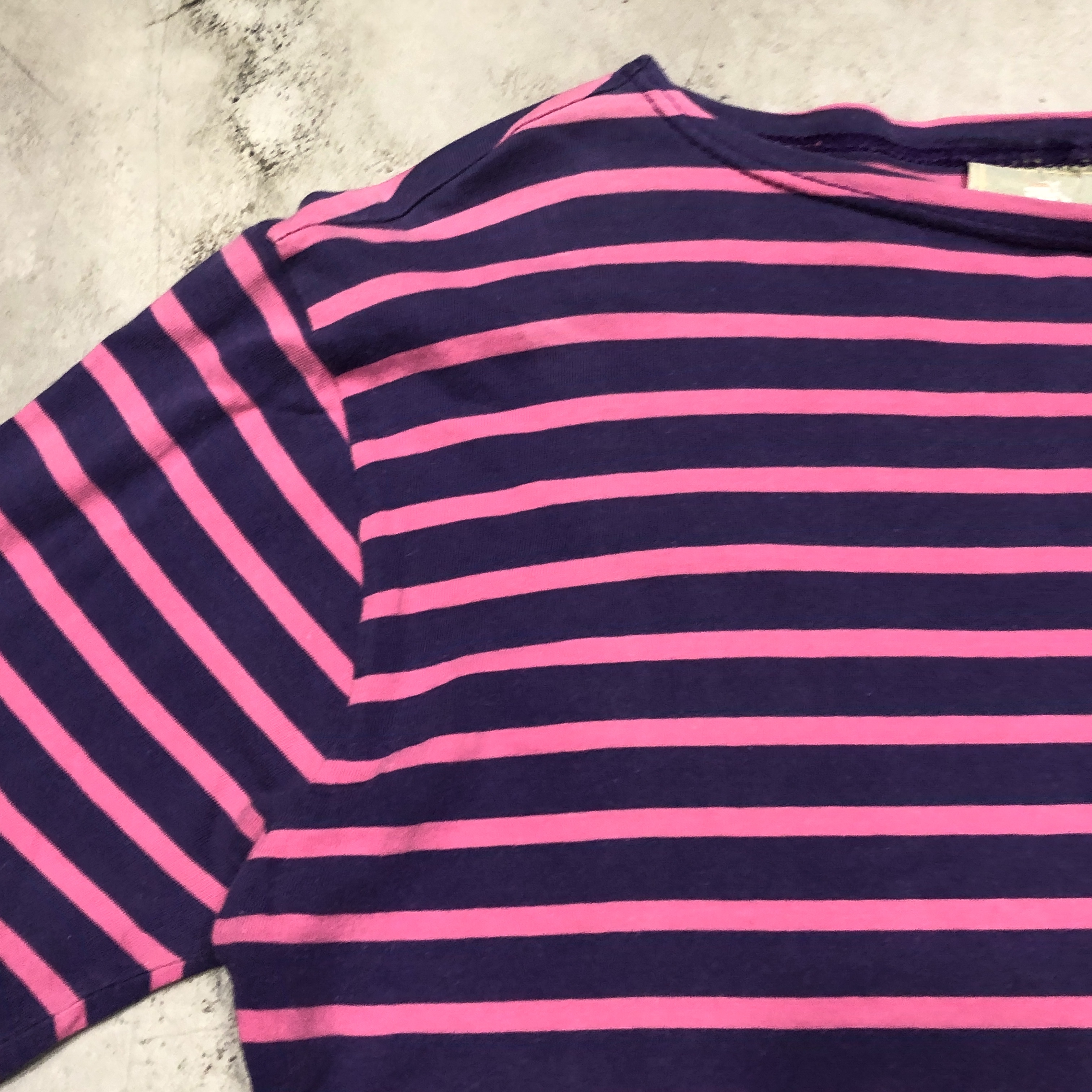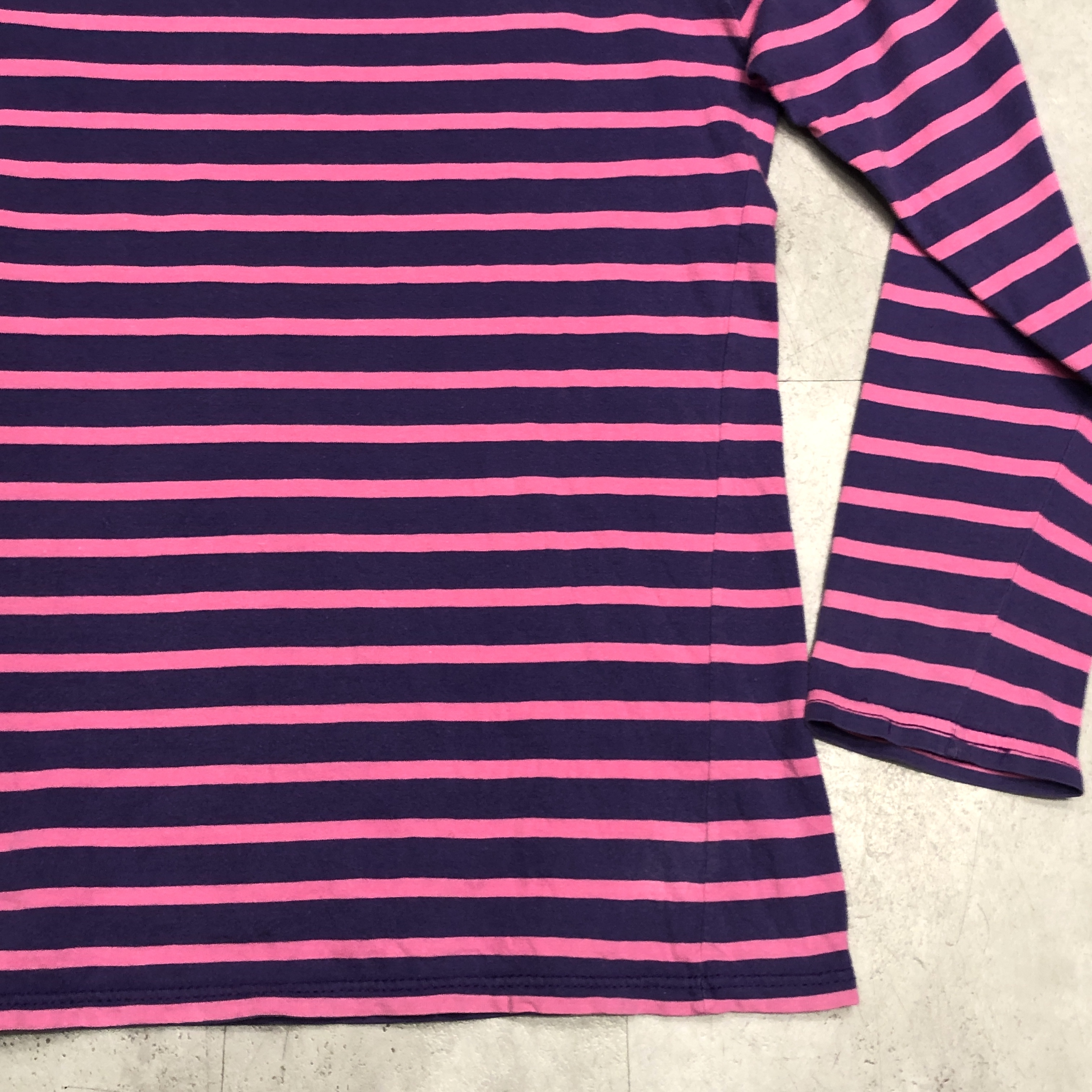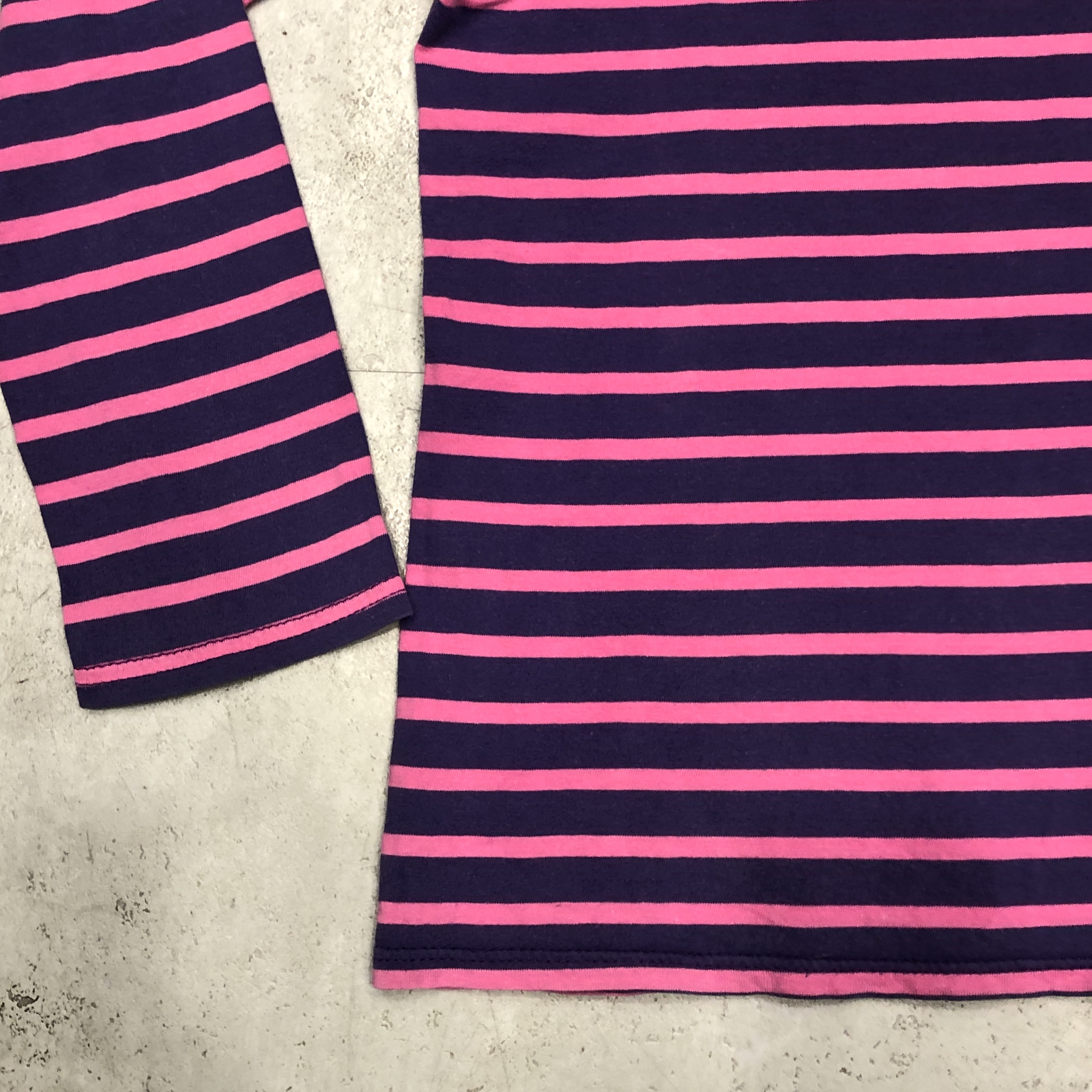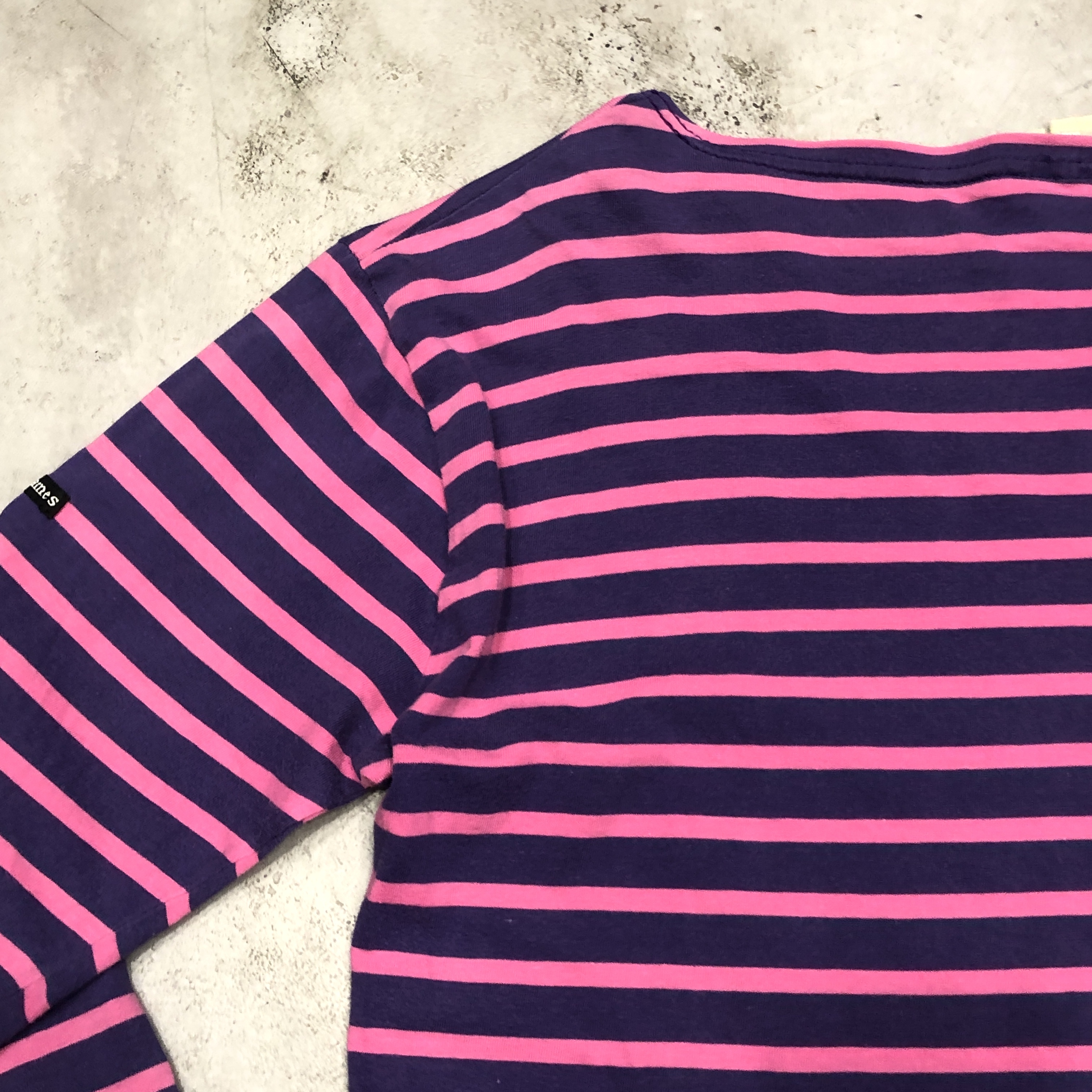 ボートネックにフレンチらしい軽やかなコットン地、ピンク×パープルのバスクボーダー配色は、やや細めピッチで洗練された印象。