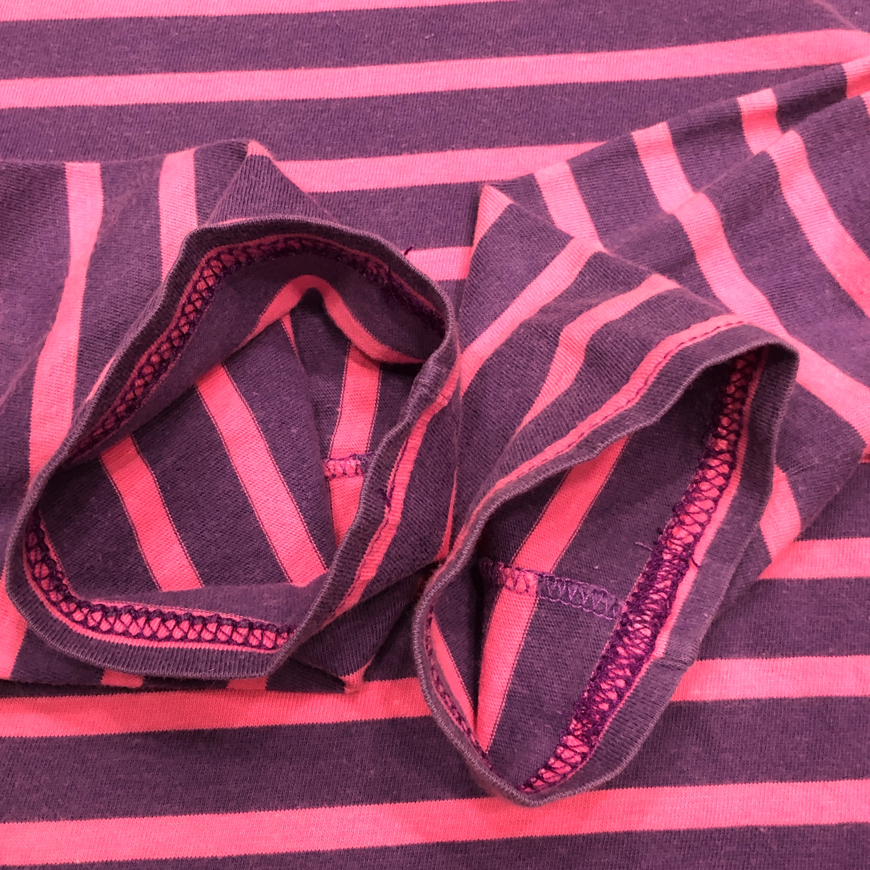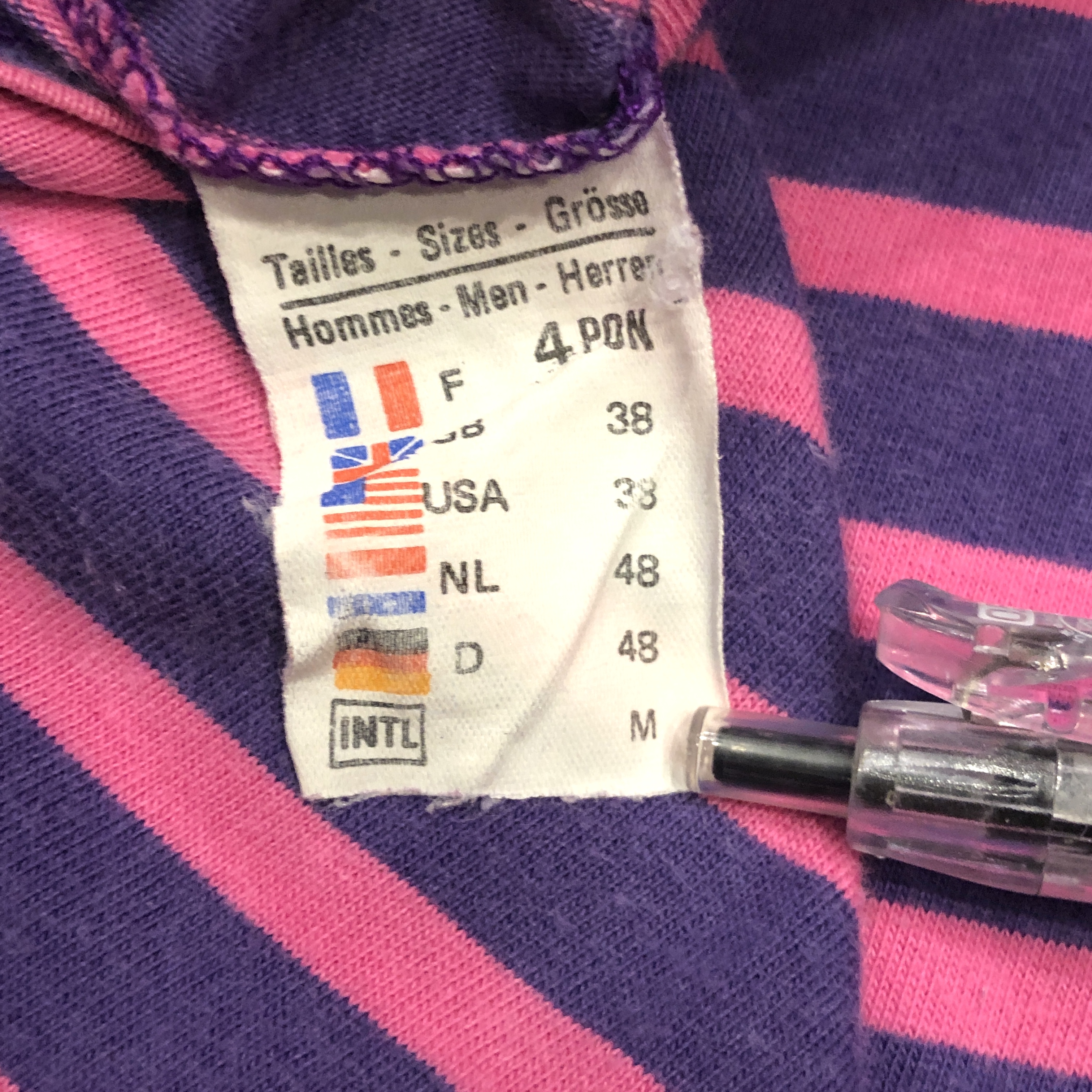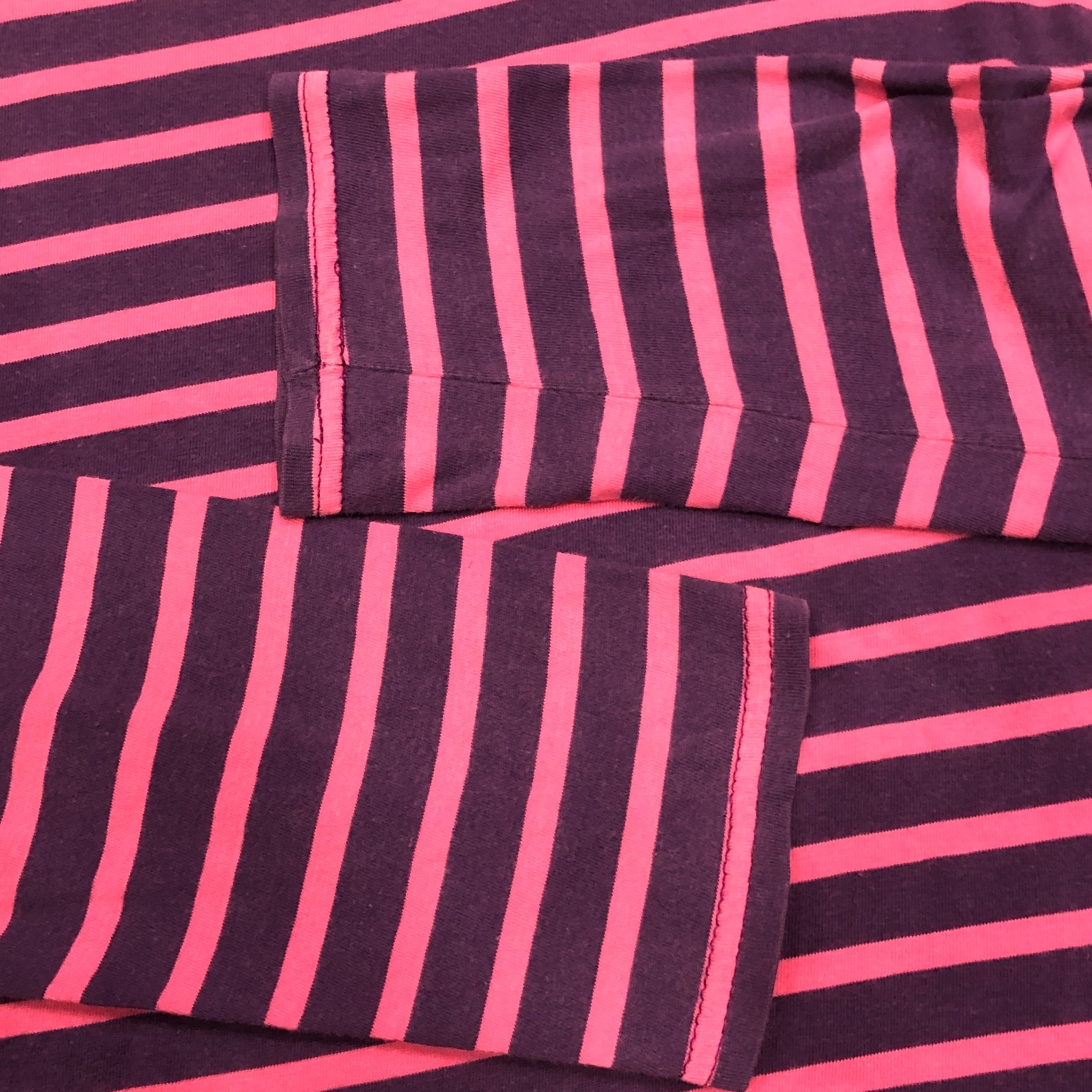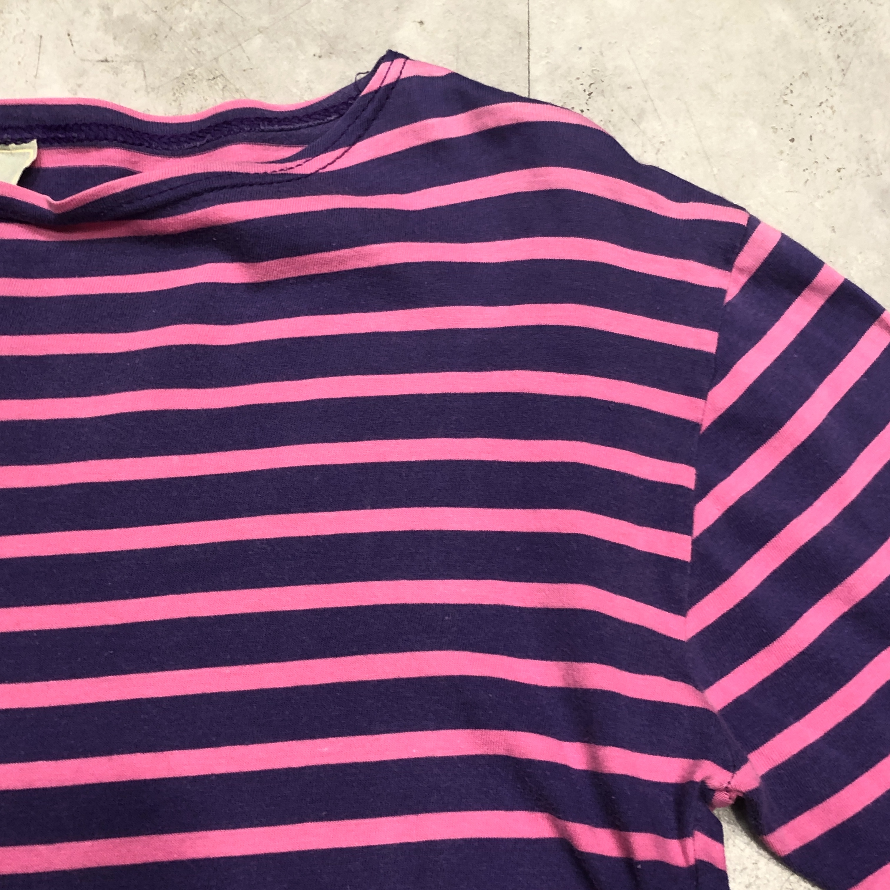 ボートネックにフレンチらしい軽やかなコットン地、ピンク×パープルのバスクボーダー配色は、やや細めピッチで洗練された印象。