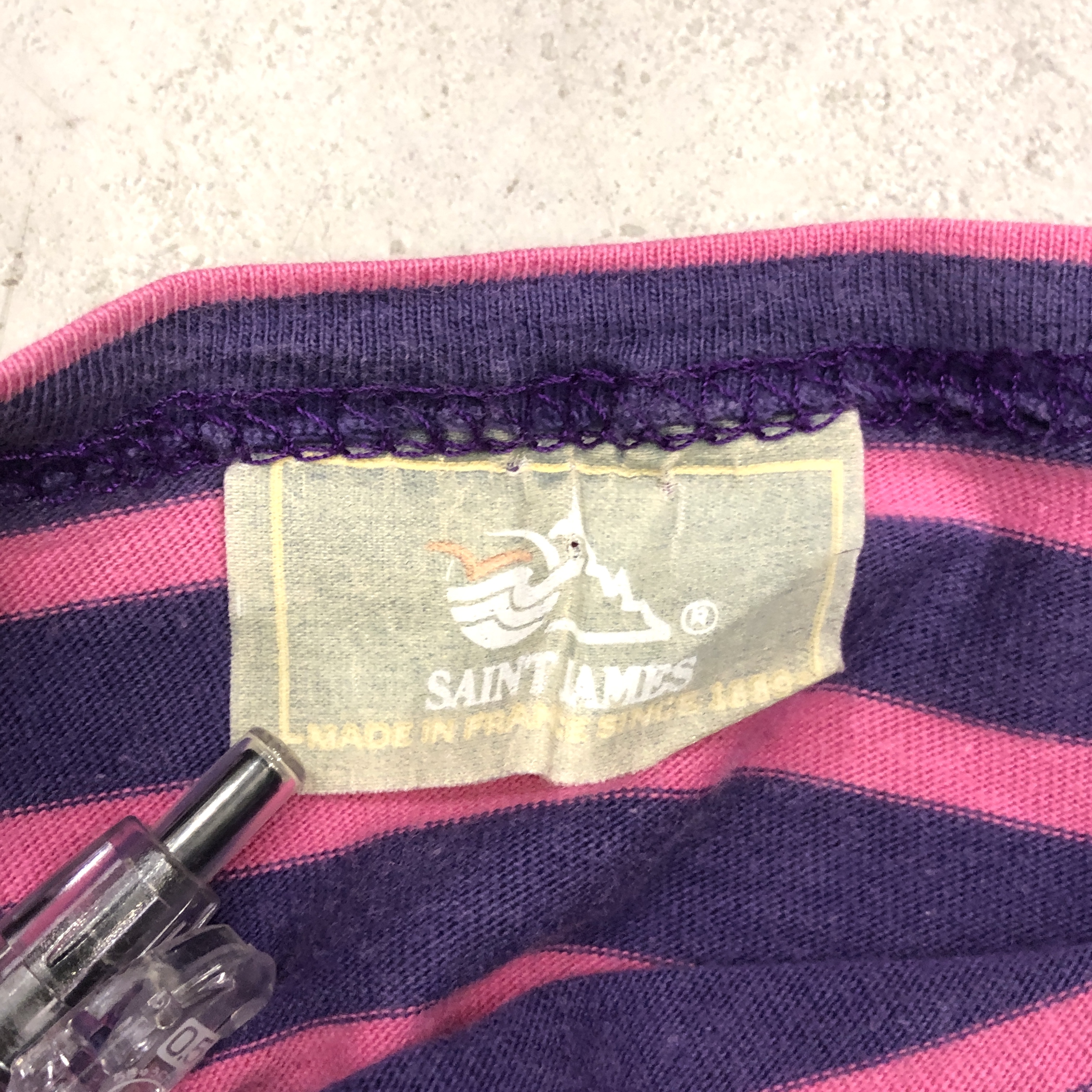 注目すべきは、旧ロゴタグ。現行モデルとは異なる、1980年代特有のグラフィックで、セントジェームス黎明期を象徴するディテール。