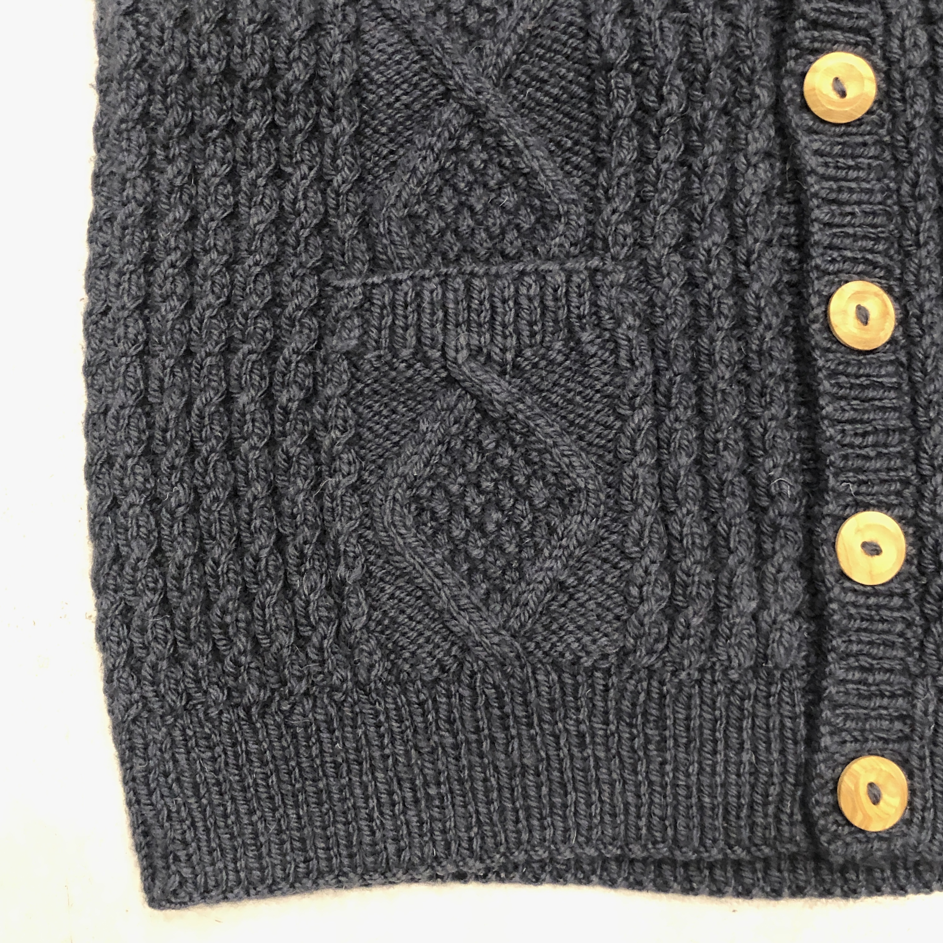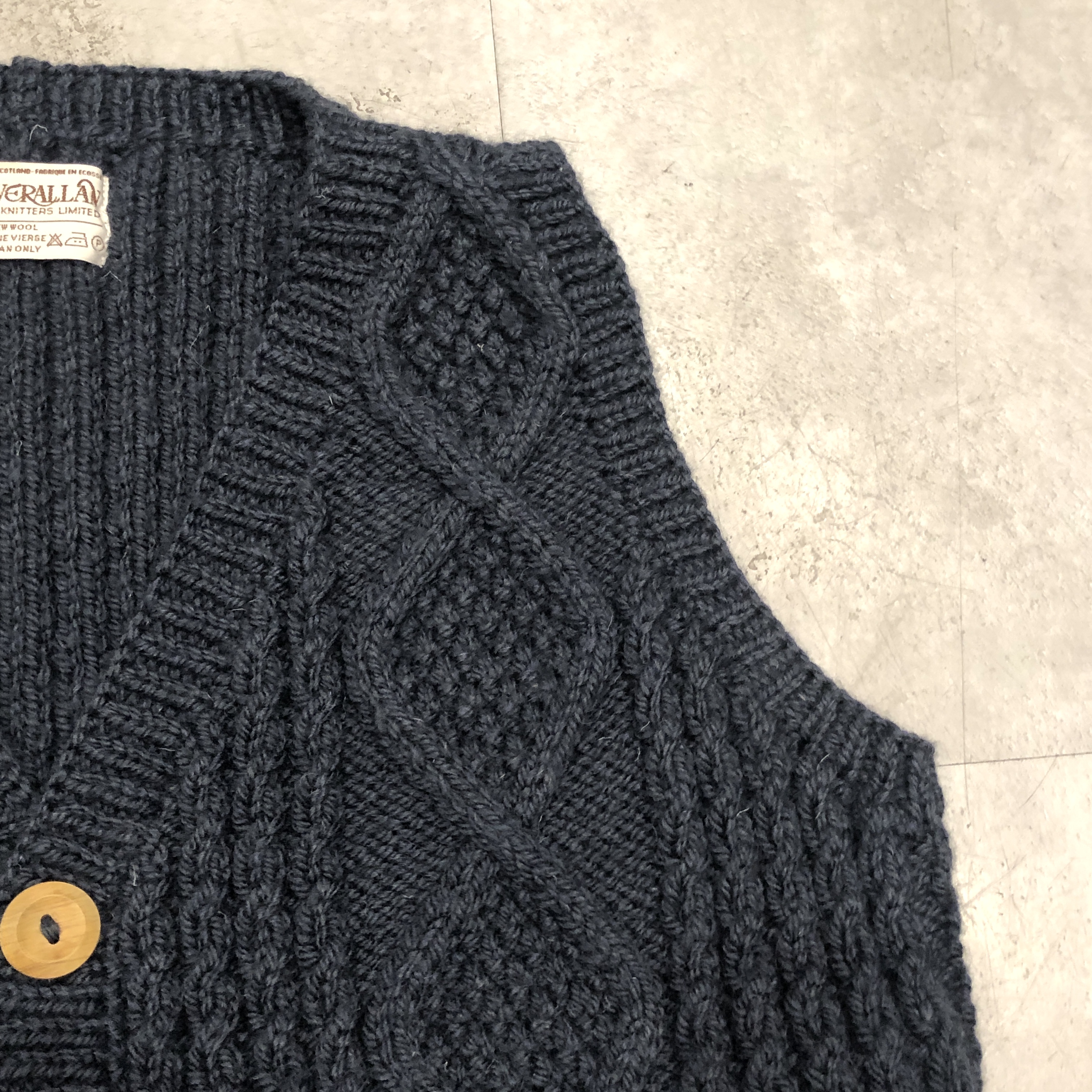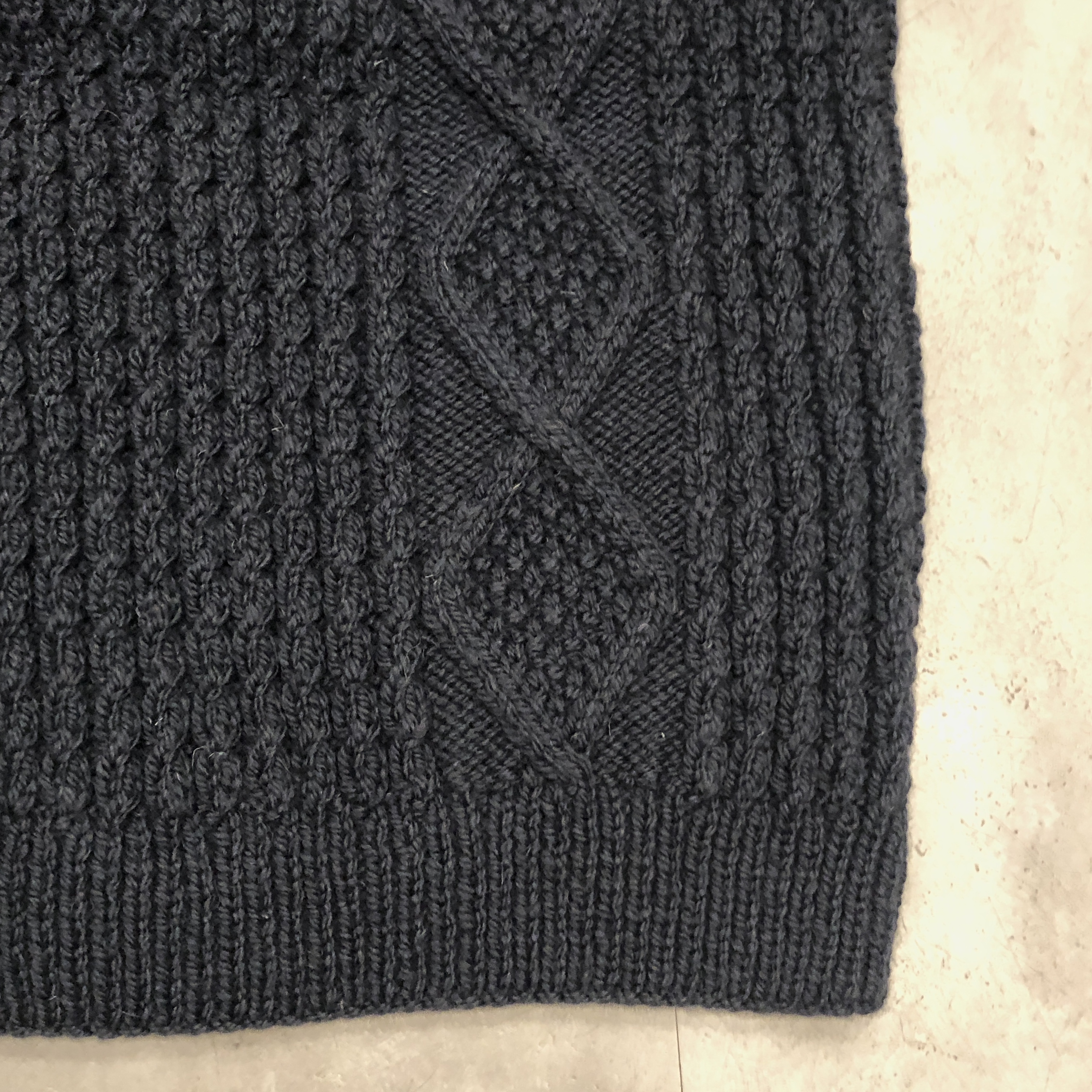 伝統的なアラン編みのパターンを余すところなく配し、深みのあるネイビーカラーは、ジーンズやチノはもちろん、ホワイトデニムやミリタリーパンツにも好相性。ハンドニット特有のふっくらとした編み目は、着るほどに体に馴染み、長年の愛用でさらに味わいを増していきます。